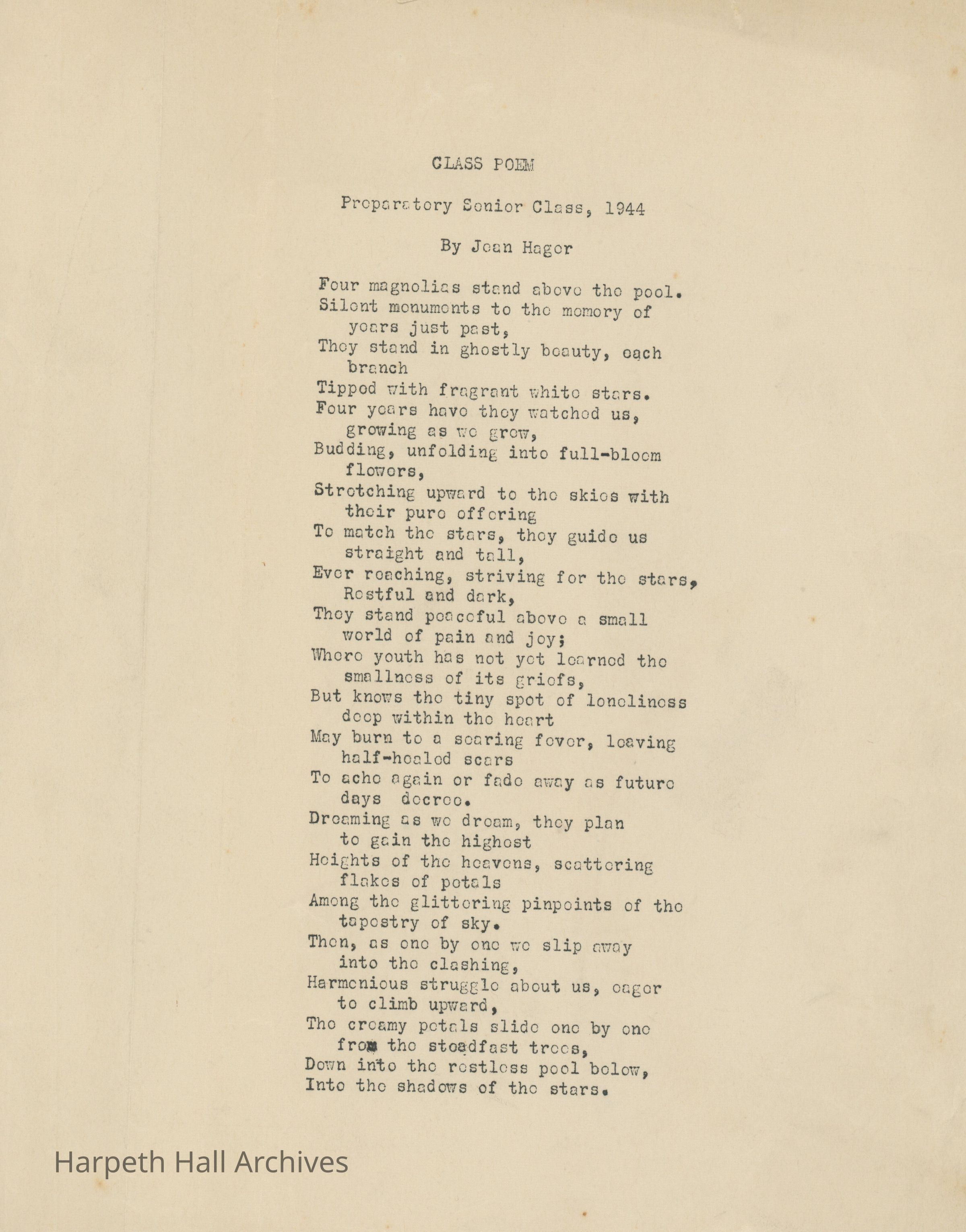 A class poem for the Senior Preparatory Class of 1944 by Joan Hager.