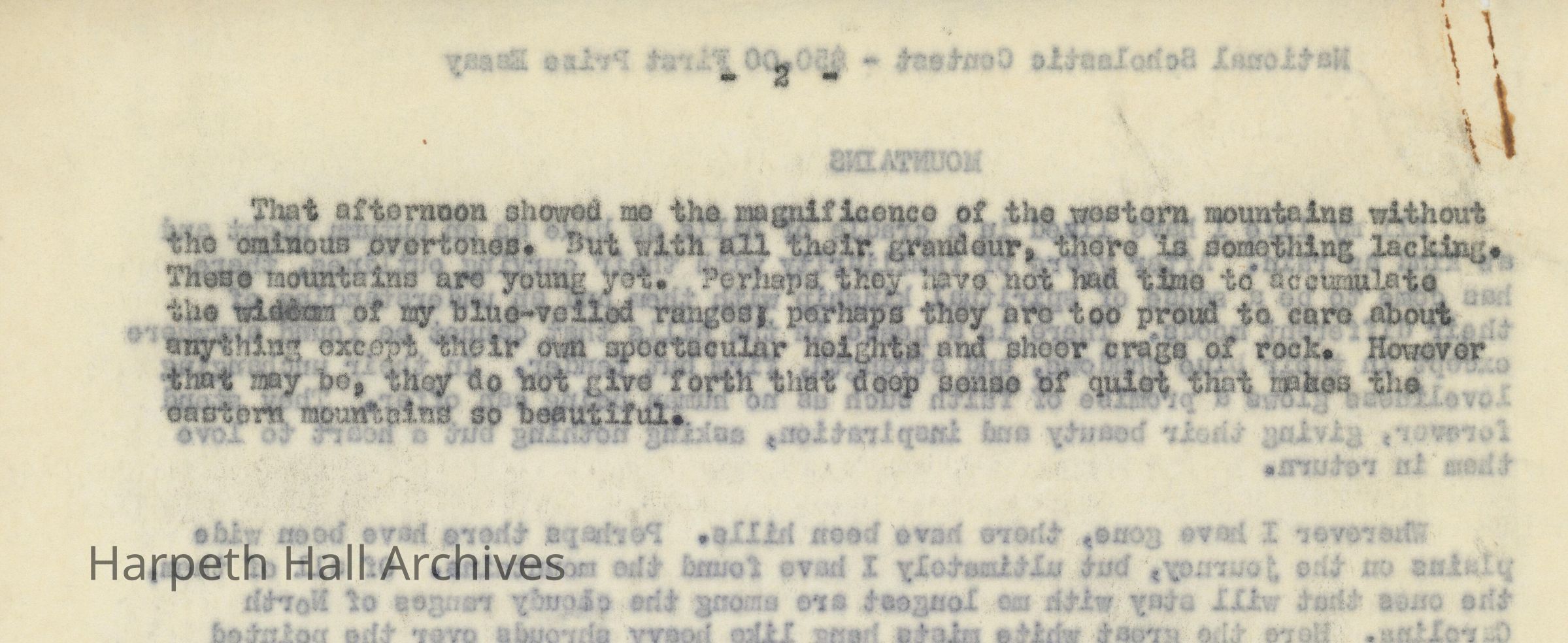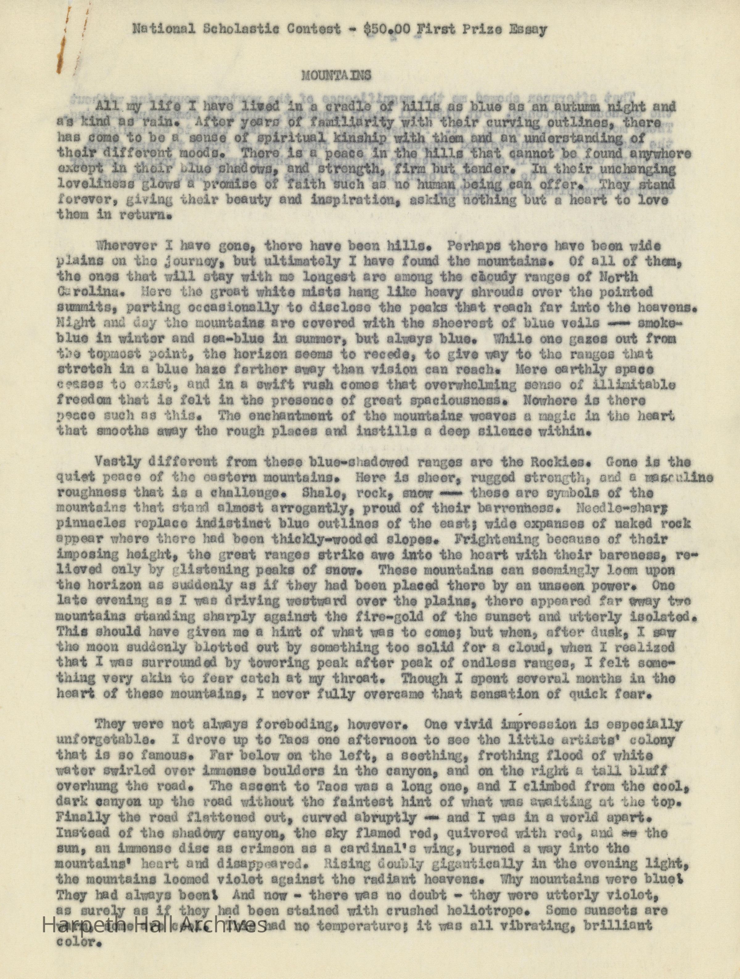 An essay entitled, "Mountains" that won the first prize in the National Scholastic Contest.Collection