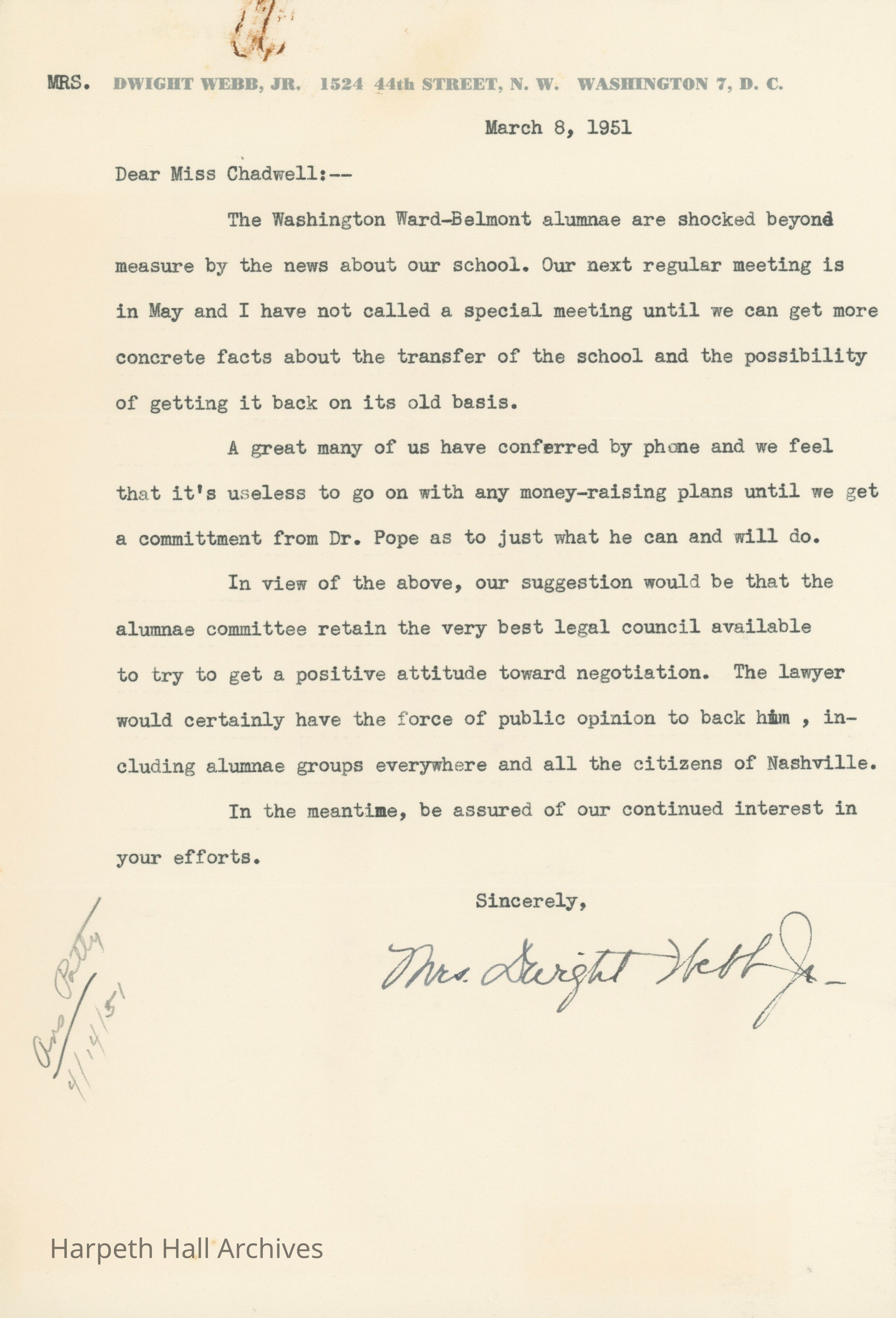 Letter to Patty Chadwell from Mrs. Dwight Webb on behalf of the Washington, D.C. Ward-Belmont alumni. The D.C. alumni recommend keeping a strong legal council in mind so that they can have the best chances when it comes to negotiating with the Baptists over the ownership of the school.Collection