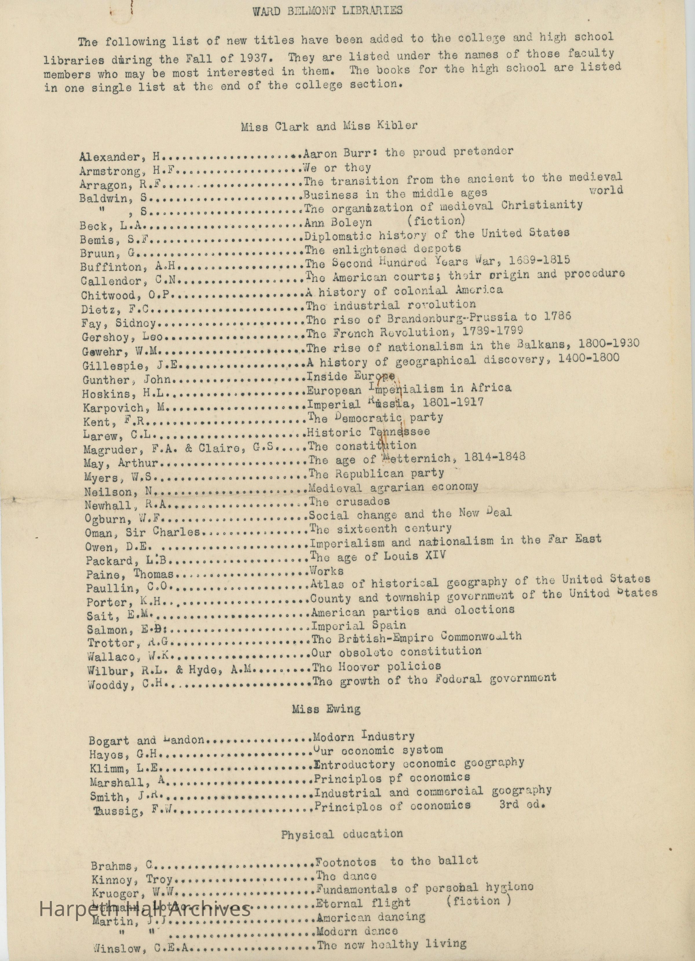 Ward Belmont Libraries Fall 1937Entry/Object ID