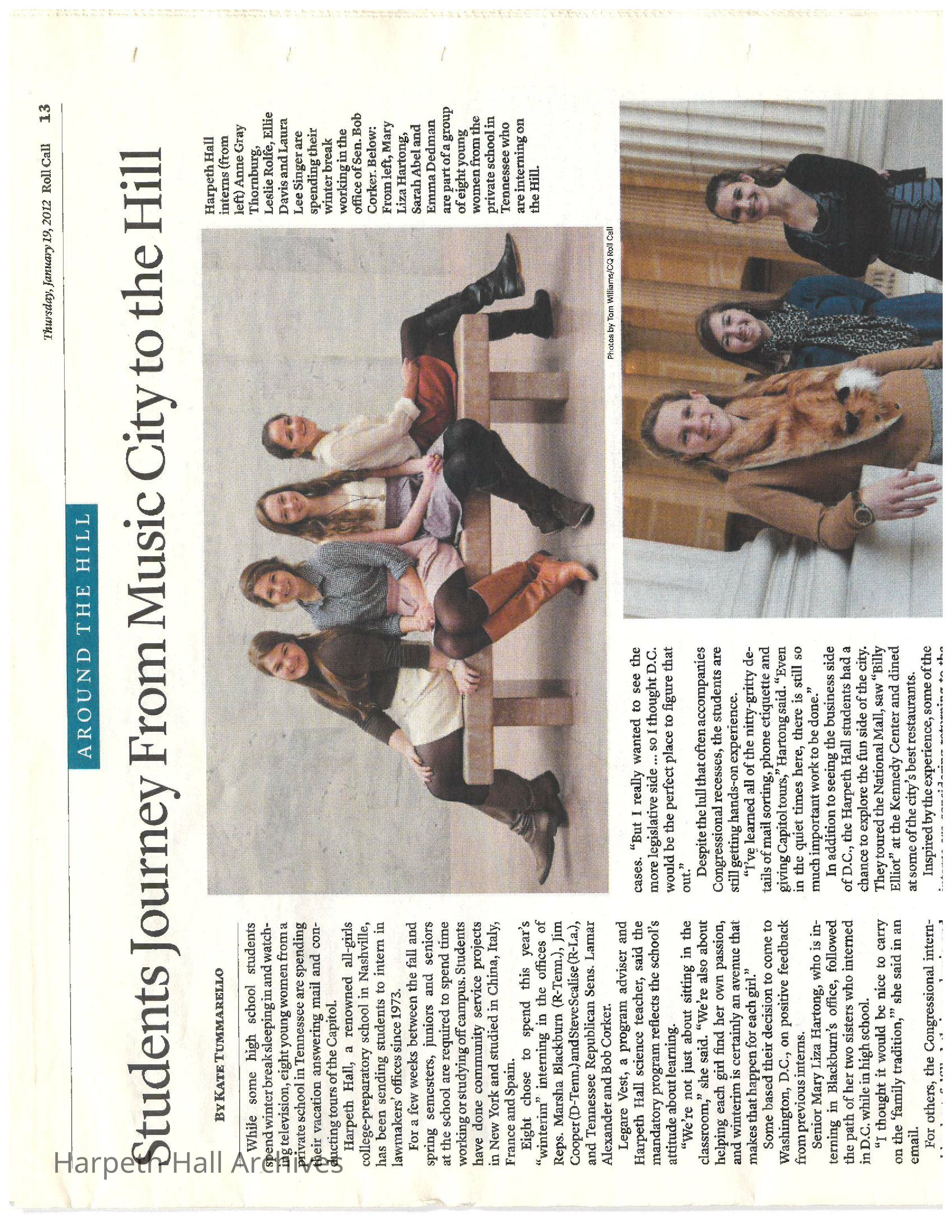 Roll Call (publication) dated Thursday, January 19, 2012, featuring an article about Winterim interns on Capitol Hill (Anne Gray Thornburg, Leslie Rolfe, Ellie Davis, Laura Lee Singer, Mary Liza Hartong, Sarah Abel, and Emma Dedman)Collection