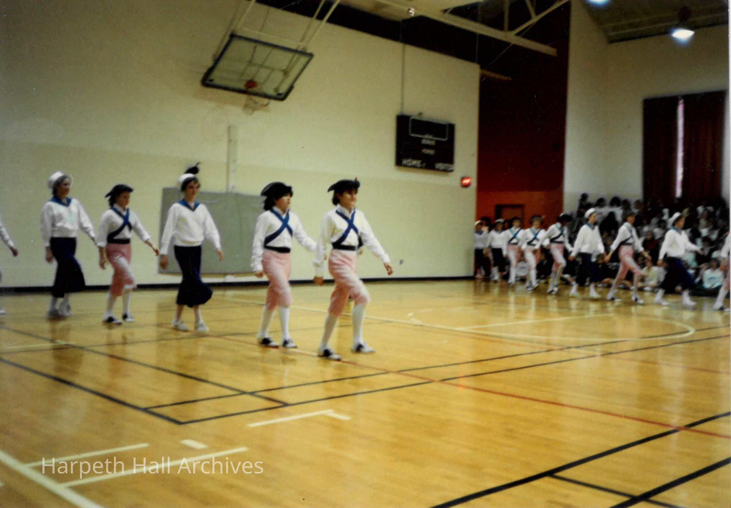 A group of seventh grade students performing as soldiers and sailors in the George Washington Day Celebration. The photo is taken in the Morrison Gym in the McMurry Center.Context