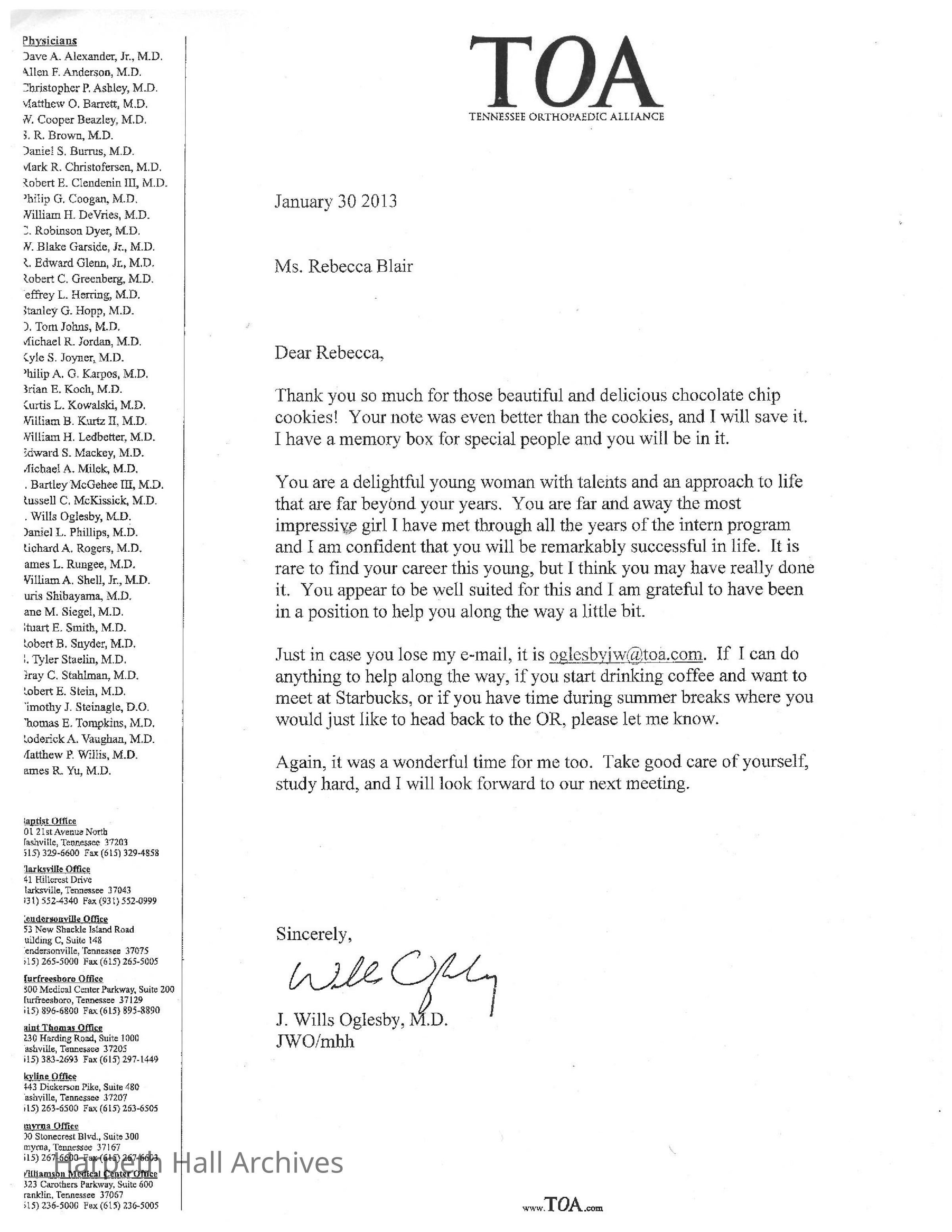 Personal letter from Tennessee Orthopaedic Alliance, J Wills Oglesby, M.D. dated January 20, 2013 to Rebecca Blair ('14) about her internship during Winterim 2013.Collection