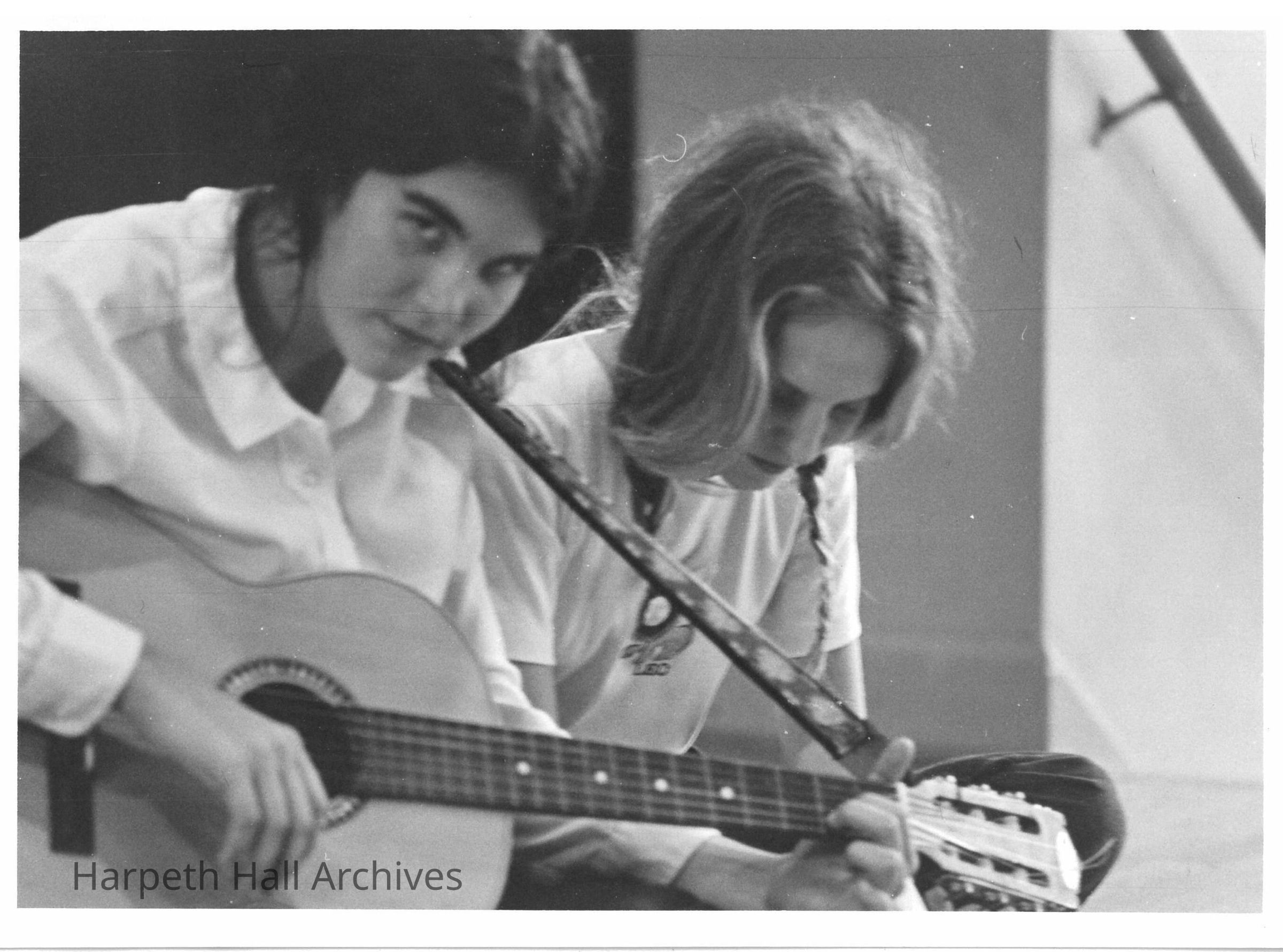 Susie Peebles with guitar and Lynn Comer Doramus, class of 1972Entry/Object ID