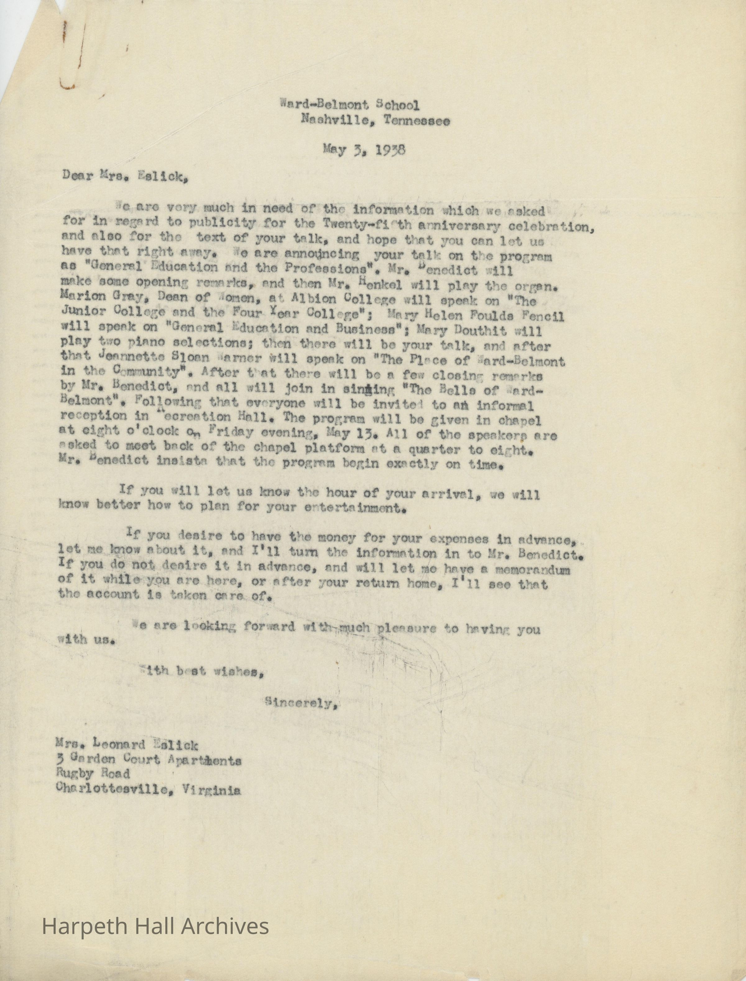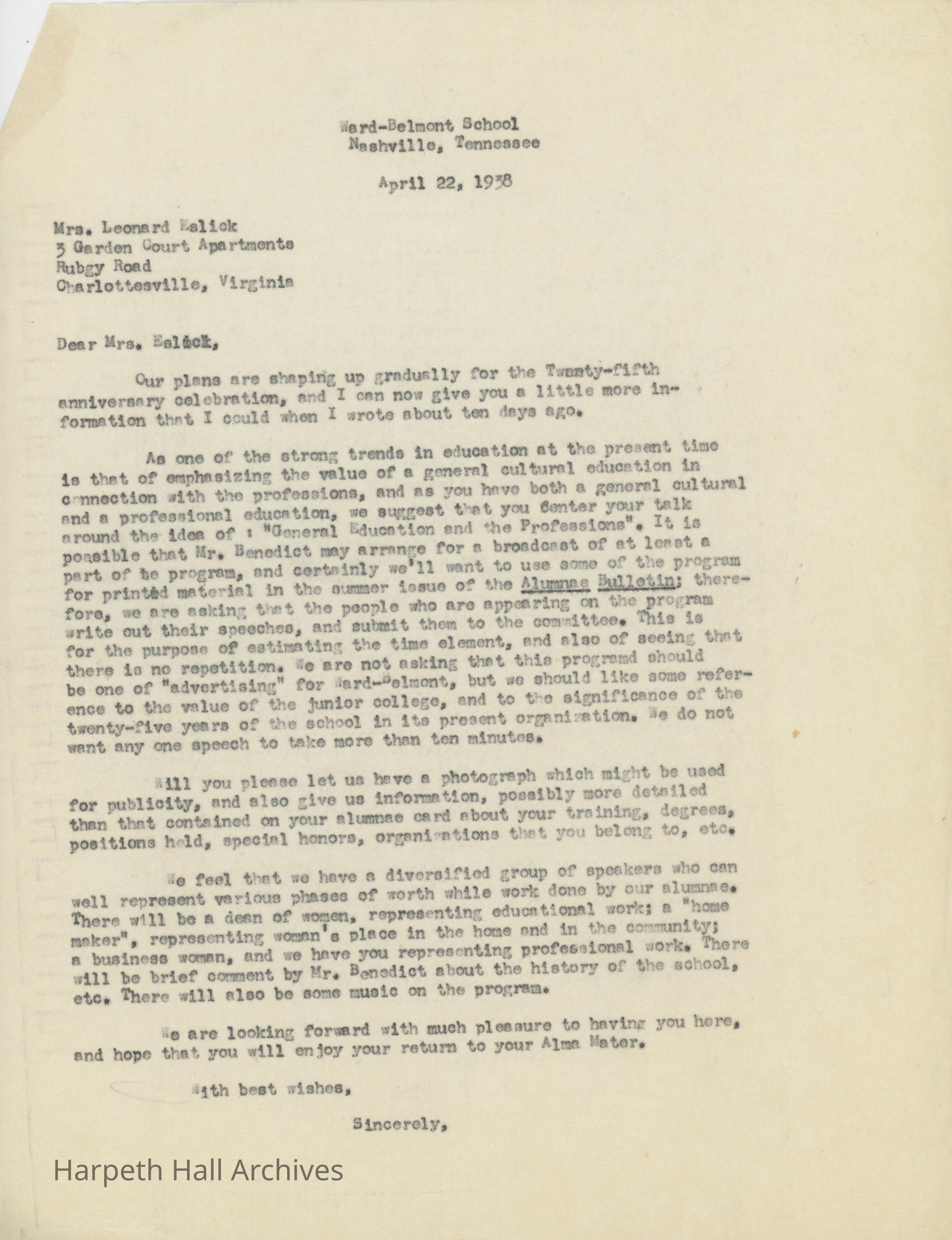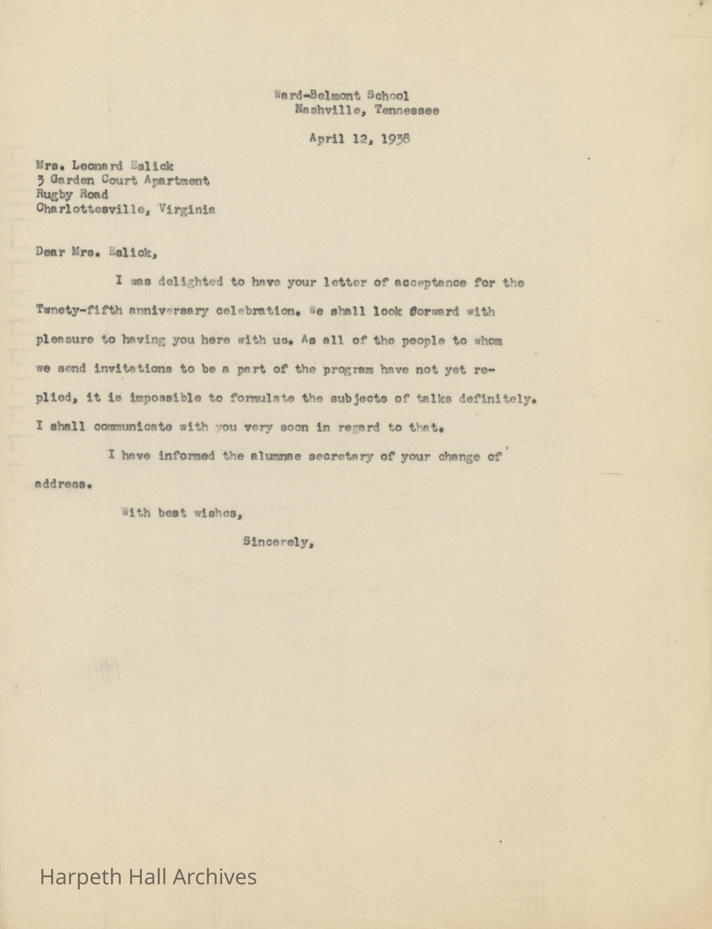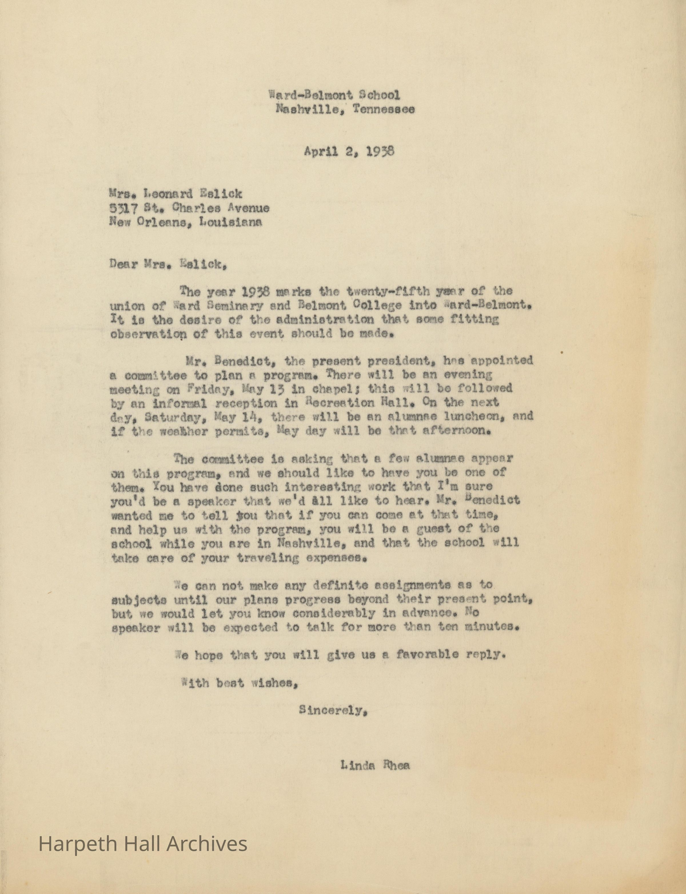 Letters from Linda Rhea to Elizabeth Eslick regarding the 25th Ward-Belmont reunion in 1938.Collection