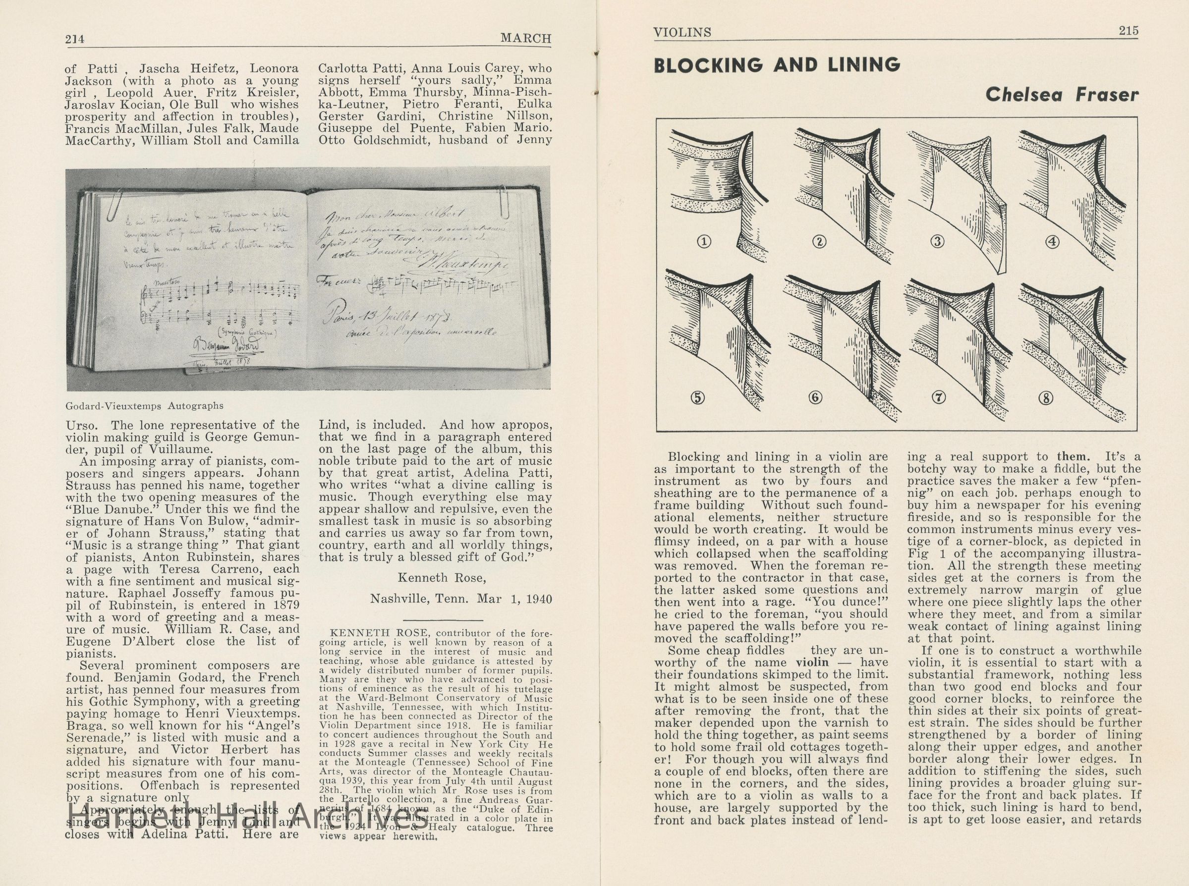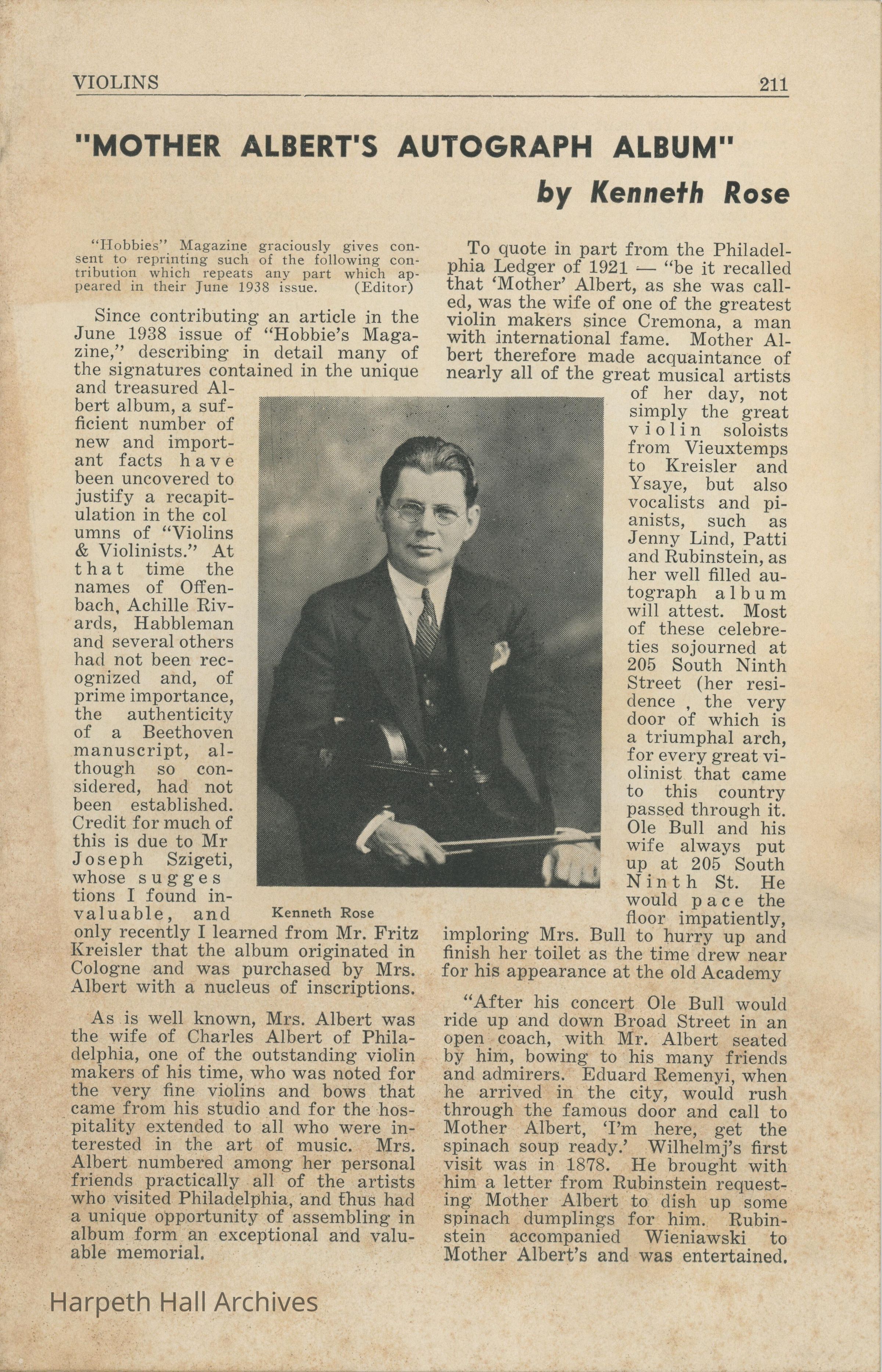 An article entitled, "Mother Albert's Autograph Album" written by Kenneth Rose published on March 1st, 1940. Mr. Rose was the head of the Violin department at Ward-Belmont.Collection
