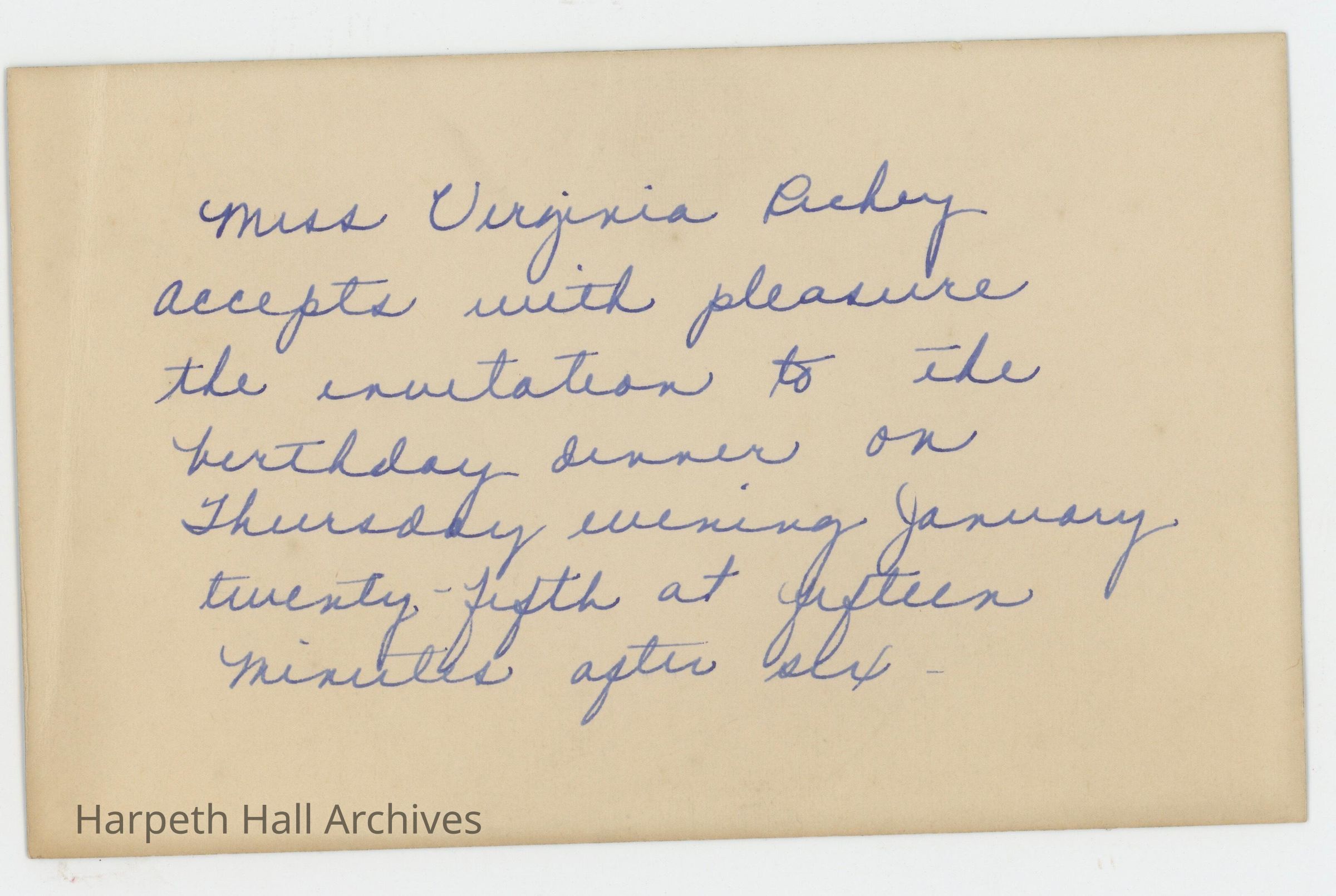 A RSVP from Virginia Richey for a birthday dinner on January 25th at 6:15pm.Collection
