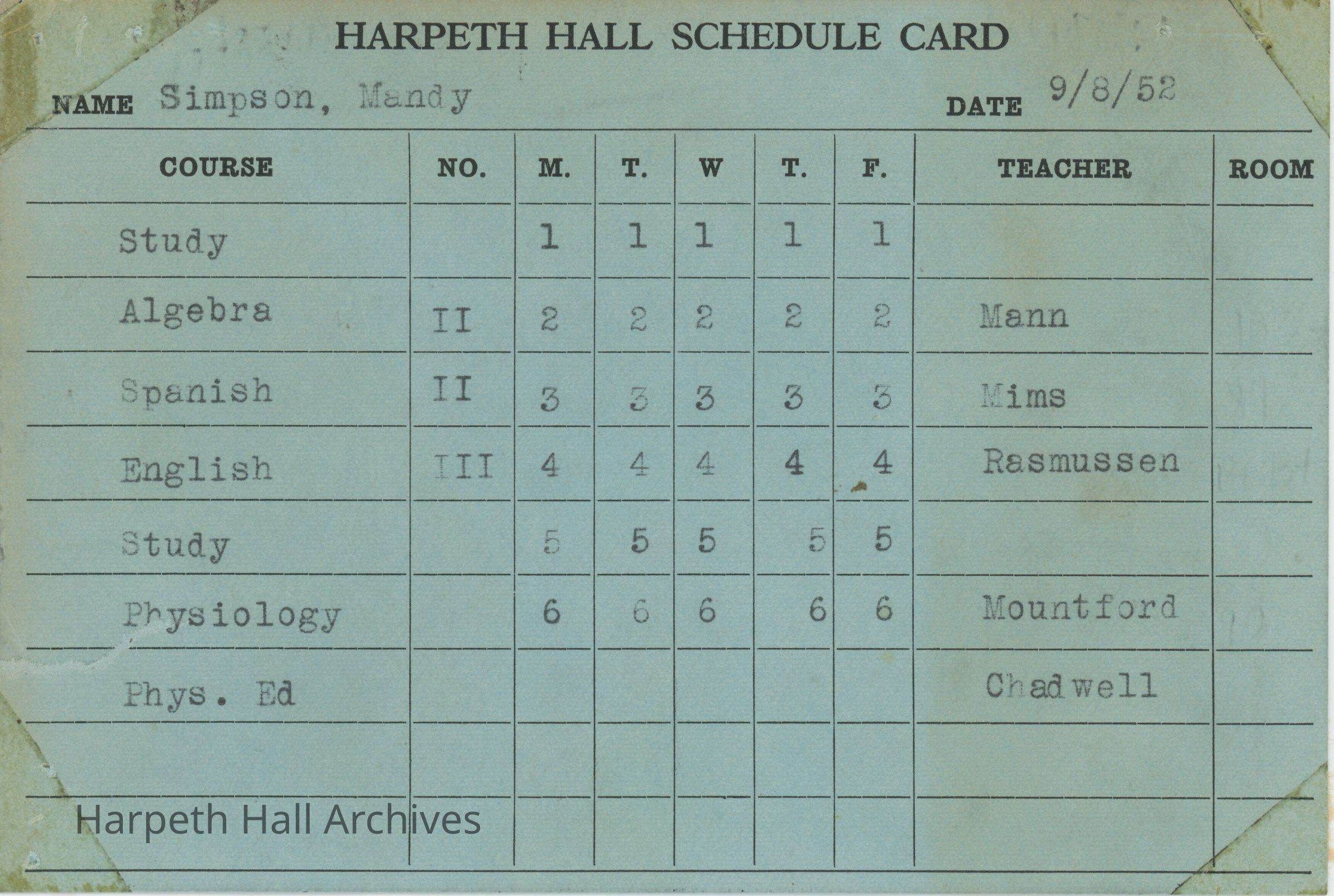 The schedule card for Mandy Simpson '54 for the 1952-53 school year when Mandy was a junior. She was taking Algebra II, Spanish II, English III, physiology, and physical education. as well as two study halls.Collection