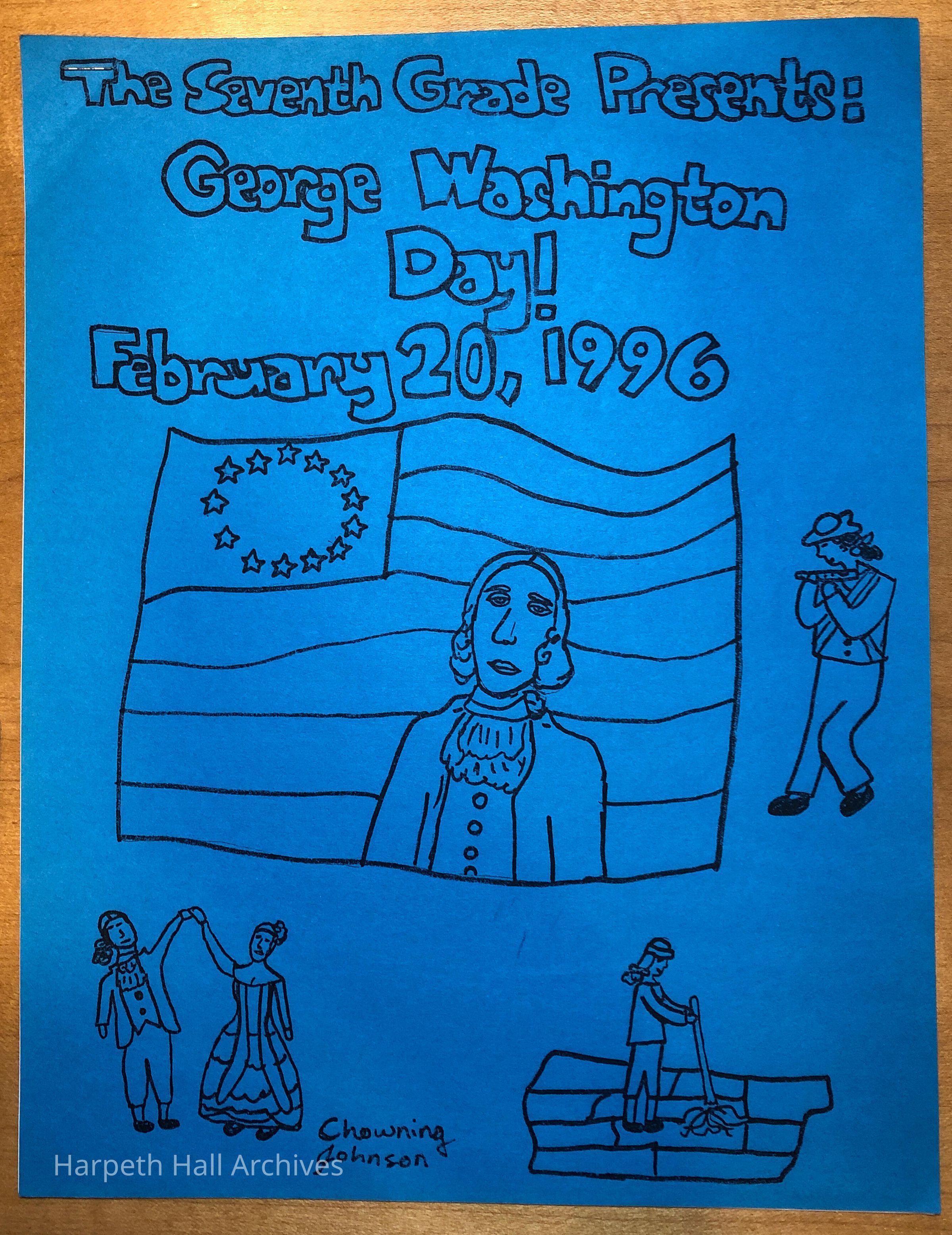 The 1996 program for the George Washington Day Celebration put on by the class of 2001 when they were in the seventh grade. The celebration was dedicated to Nina Tobin, George Washington Costume Designer. George Washington was played by eighth grader Allyson Foreman (2000) and Martha Washington was played by eighth grader Patricia "Tricia" McWilliams Ward (2000). Front cover design by Elizabeth "Chowning" Johnson (2001).Context