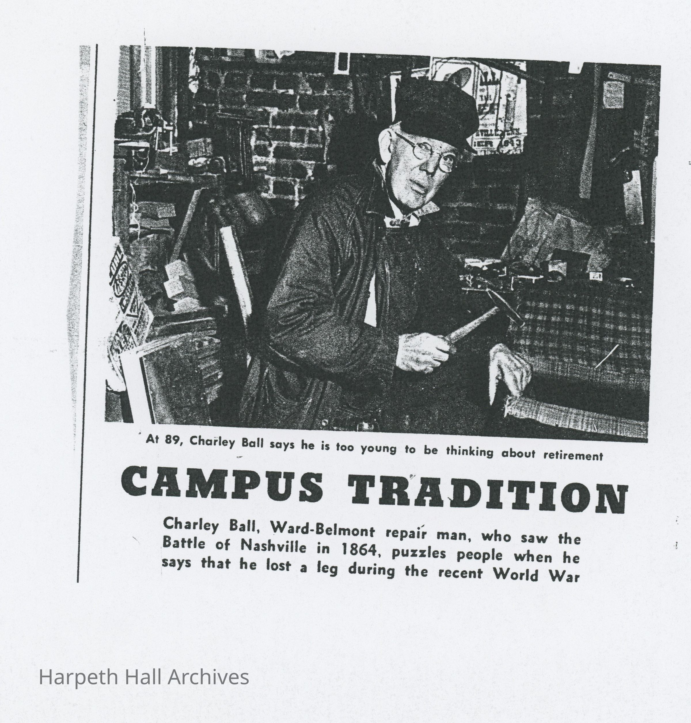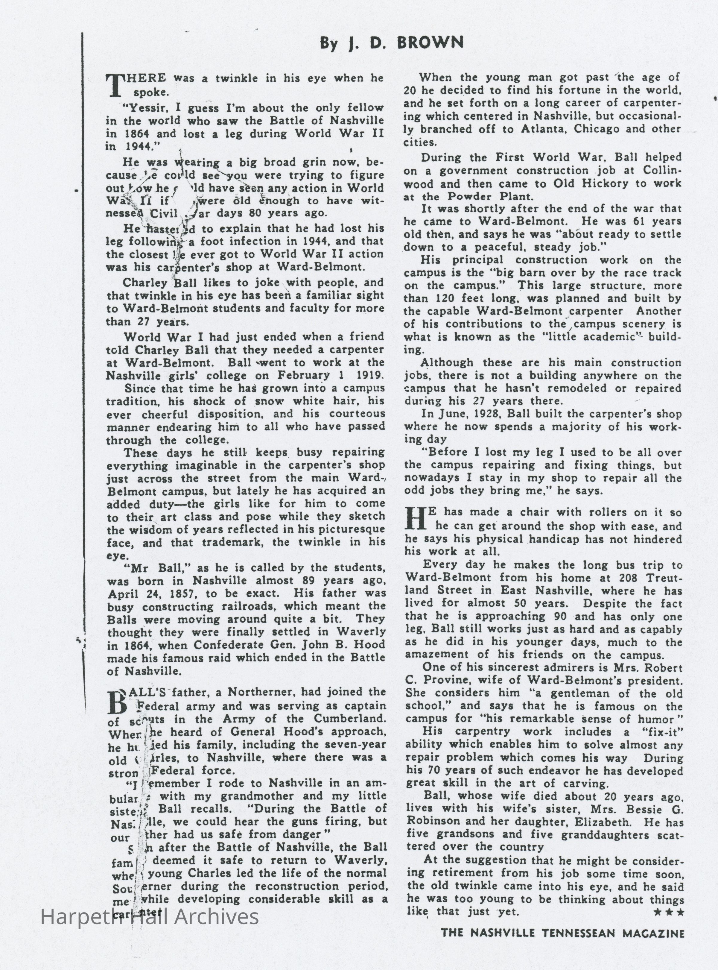 Article on Ward-Belmont's repair man who lived through the Battle of Nashville during the Civil War and lost a leg in one of the World Wars. The article published in the Nashville Tennessean magazine talks of Ball's life and his current work at Ward-Belmont.Collection