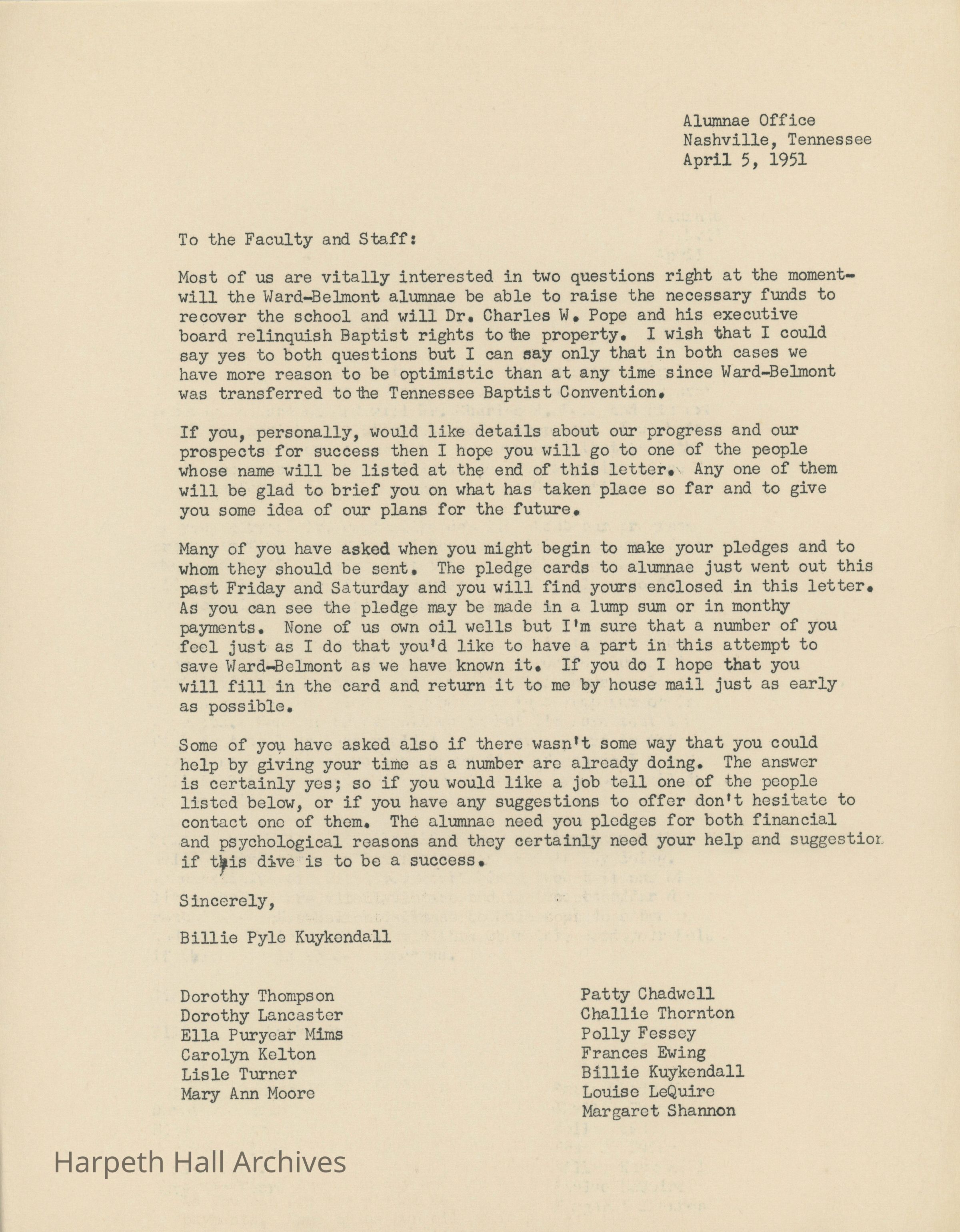 Letter to WB alumni telling them how they can help the Alumni Association try to buy Ward-Belmont from the Baptists. It provides them with a pledge card and a list of names that they can contact if they want to help further.Collection