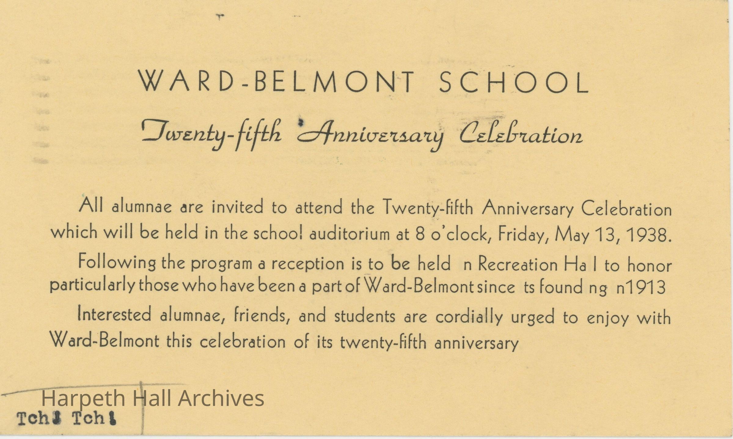 The invitation to the 25th Ward-Belmont Anniversary. The anniversary celebration was to be held on May 13th, 1938, but the letter is dated May 5th, 1938.Collection