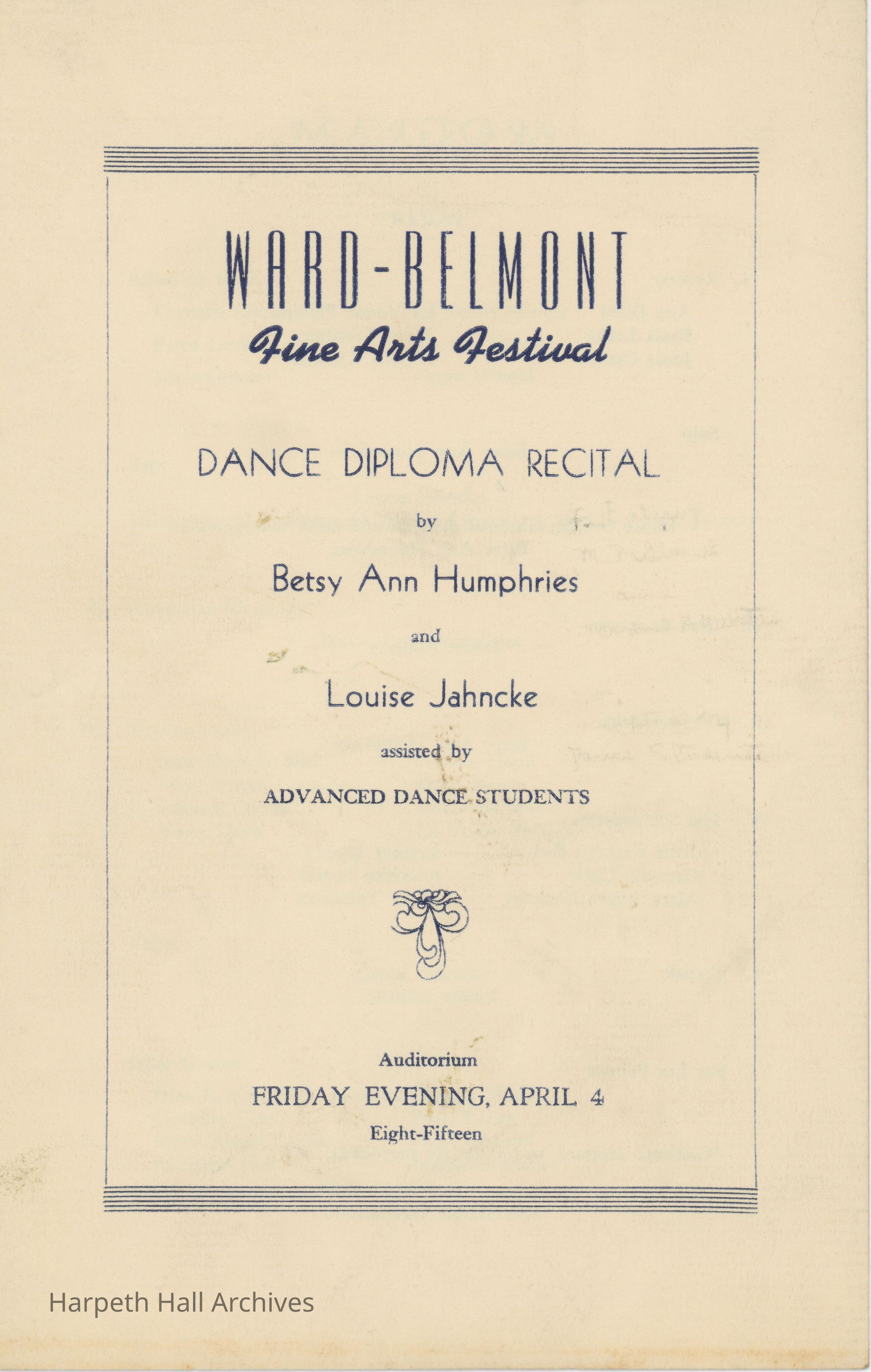 Betsy Ann Humphries and Louise Jahncke were members of the Ward-Belmont class of 1941. The 1941 Milestones yearbook stated that the recital "provided Ward-Belmont with its chief topic of conversation for weeks before and after the evening of April 4. As a part of the course each girl created one solo and one group dance with costumes and music arrangements. When Betsy Ann appeared in her Hungarian Rhapsody presentation and when Louise Jahncke appeared in Trepak and Ballet du Reve, the first and only night audience could not suppress oh's and ah's of admiration."