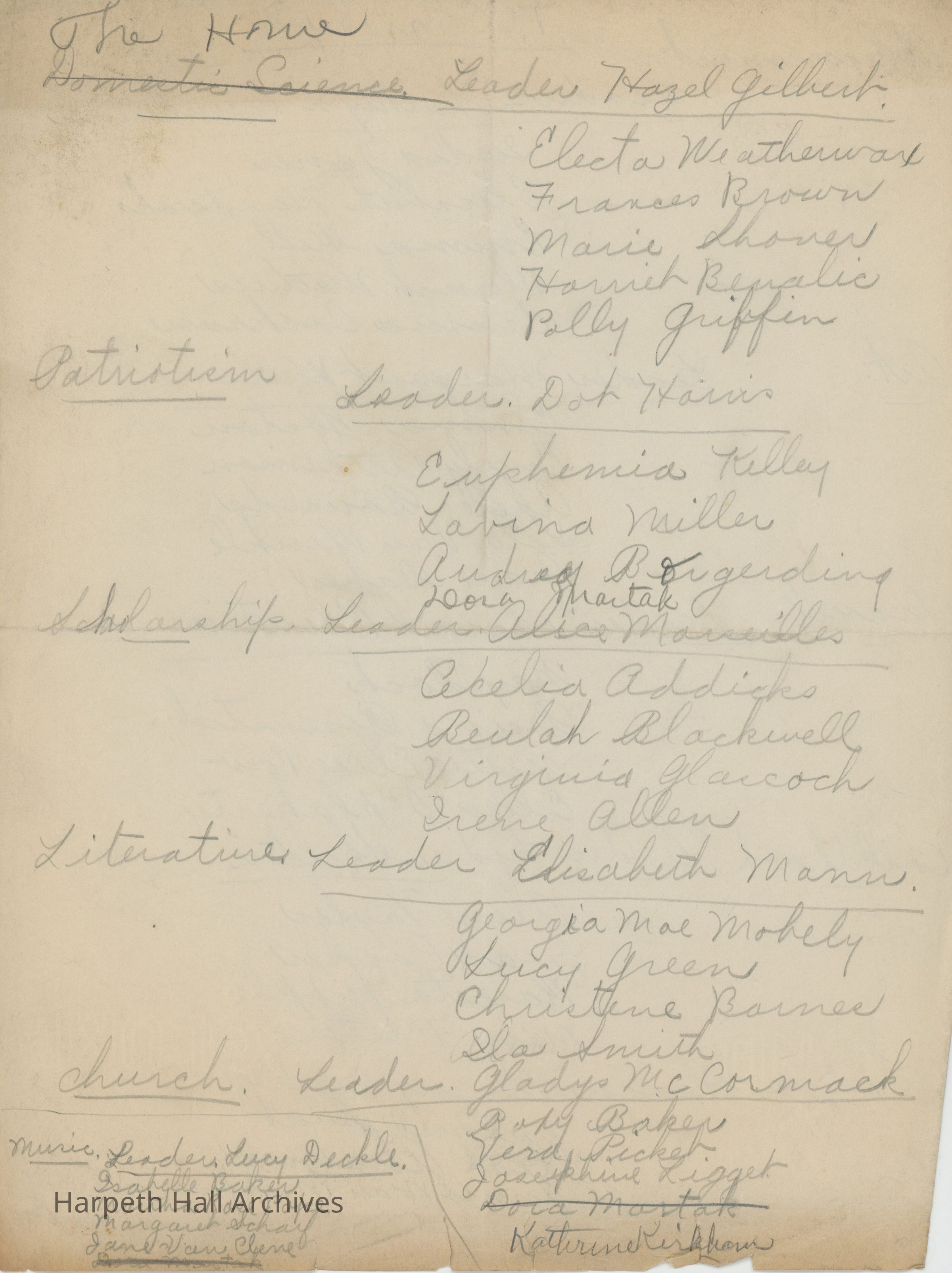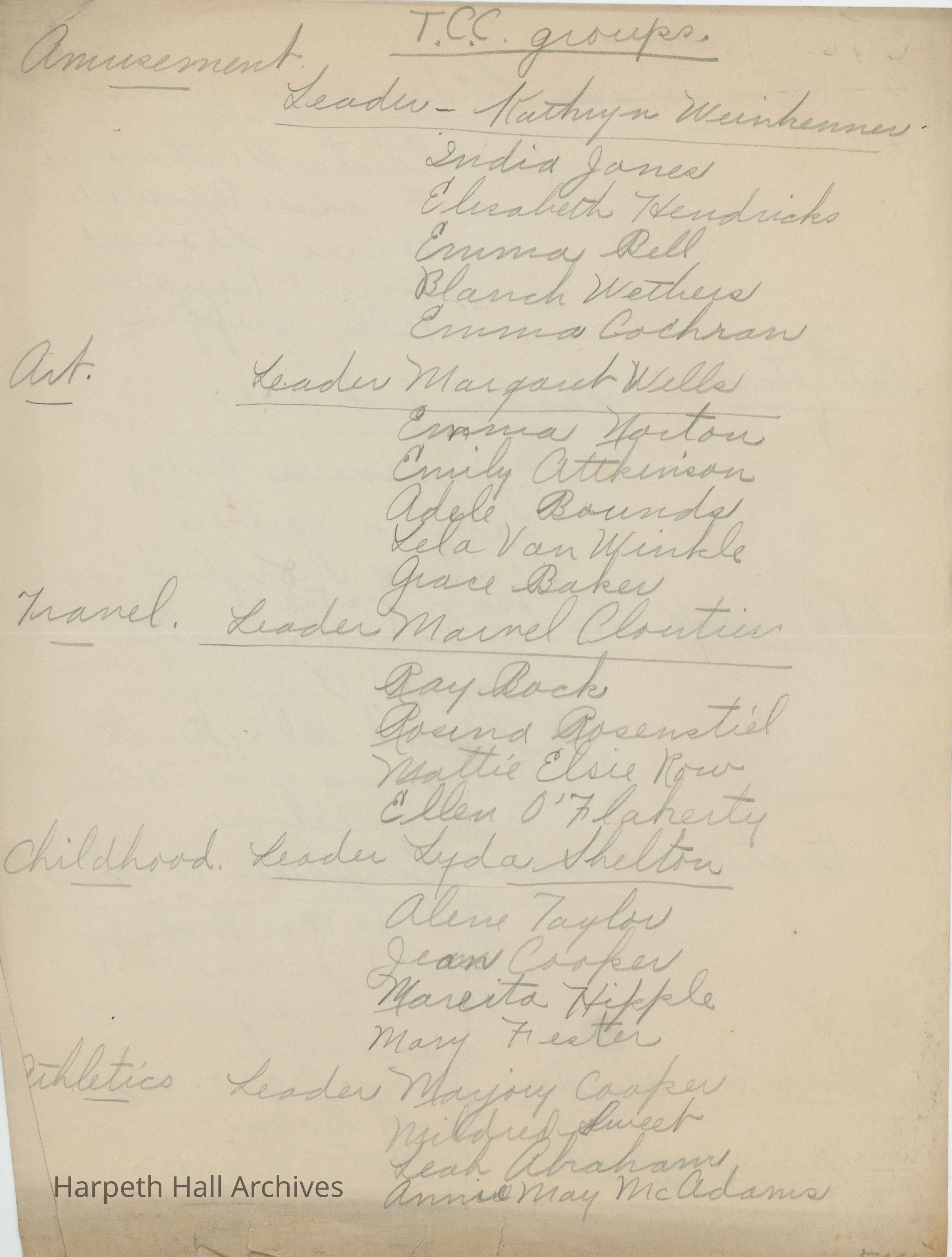 A handwritten list of club groups and their associated leaders and members within the Twentieth Century Club. Groups included amusement, art, travel, childhood, athletics, the home (previously called domestic science), patriotism, scholarship, literature, church, and music.Context