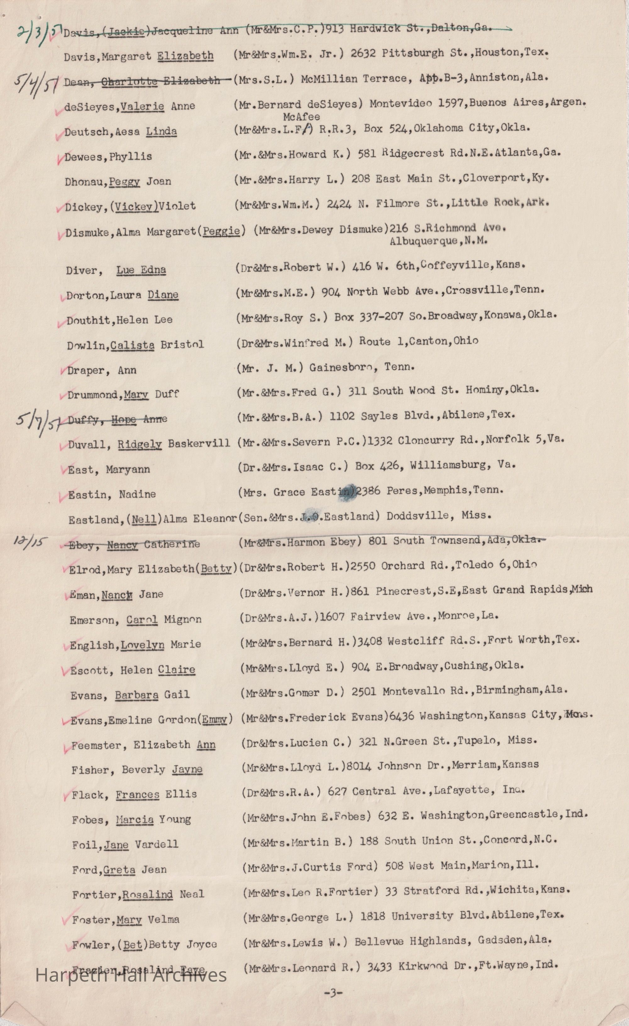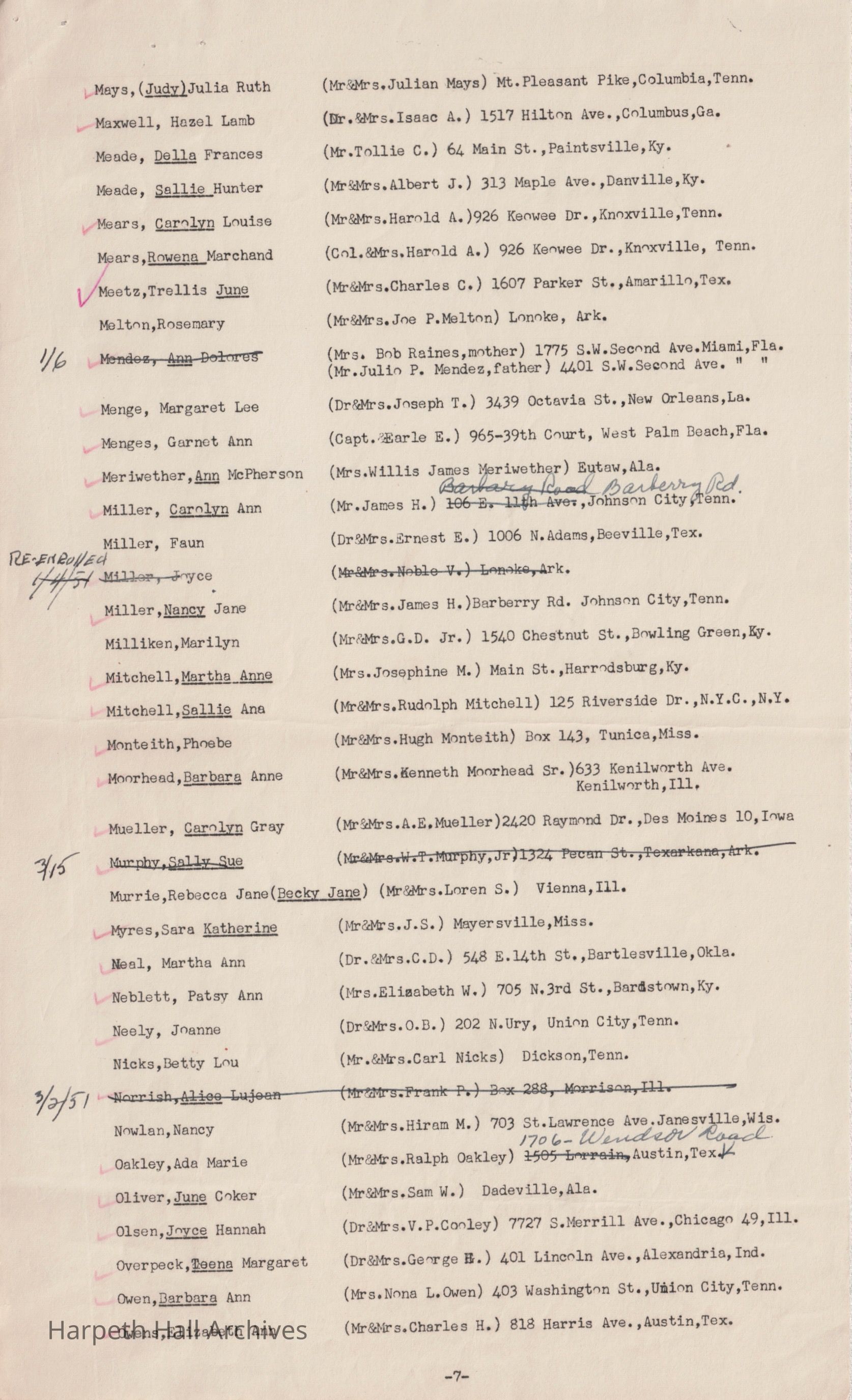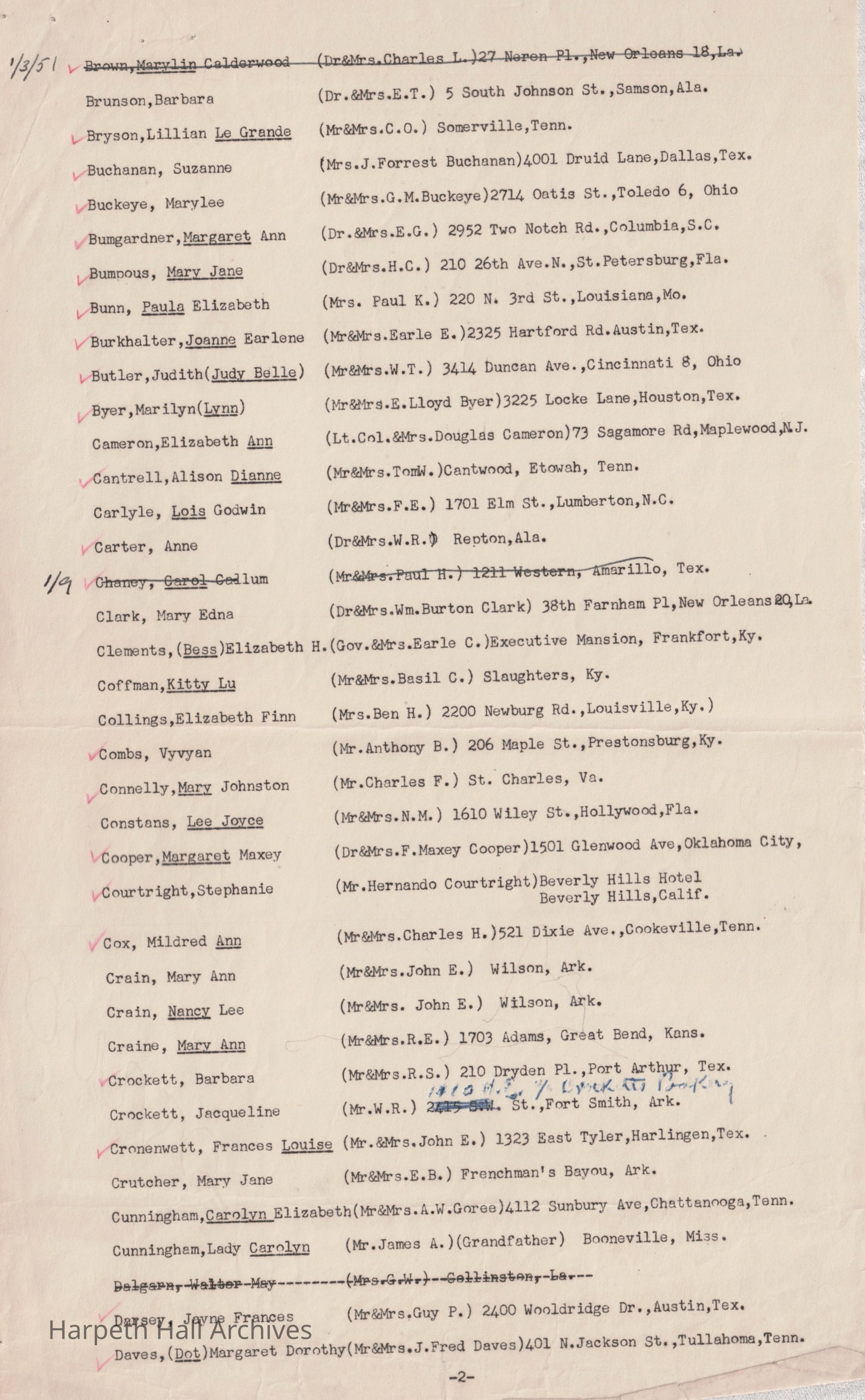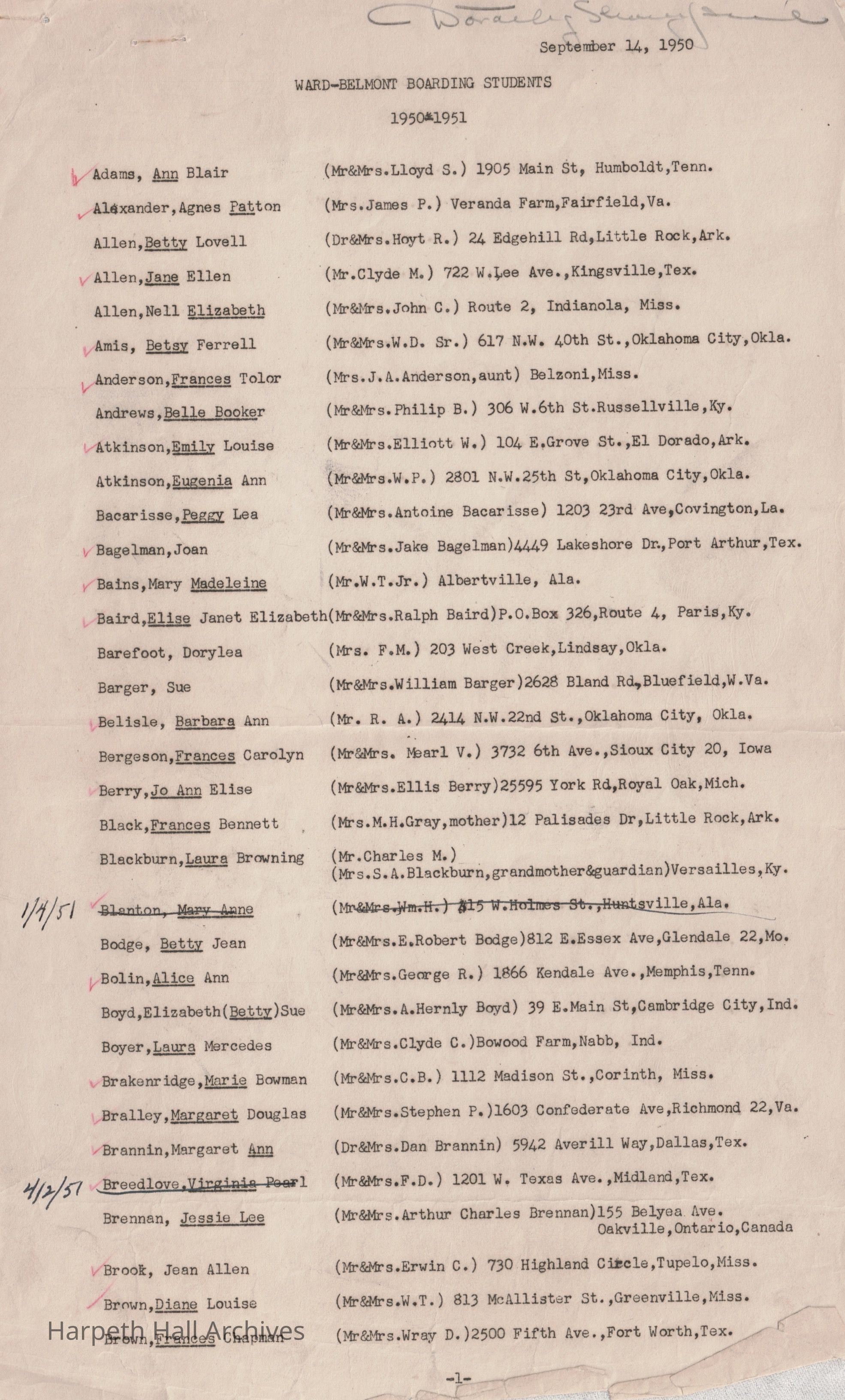 Ward-Belmont Boarding Students List - 1950-51Entry/Object ID