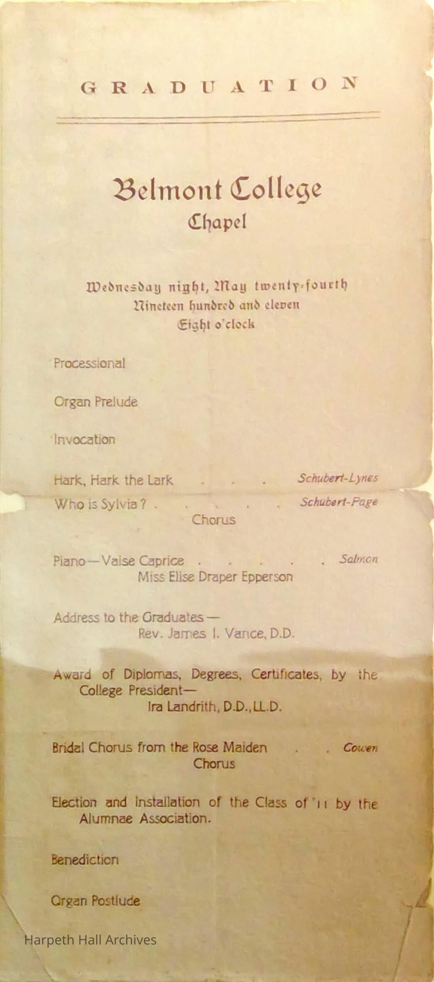 1911, Belmont College, Belmont College graduation, Belmont College graduation program, Belmont College class of 1911, Epperson, Landrith, Vance, Belmont College graduation program, Belmont College Alumnae Association