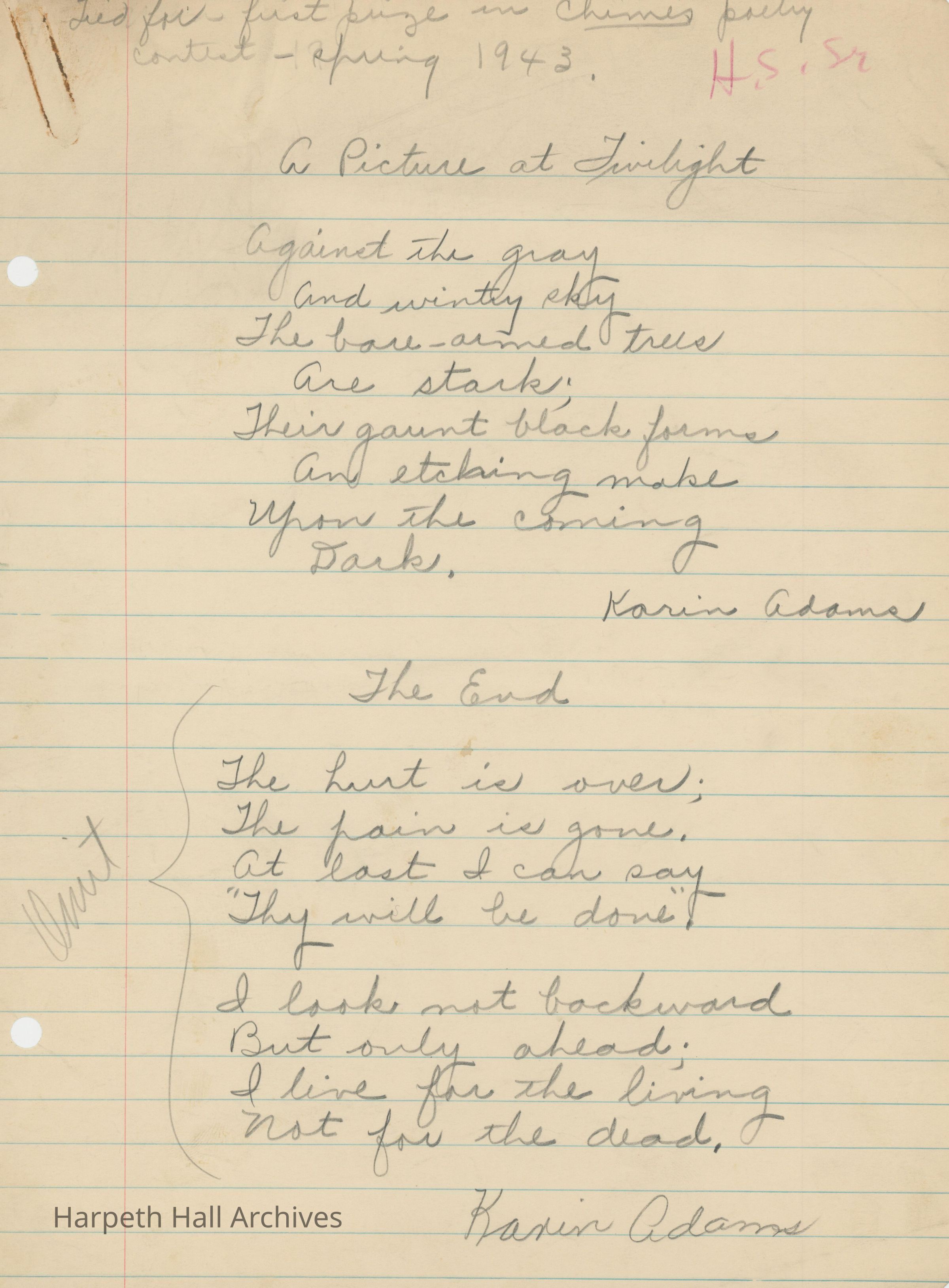 Two poems written in 1943 by Ward-Belmont High School senior, Karin Adams. The poems are entitled, "A Picture at Twilight" and "The End."Collection