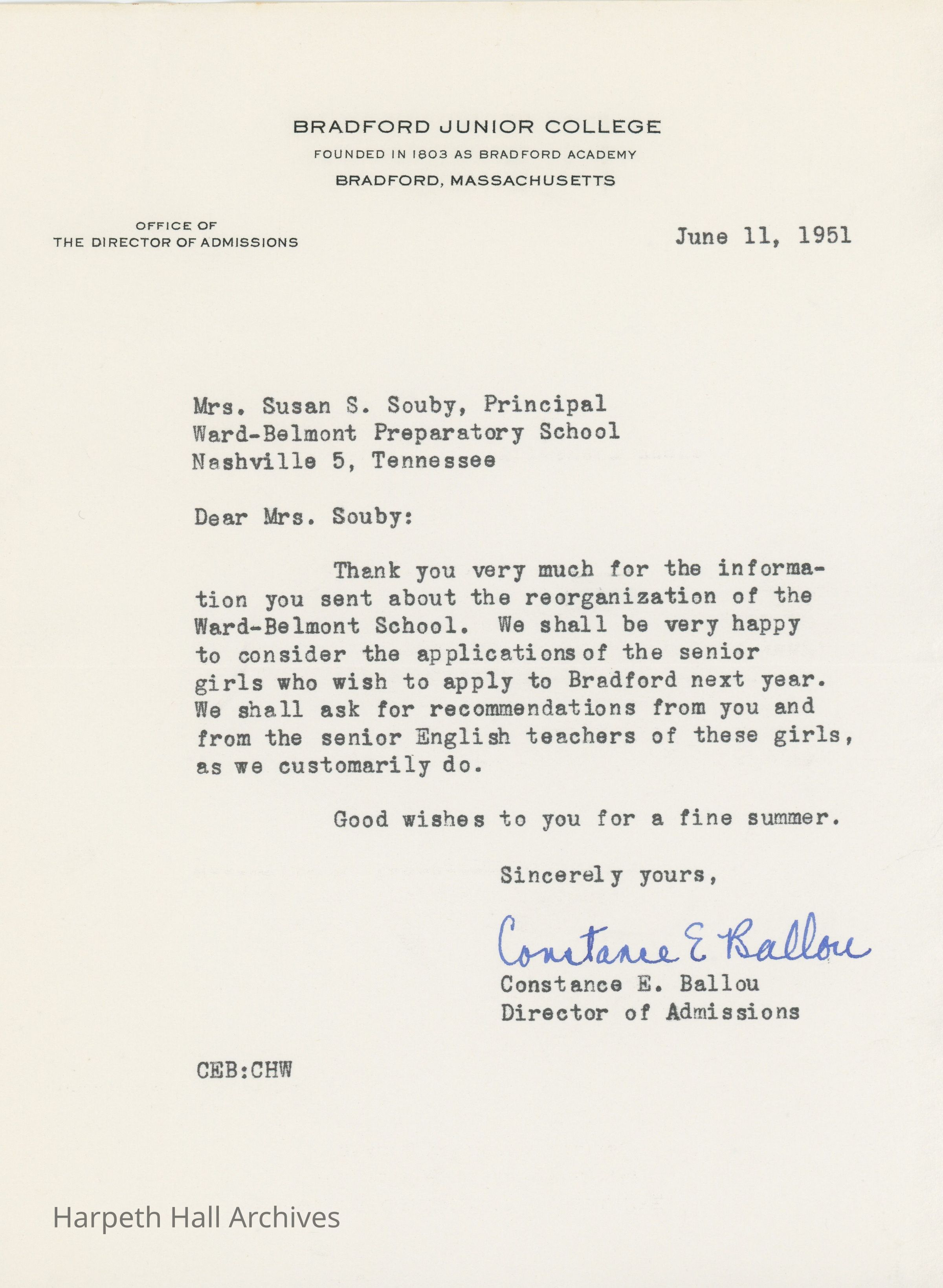 Letter to Susan Souby from Bradford Junior College in Massachusetts assuring Mrs. Souby that students who wish to apply to Bradford for the next year will be considered. The letter appears to be a response to a letter sent by Mrs. Souby that explained the Ward-Belmont transition to Harpeth Hall.Collection