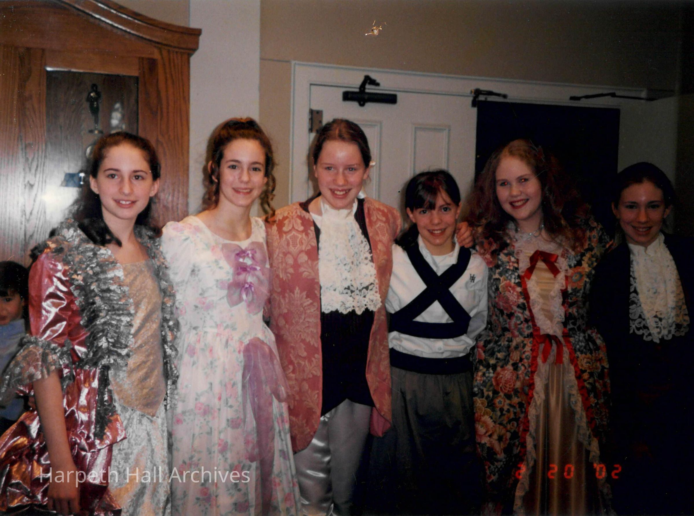A group of seventh grade students posing in costume after the George Washington Day Celebration on February 20, 2002. The photo is taken in the Marnie Sheridan Gallery in the McMurry Center.Context