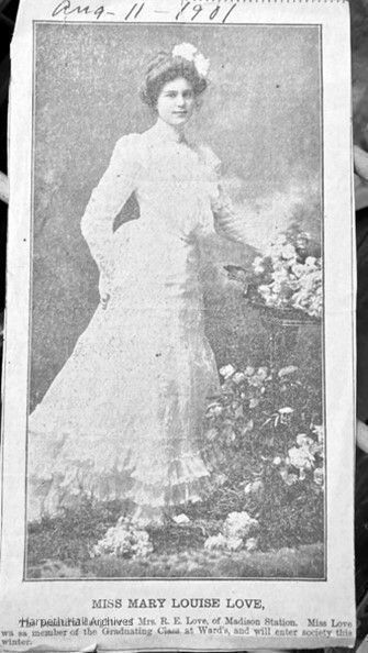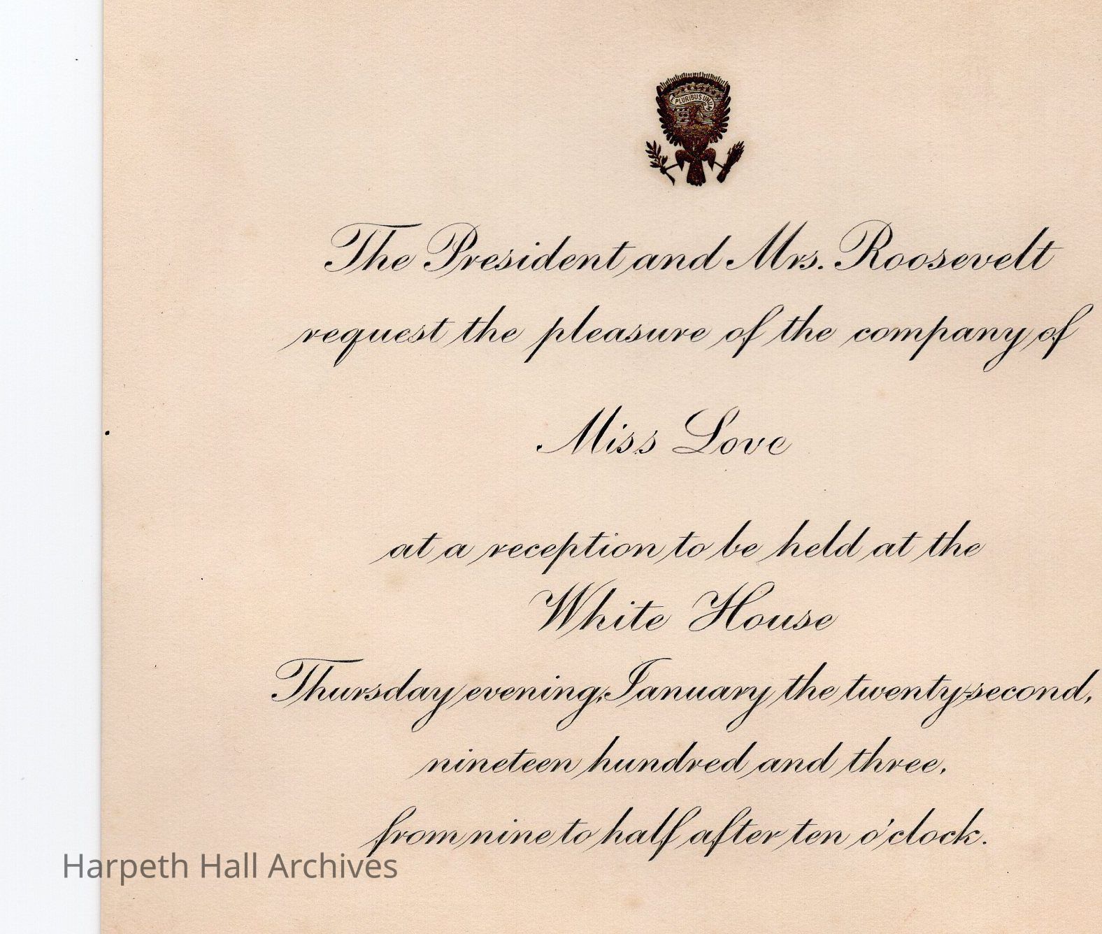 Invitation from the President and Mrs. Roosevelt to Miss Mary Louise Love, dated 1903, and a biographical sketch of Mary Louise Love Elliott and 1901 photograph.Photograph Details