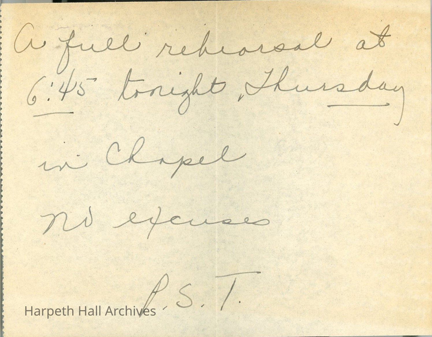 A handwritten note given to Ward-Belmont student Dorothy Elliott by an unknown fellow student or faculty/staff member with the initials P.S.T. The note reads: "A full rehearsal at 6:45 tonight, Thursday in Chapel. No excuses."Context