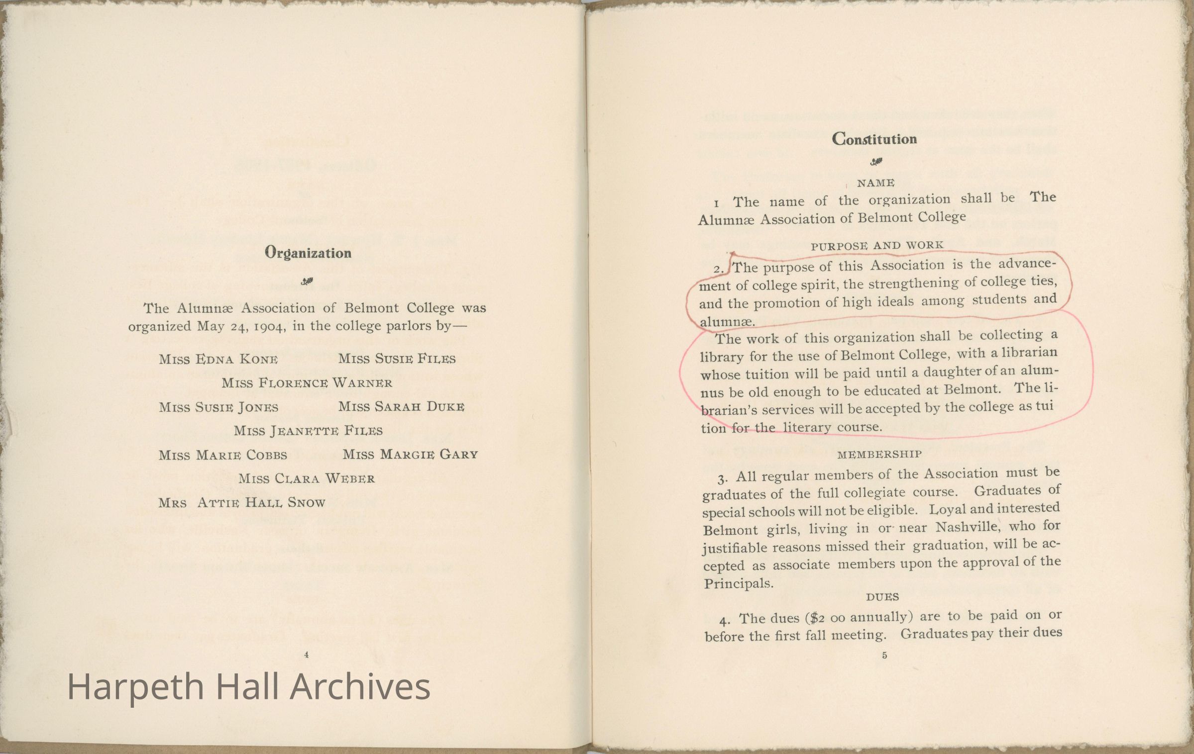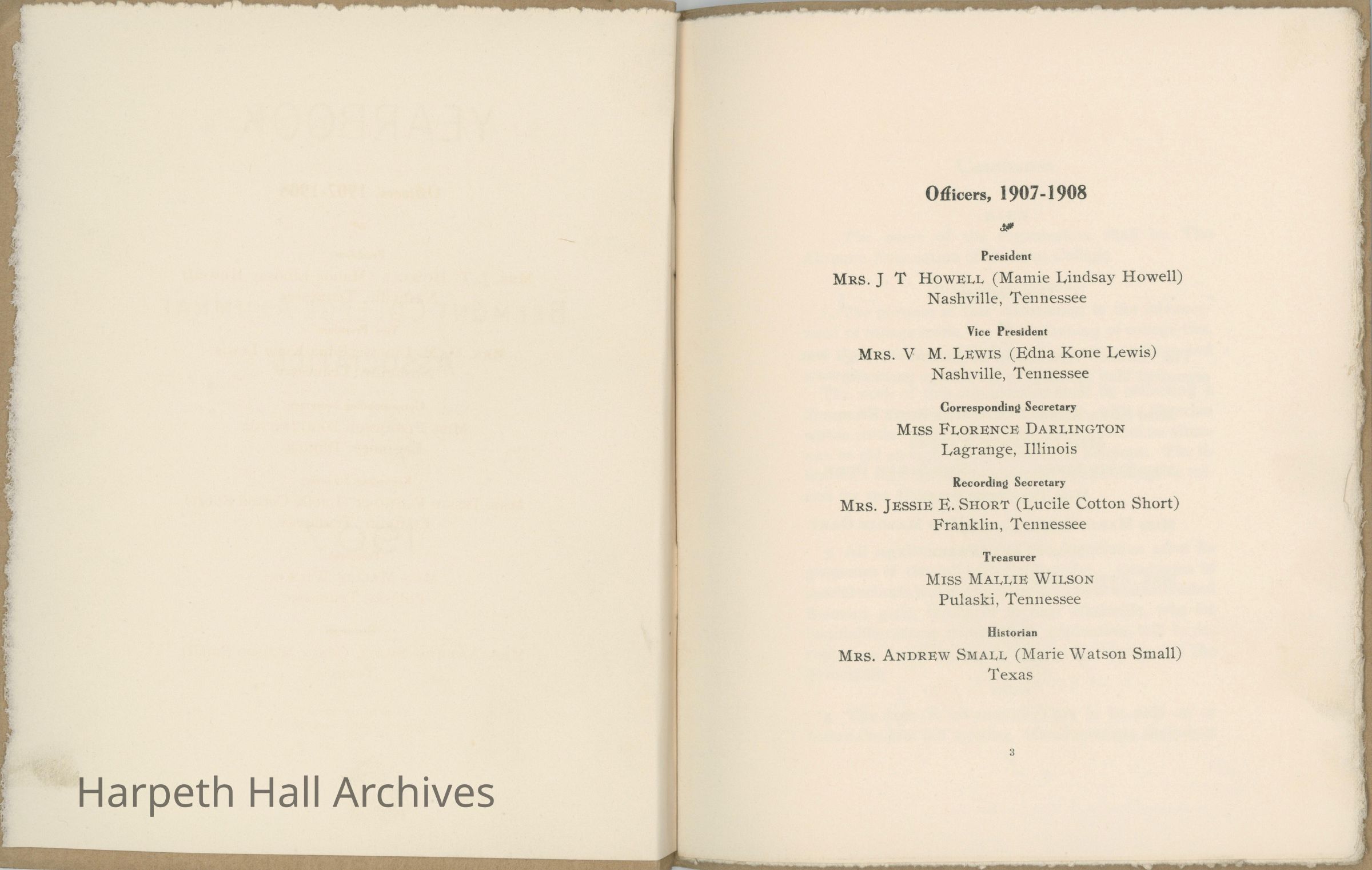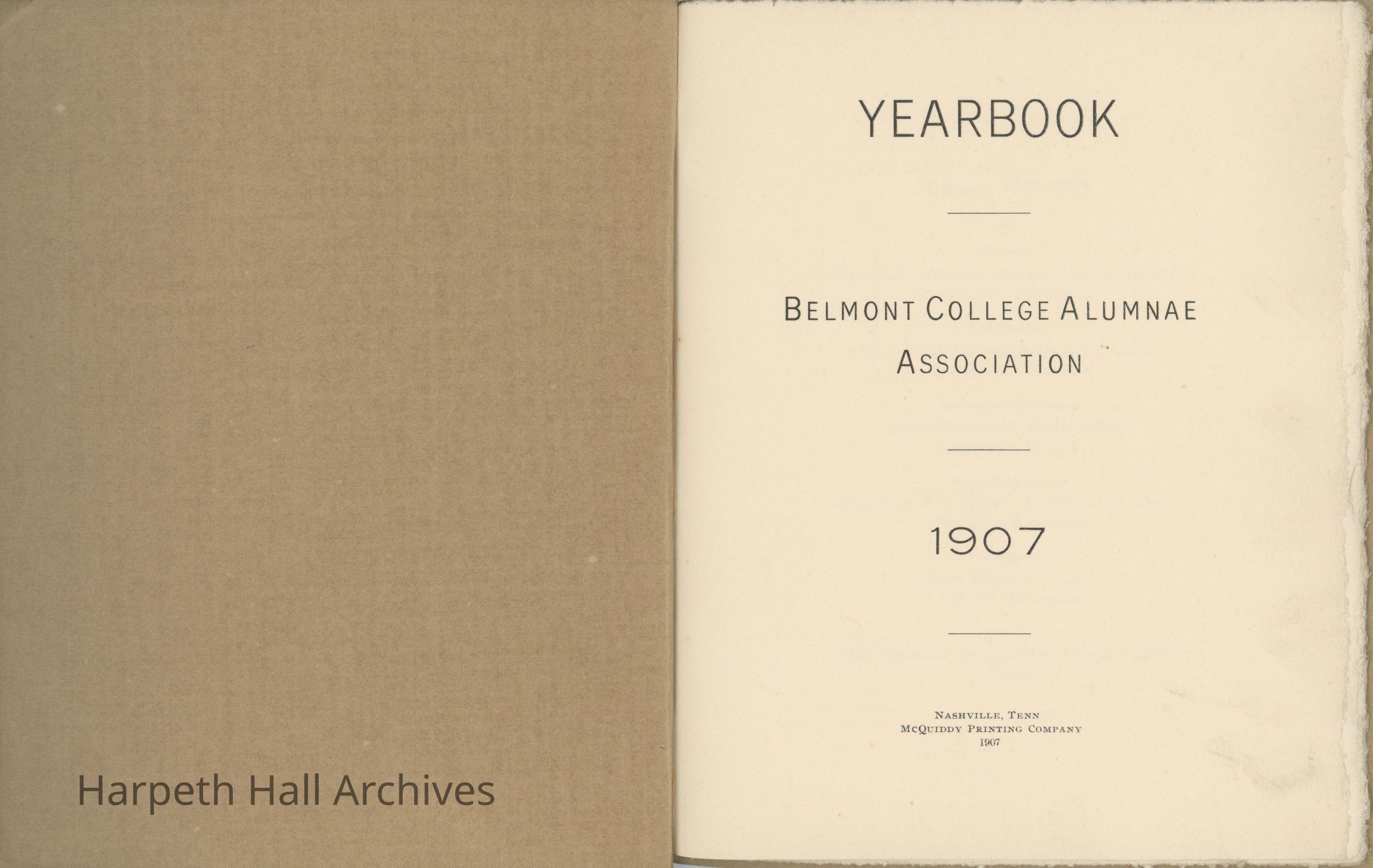 Belmont College Alumnae Association Yearbook from 1907, included officers, constitution of association, reports from meetings, and members of association from the past graduating years.