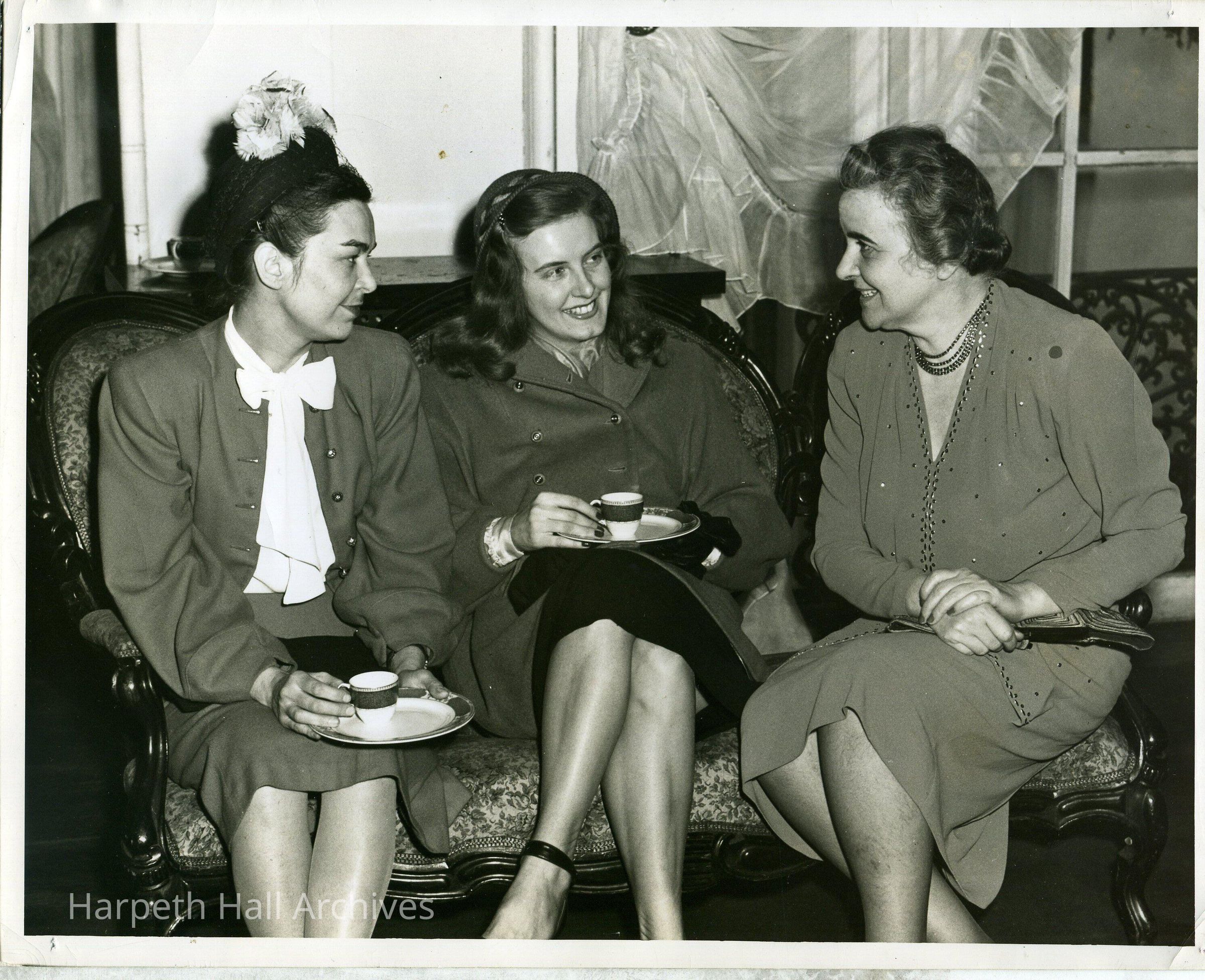 Photo of three women at a tea at Ward-Belmont. On the far left is Ella Puryear Mims, a French teacher. One of the other women is Martha Ordway, Dean of Women.