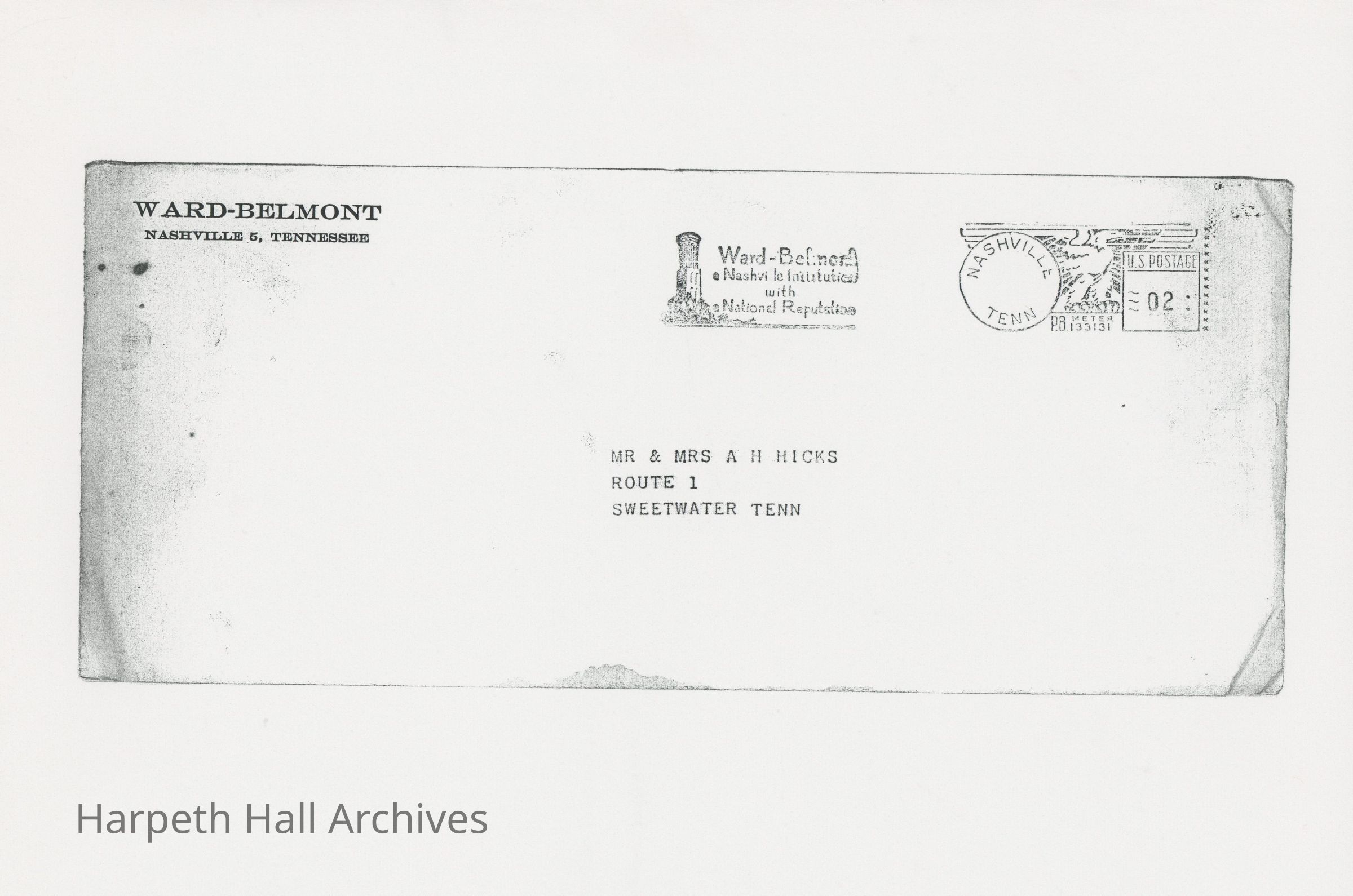 Photocopy of Envelope Sent to Mr. * Mrs. A. H. Hicks from Ward-Belmont