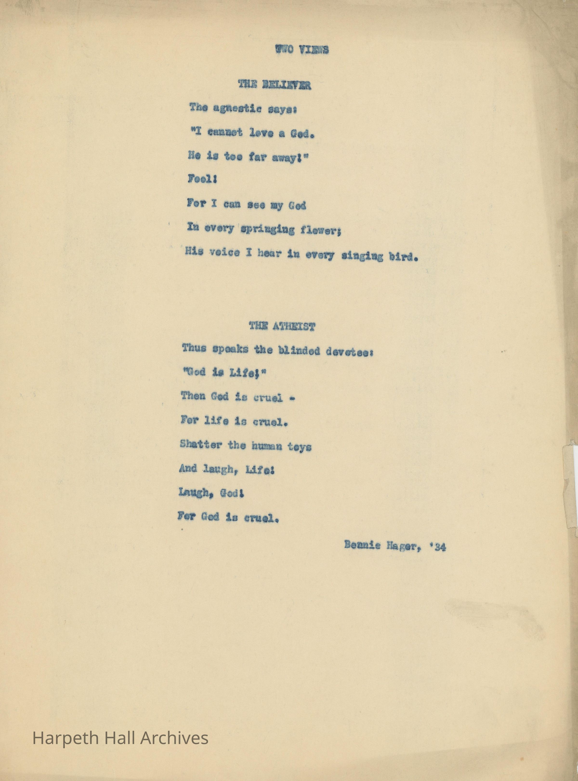 A poem titled, "Two Views" written by Ward-Belmont student Bonnie Hager (1934).