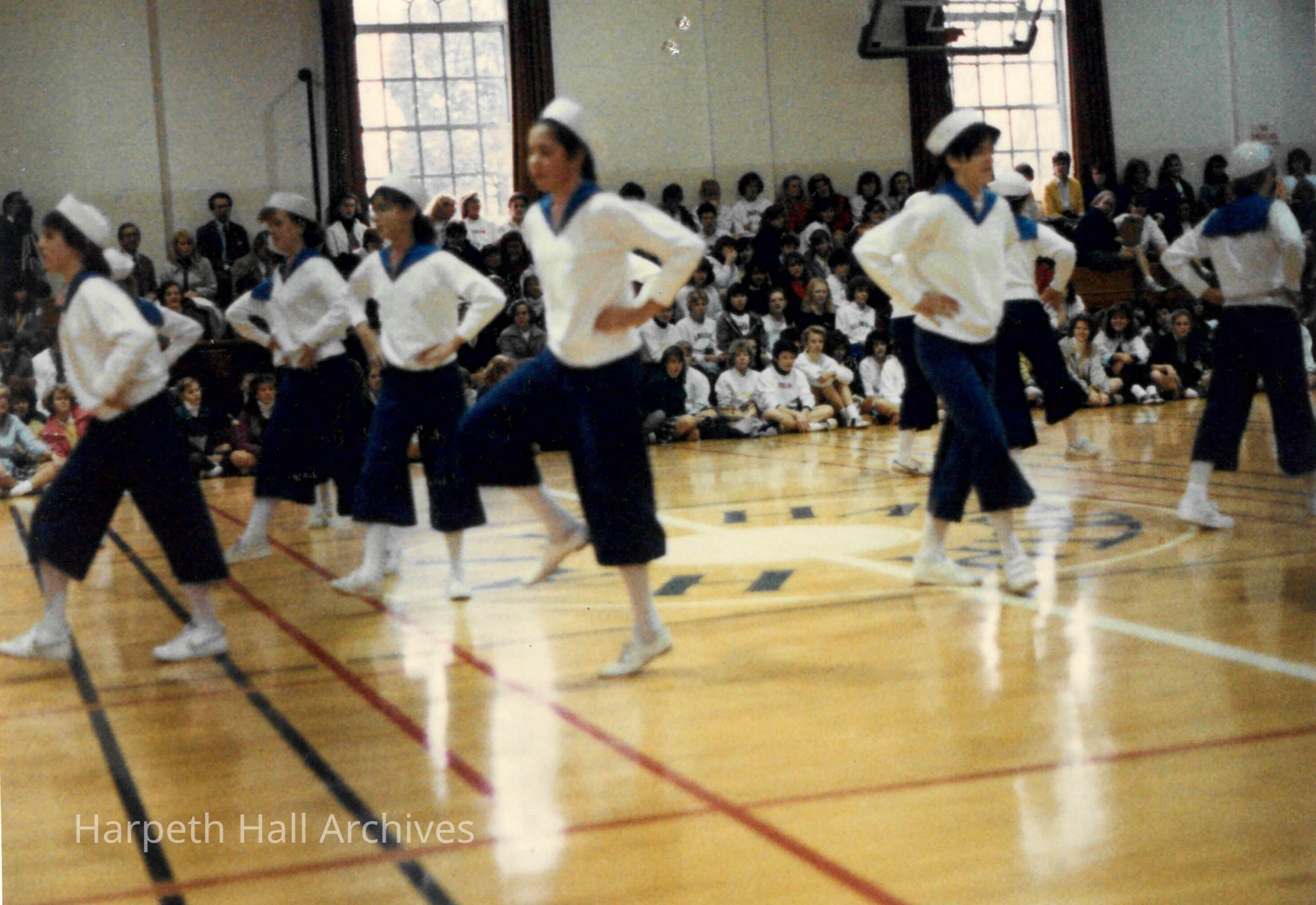 A group of seventh grade students performing as sailors in the George Washington Day Celebration. The photo is taken in the Morrison Gym in the McMurry Center.Context