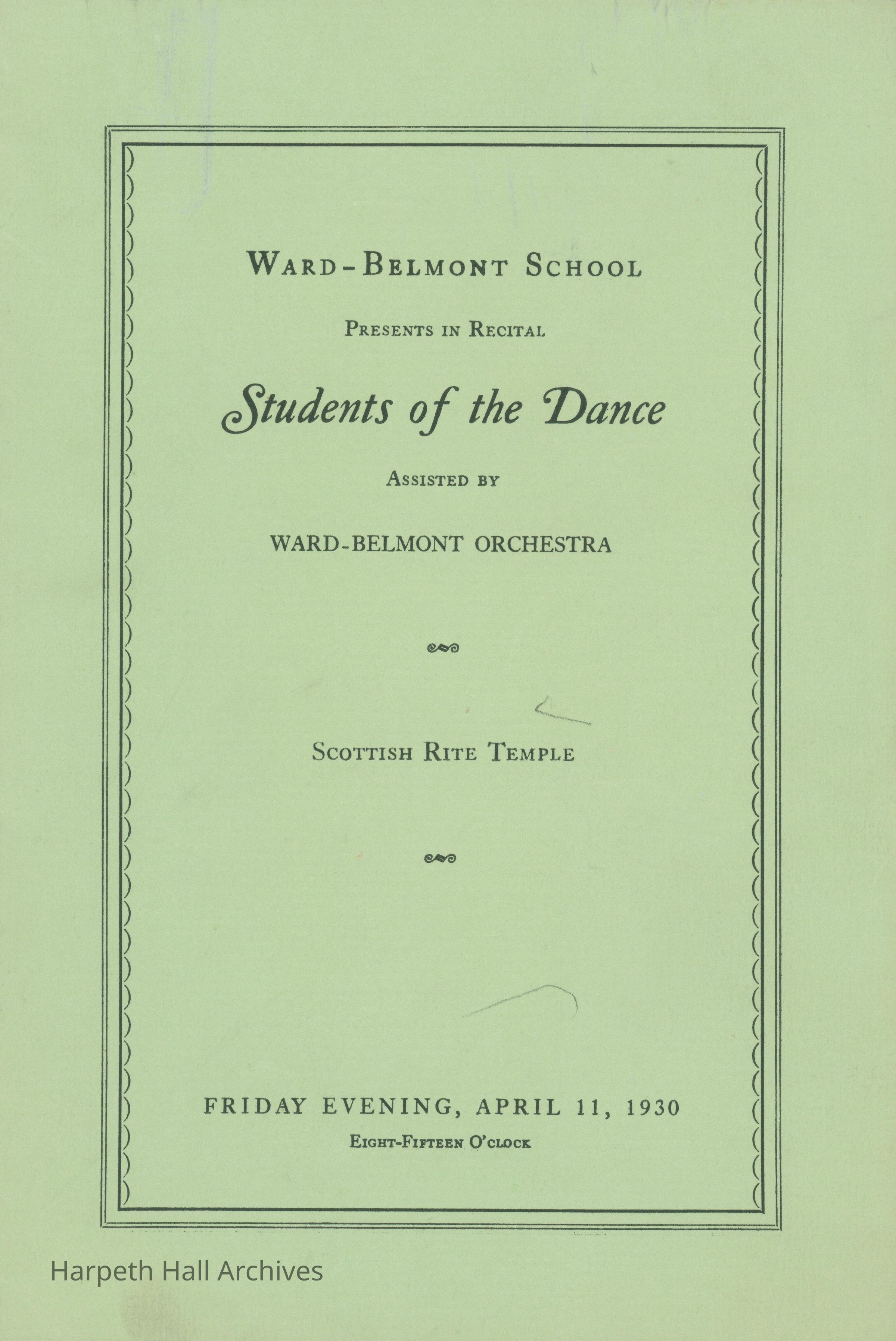 Ward-Belmont School presents in recital: Students of the Dance, assisted by Ward-Belmont Orchestra. The two-part recital was held at the Scottish Rite Temple on Friday evening, April 11, 1930, at 8:15. Dances were directed by Evelyn Jantzer and the orchestra was conducted by Kenneth Rose, with Margaret Frierson Hall at the piano and violin solos by Otis Dresslar. The names of composers and performers are listed in the program alongside their respective music and dance numbers. The Ward-Belmont Orchestra members are listed by instrument on the back of the program.Context