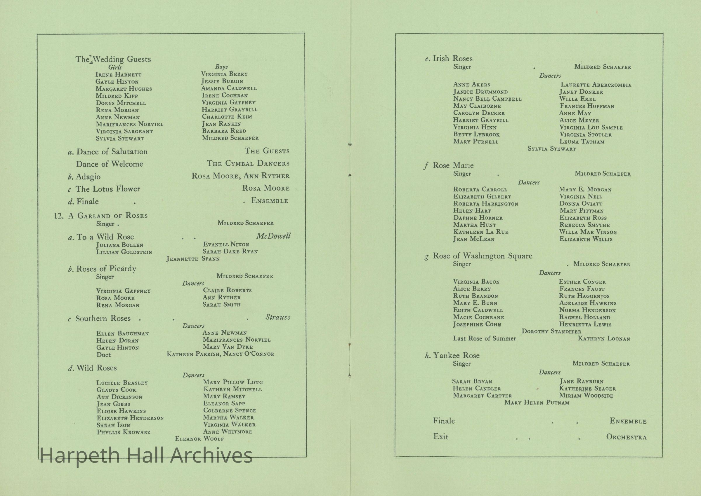 Evelyn Jantzer was the dance instructor within the school of physical education at Ward-Belmont throughout the late 1920s and early 1930s. She graduated from the Savage School of Physical Education and the Vestoff Serova School of Dancing. Margaret Frierson Hall was a secretary and assistant within the gymnasium and the school of physical education. Kenneth Rose was a violin teacher, who formerly taught at the Metropolitan School of Music in Indianapolis and was Concert Master of the Indianapolis Symphony Orchestra before coming to Ward-Belmont.Collection