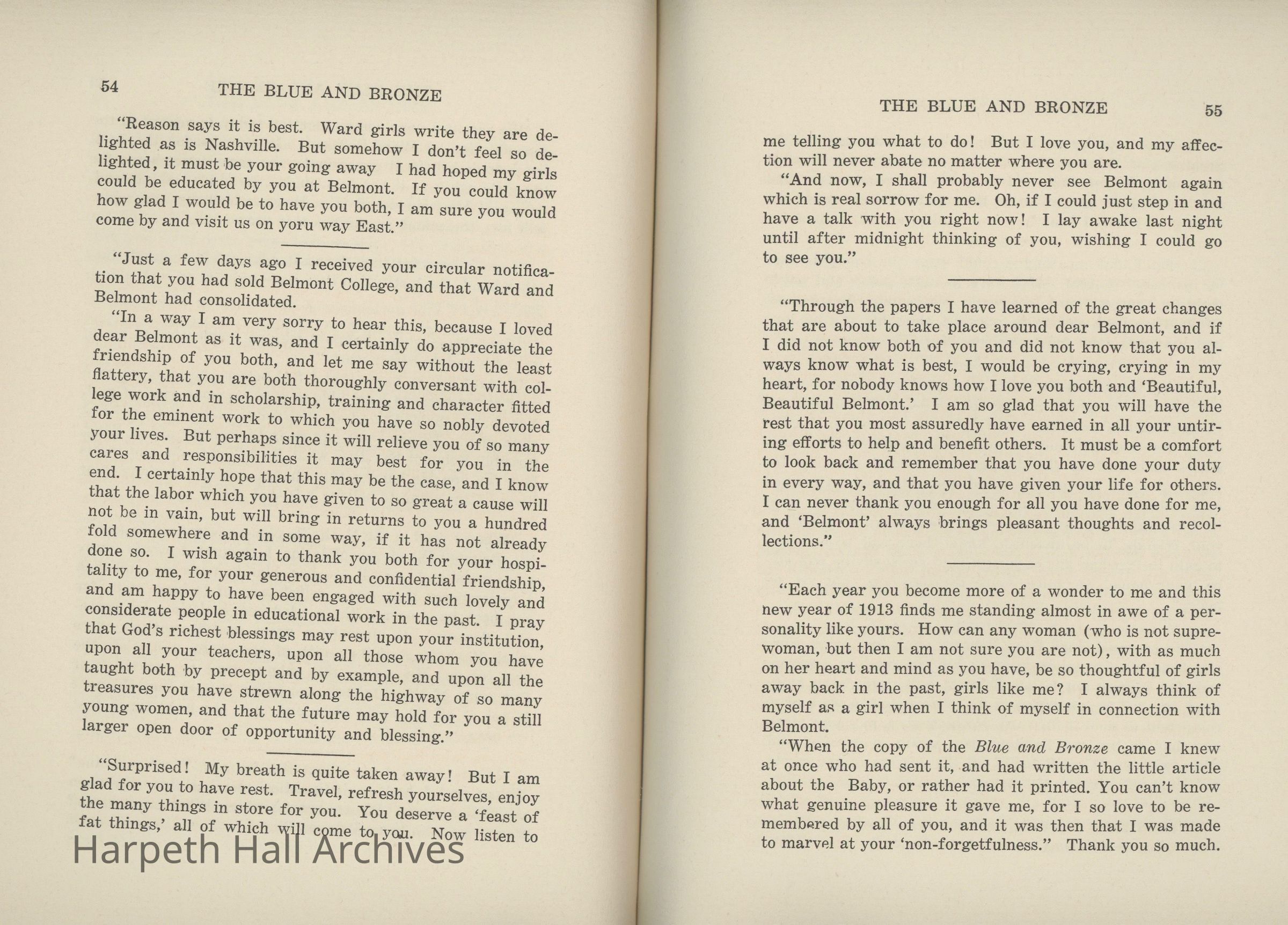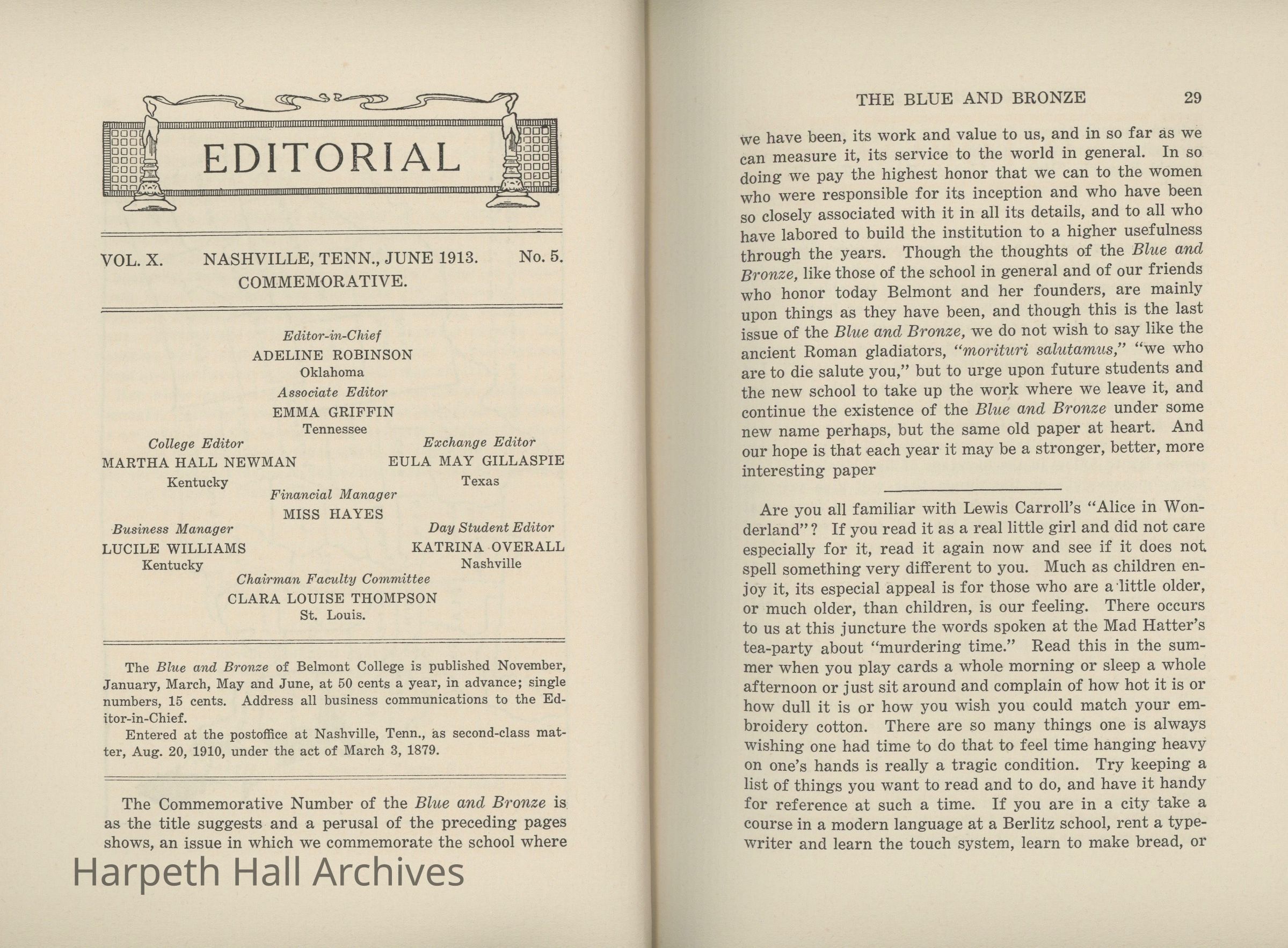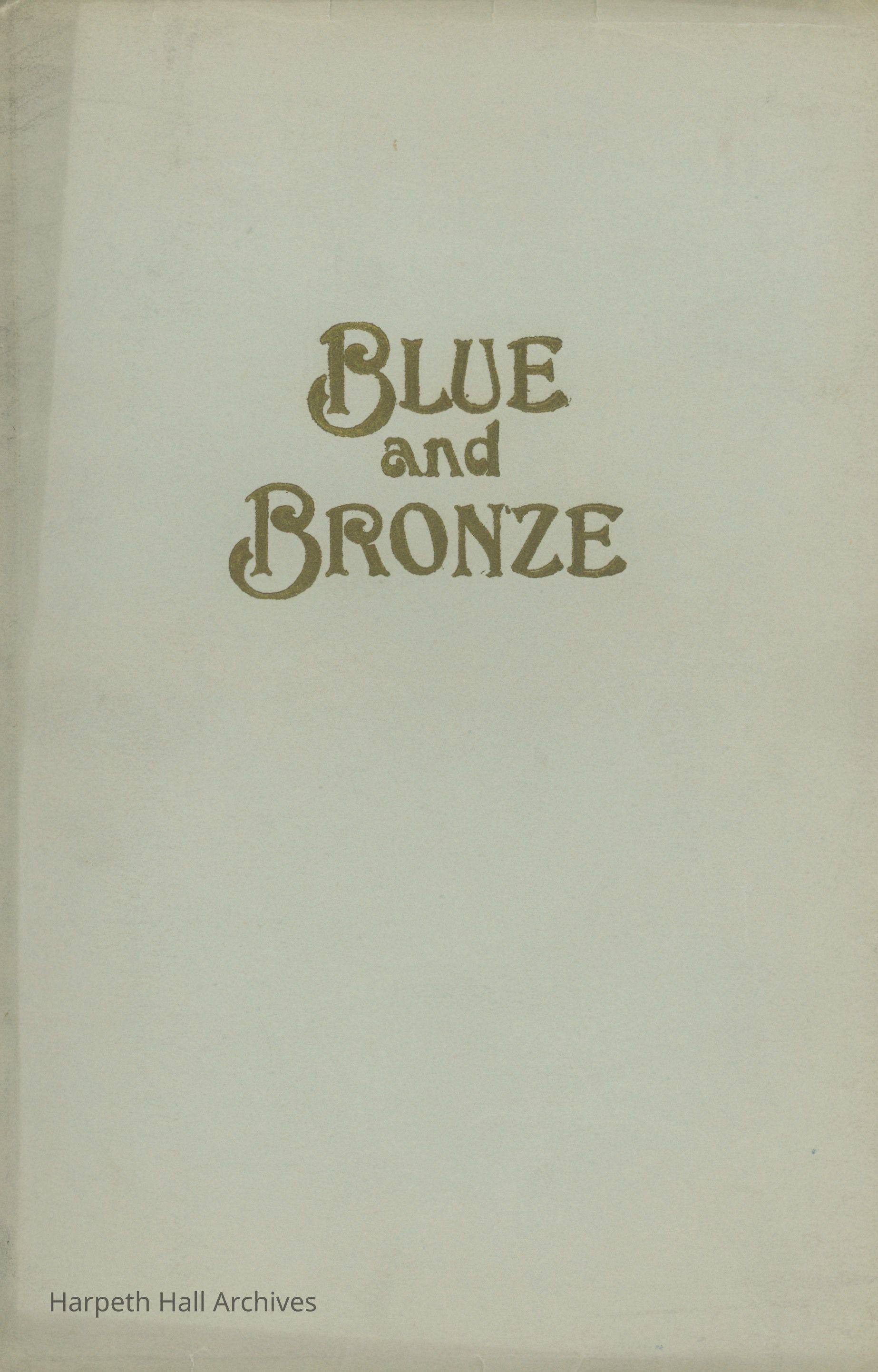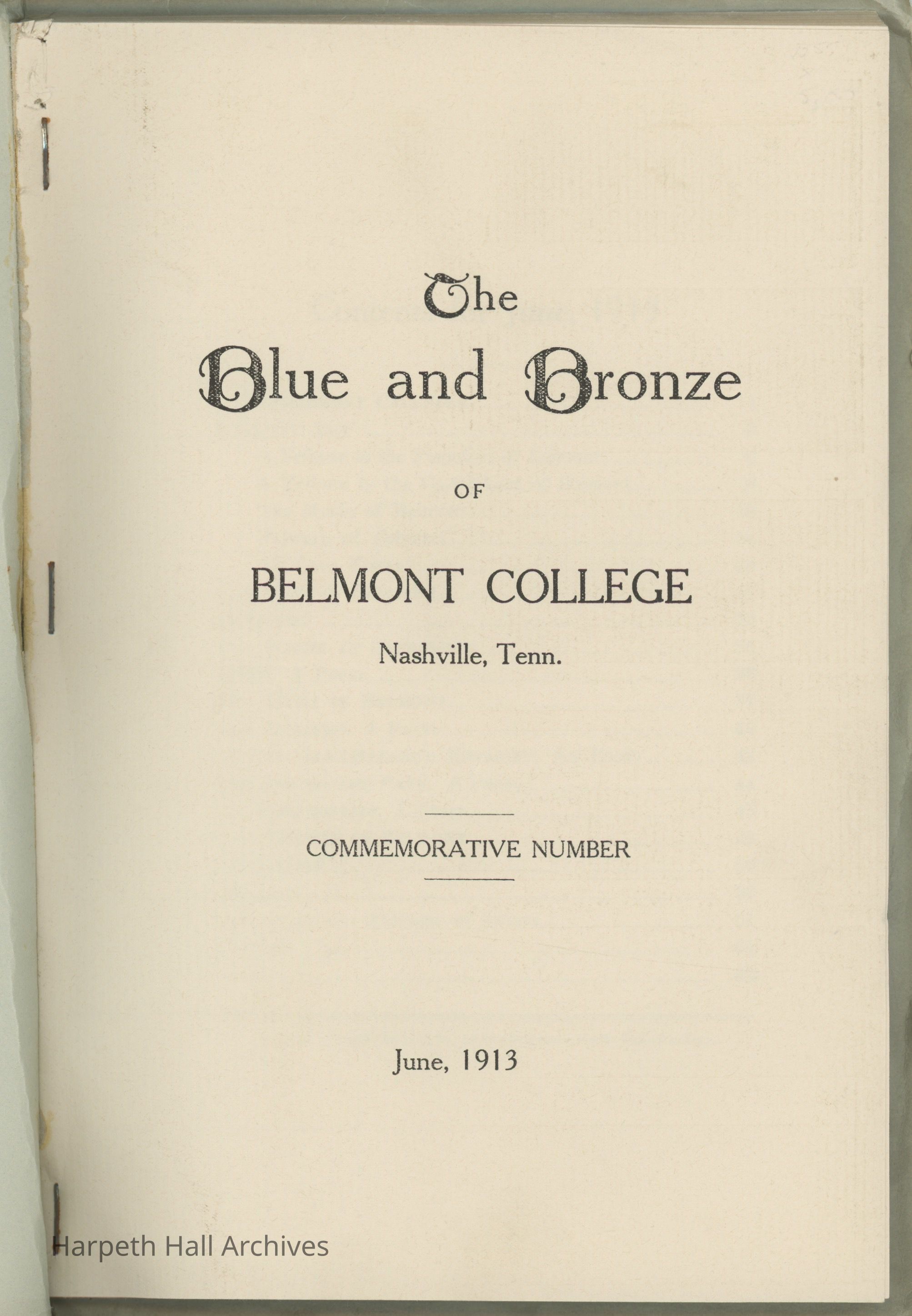A commemorative edition of the Blue and Bronze student publication from Belmont College for Young Women. Dated June 1913. Includes school information and history along with various student writing and poetry.Collection
