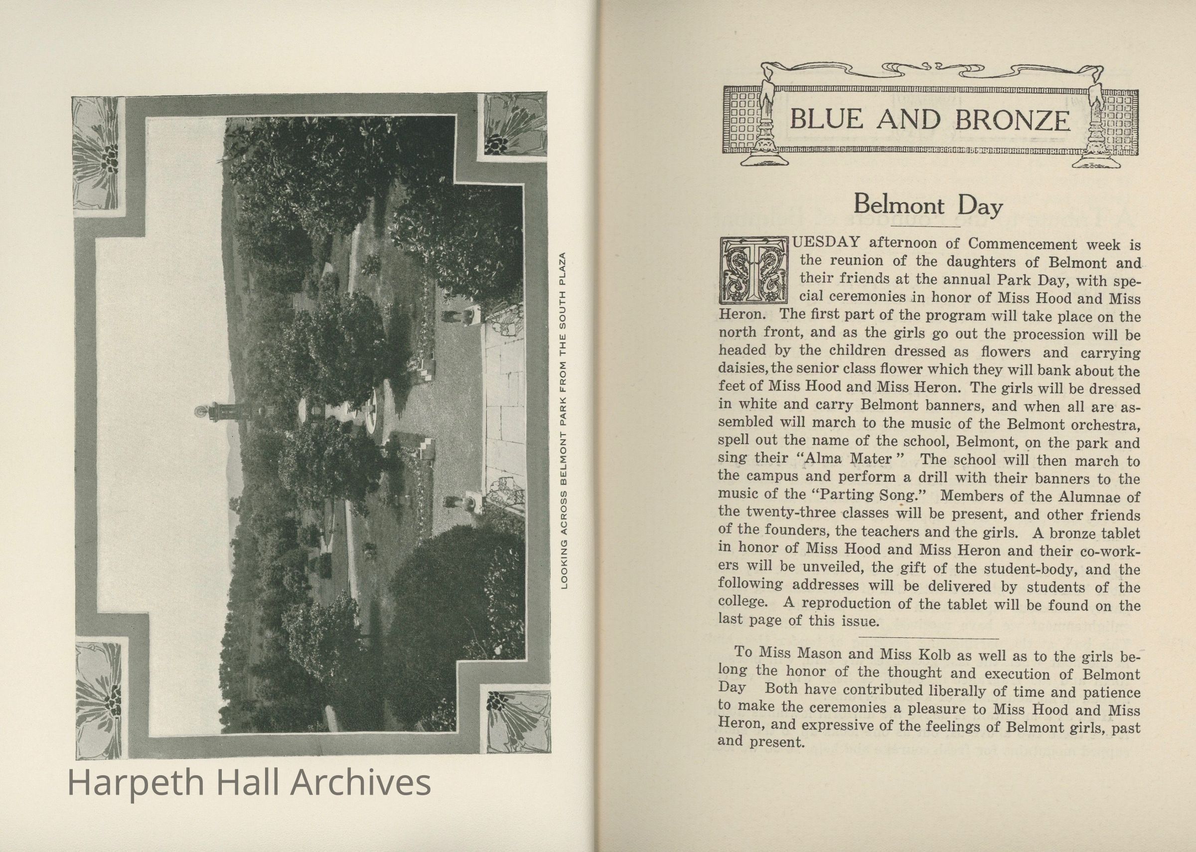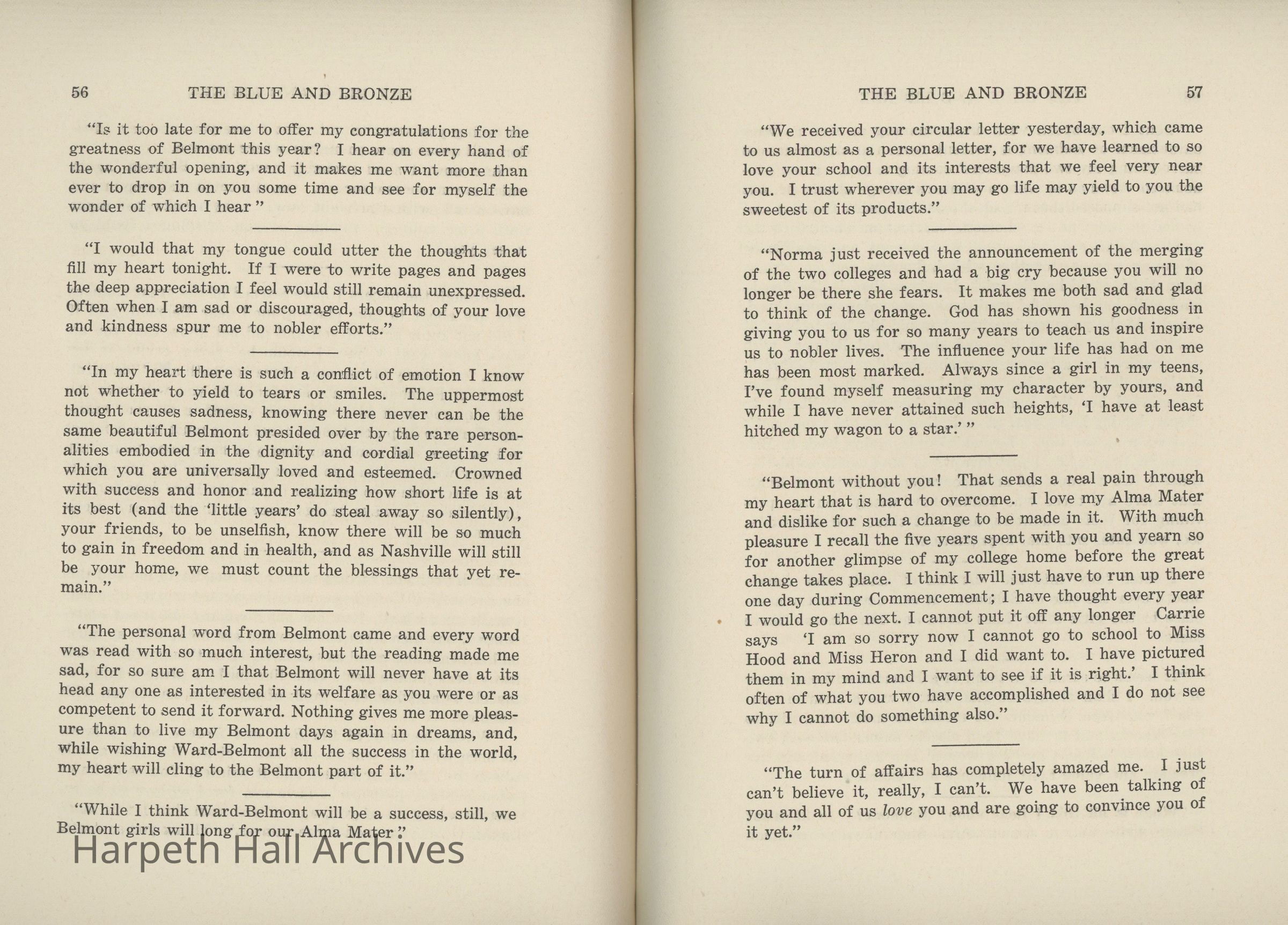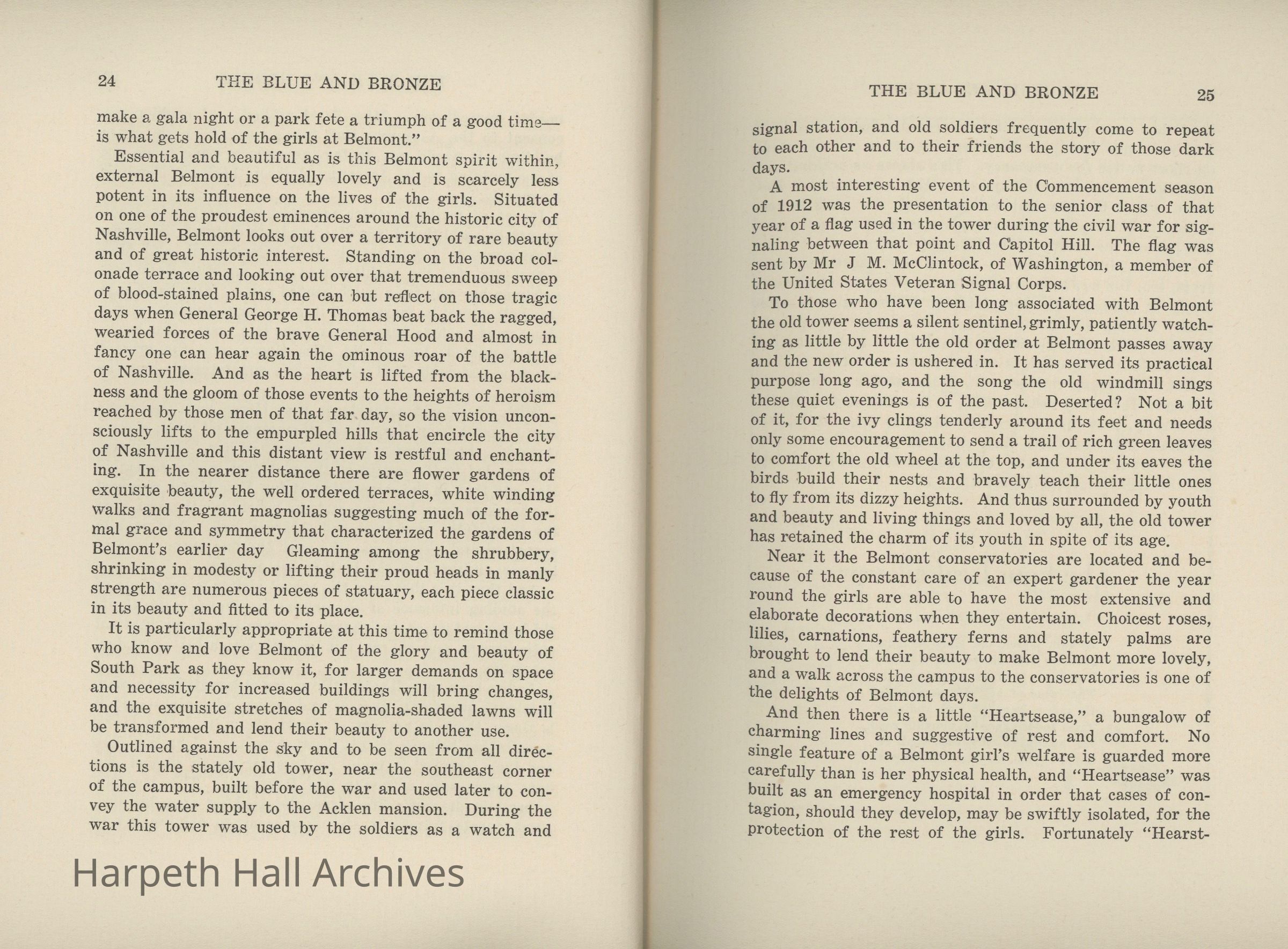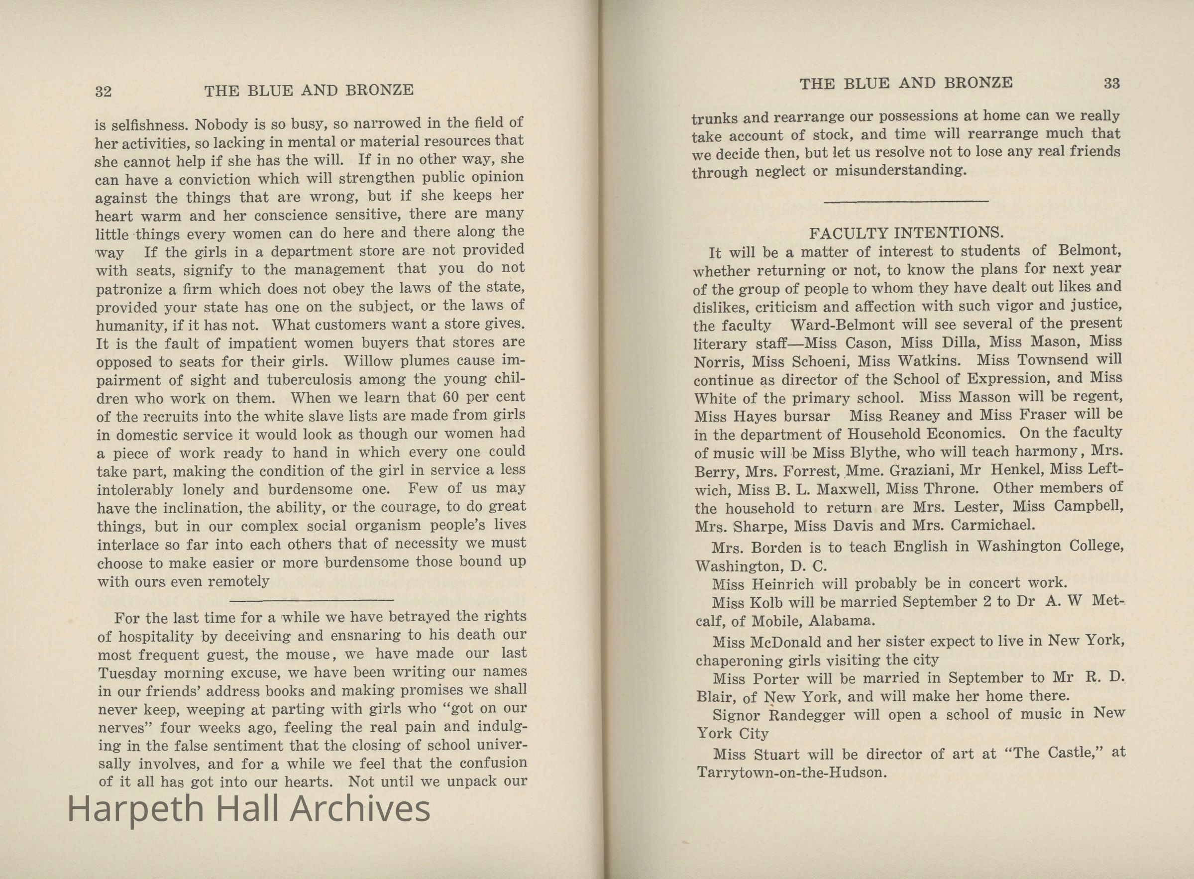 A commemorative edition of the Blue and Bronze student publication from Belmont College for Young Women. Dated June 1913. Includes school information and history along with various student writing and poetry.Collection