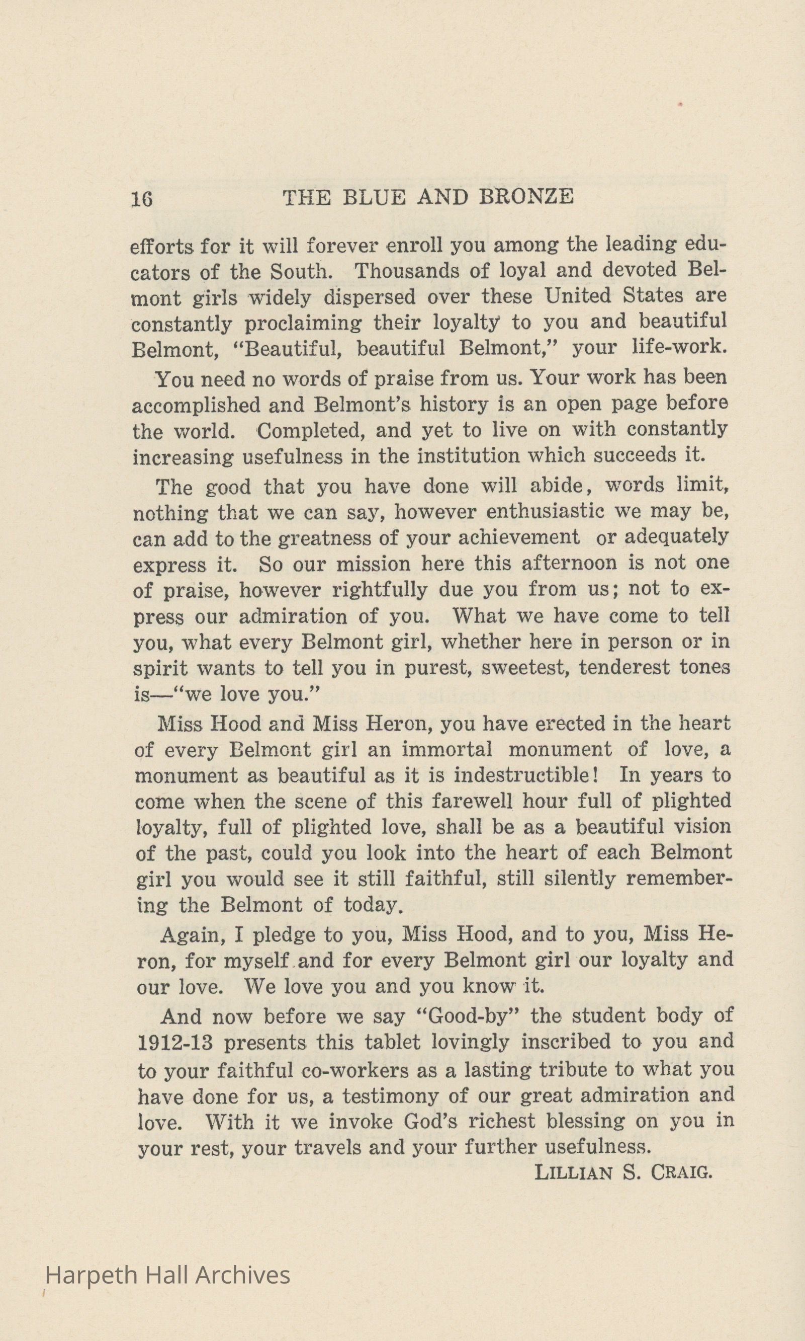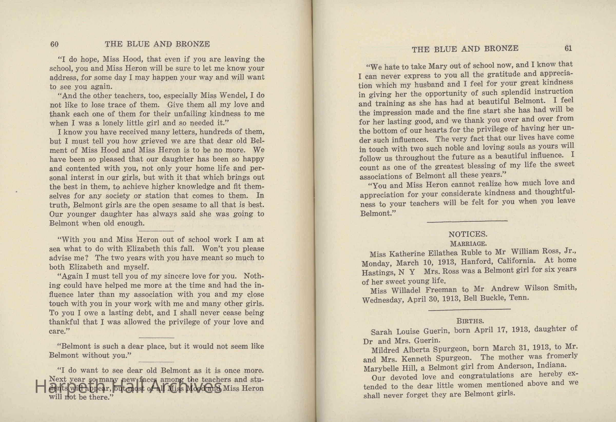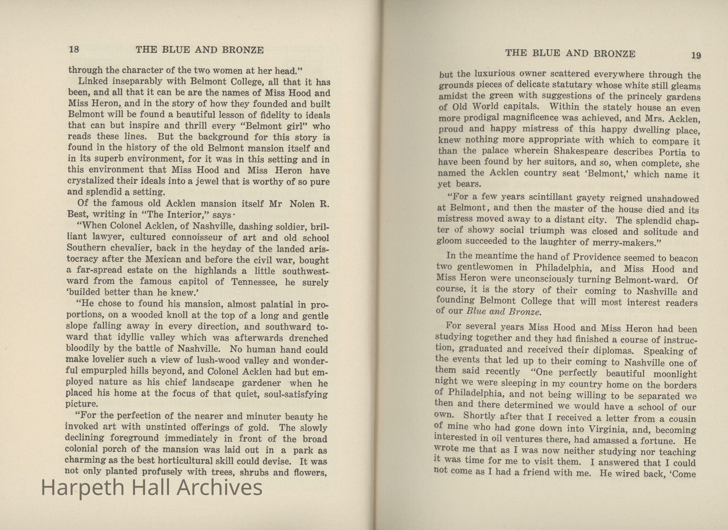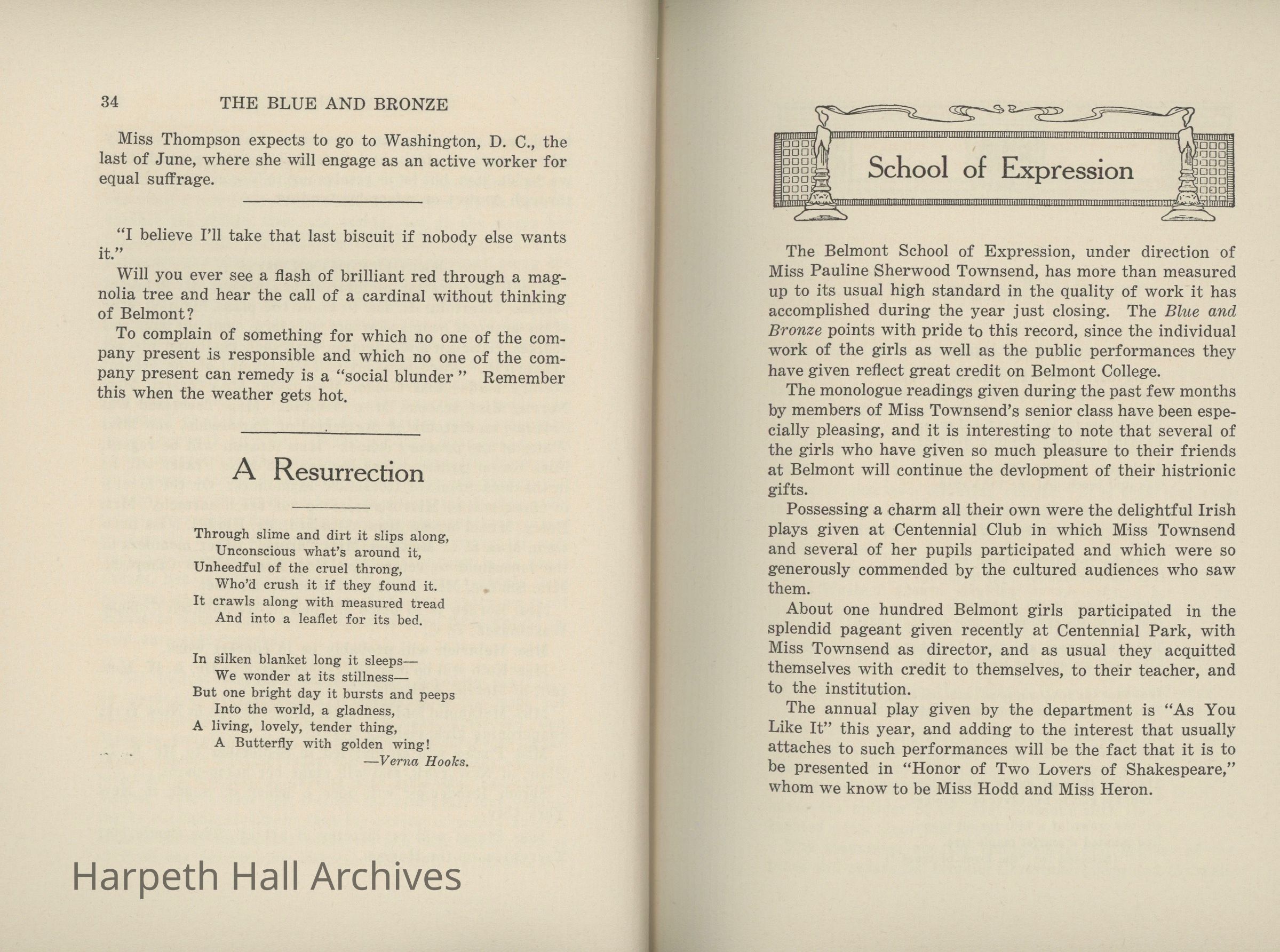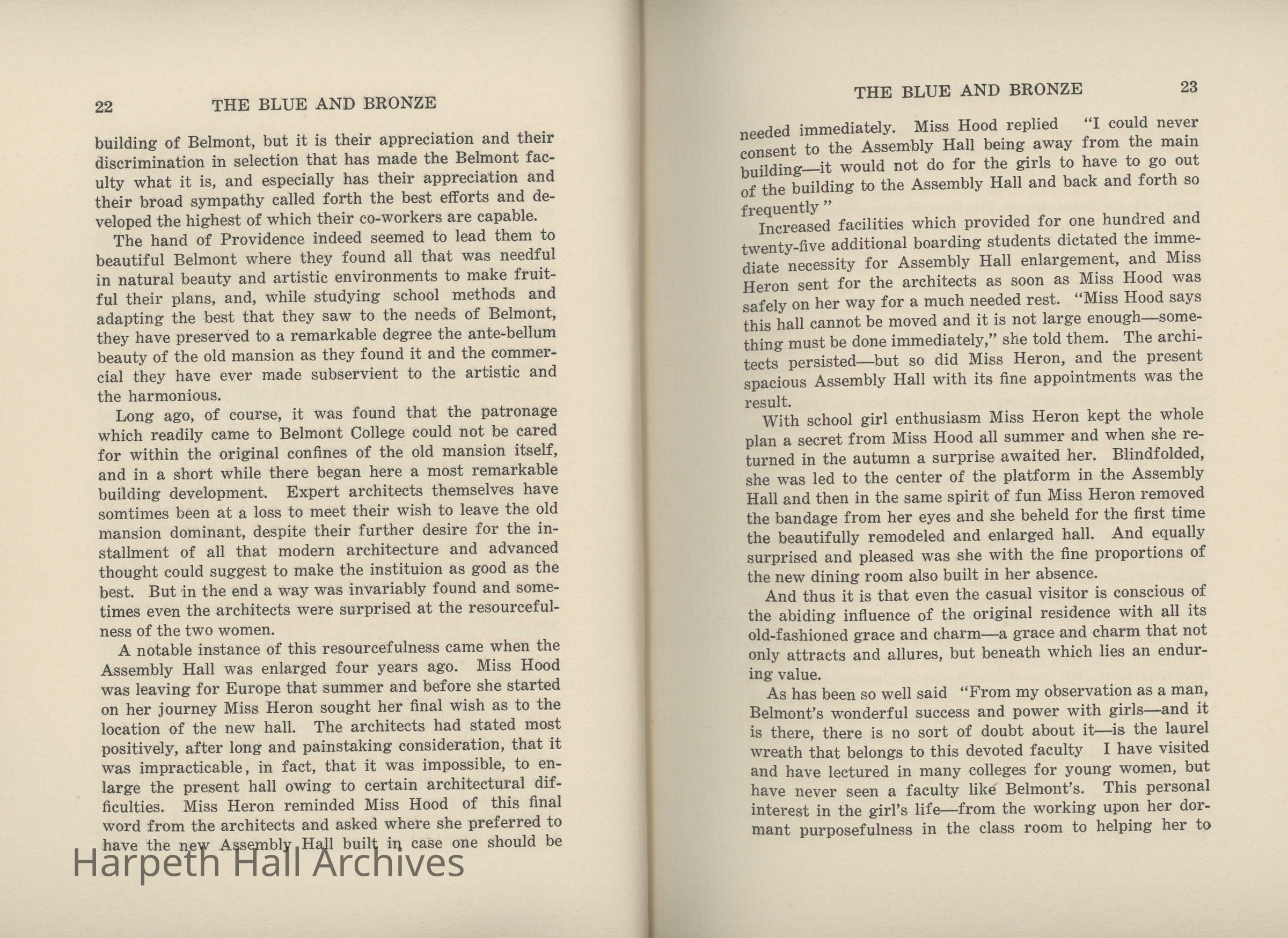 A commemorative edition of the Blue and Bronze student publication from Belmont College for Young Women. Dated June 1913. Includes school information and history along with various student writing and poetry.Collection