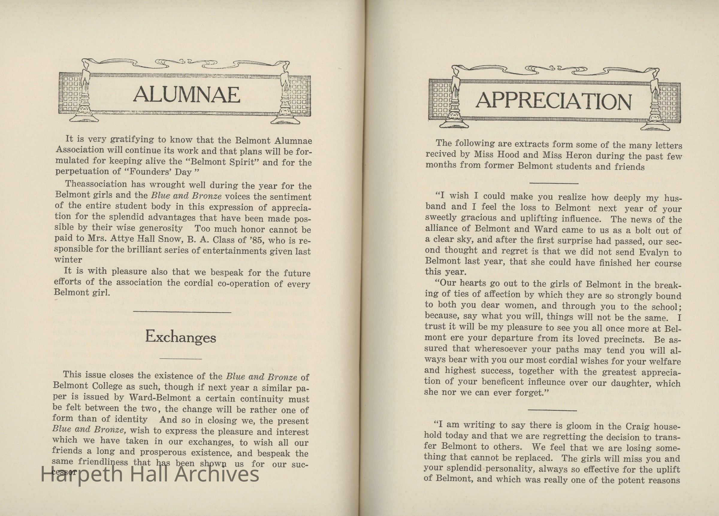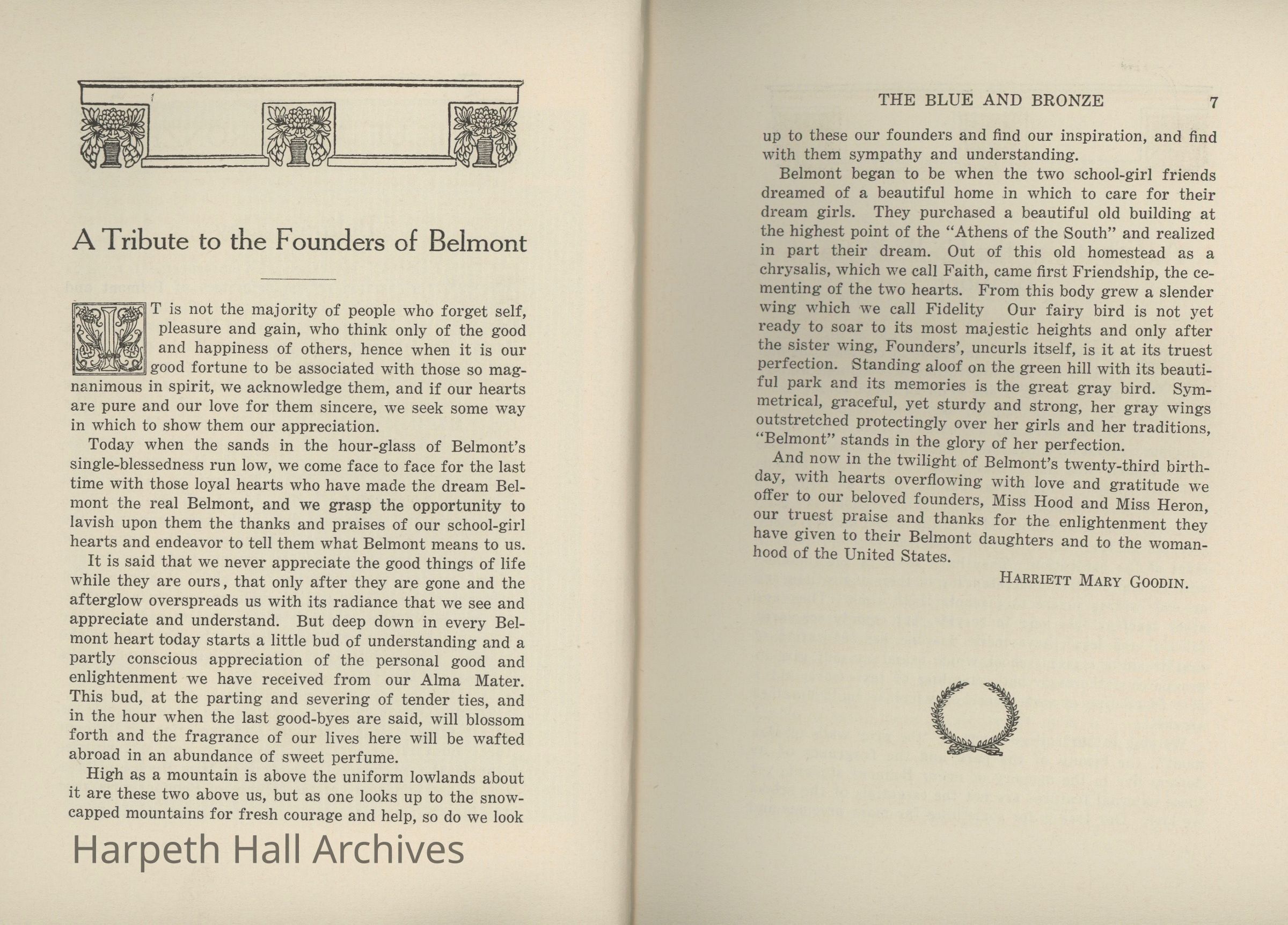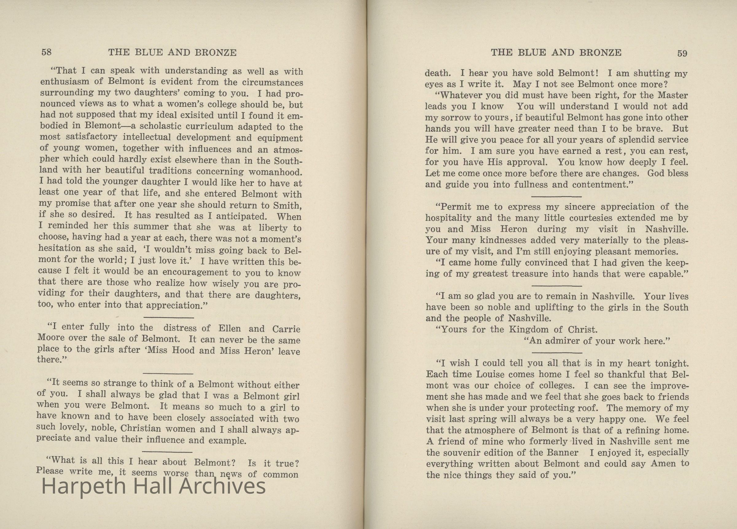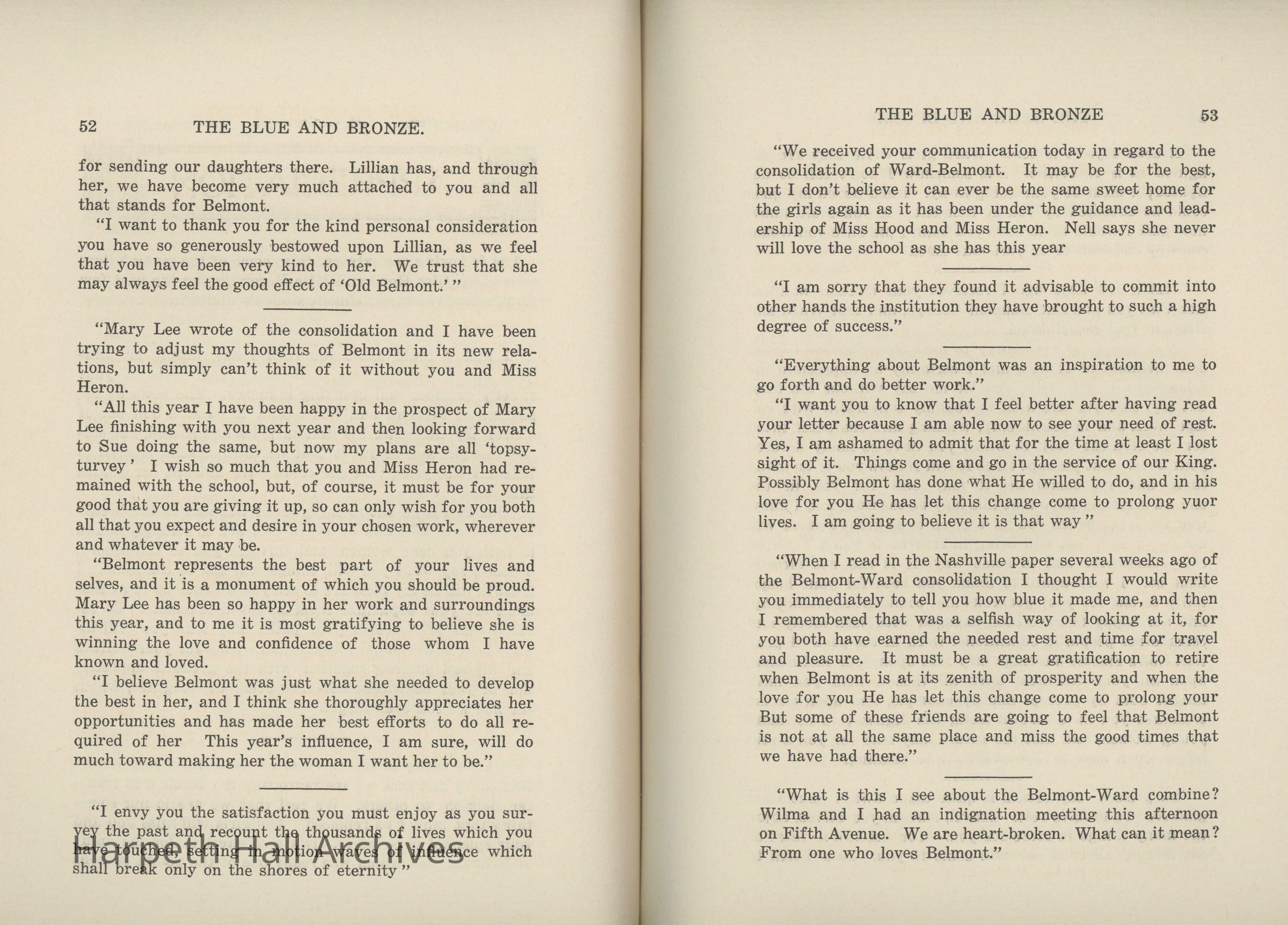 A commemorative edition of the Blue and Bronze student publication from Belmont College for Young Women. Dated June 1913. Includes school information and history along with various student writing and poetry.Collection