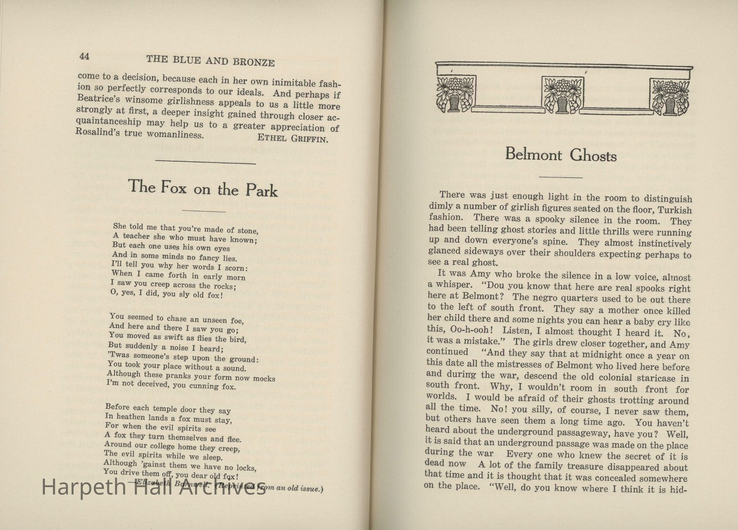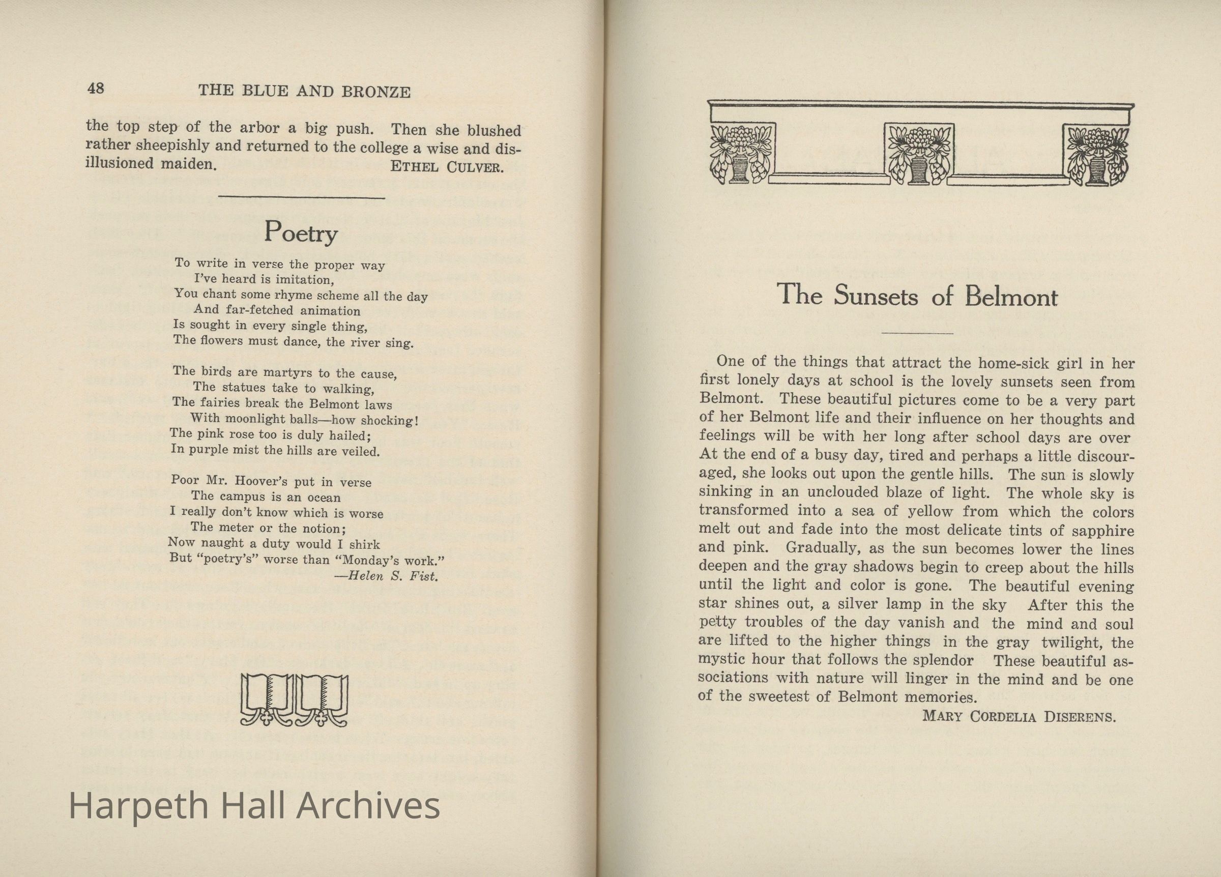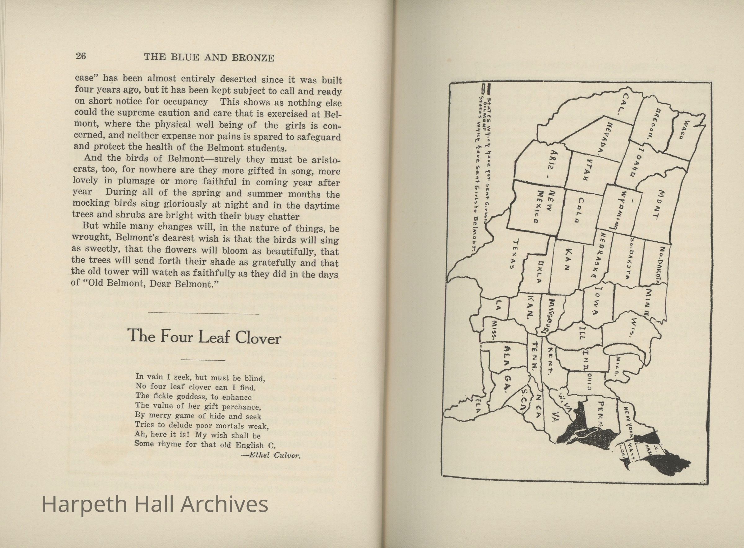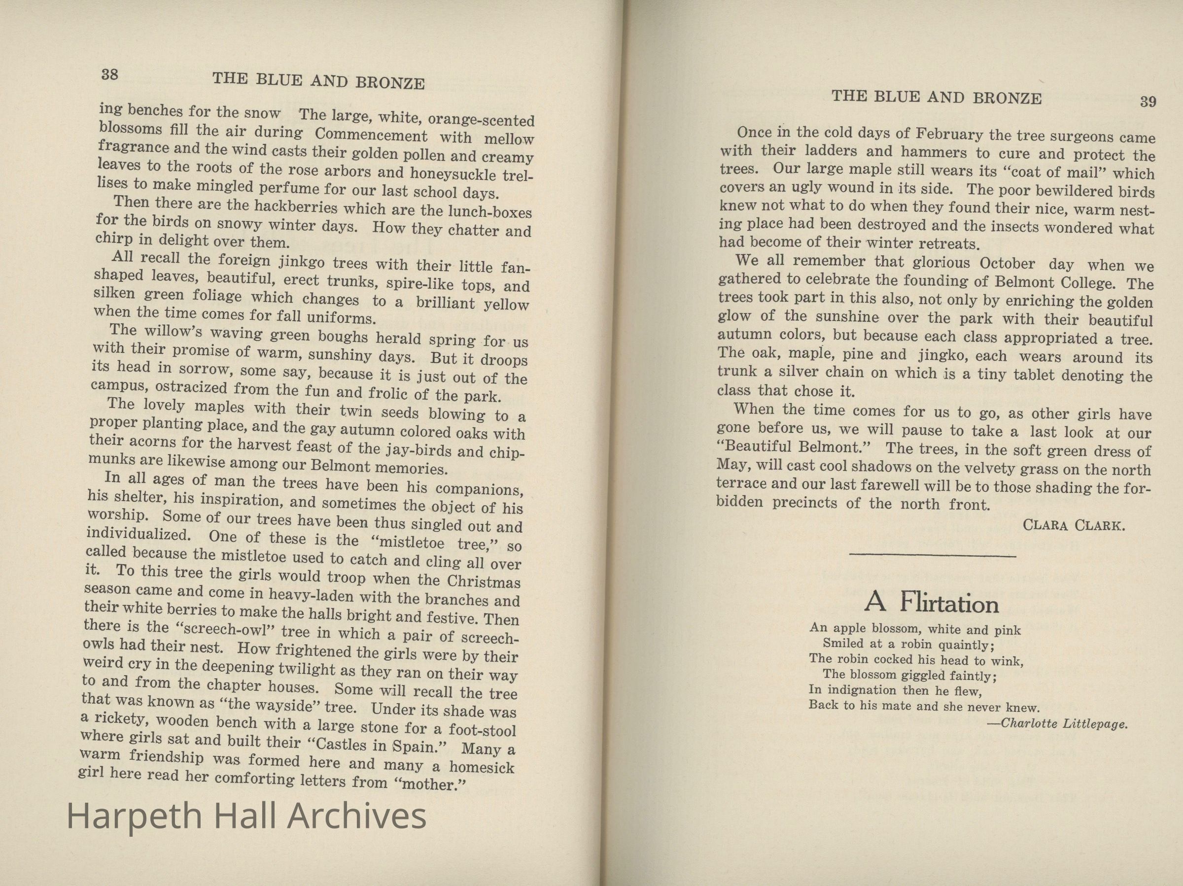 A commemorative edition of the Blue and Bronze student publication from Belmont College for Young Women. Dated June 1913. Includes school information and history along with various student writing and poetry.Collection