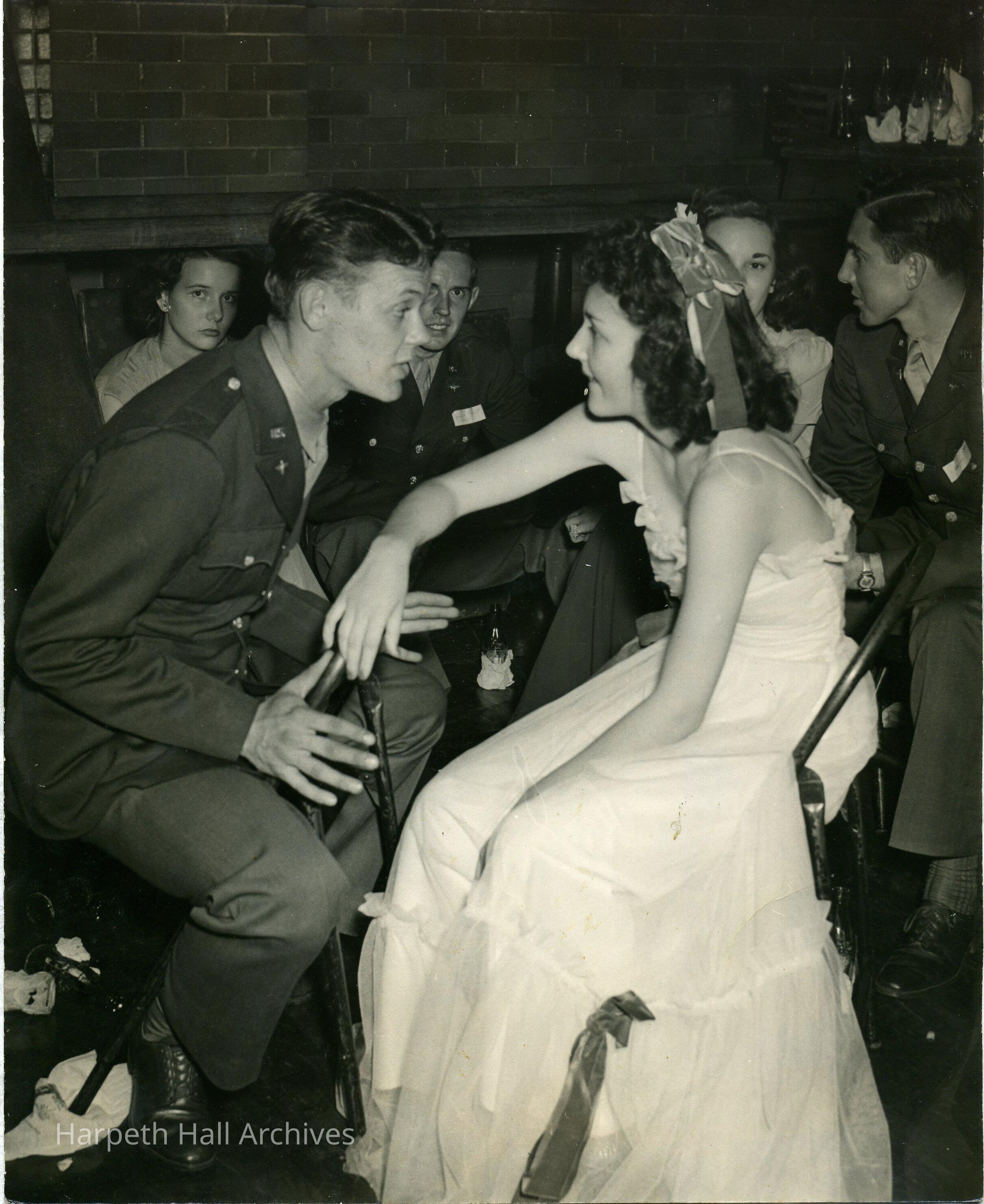 Party scene, 3 couples, ladies in gowns, men in military uniforms, candid photo. Sitting on folding chairs in front of brick fireplace, possibly a club house, possibly Valentine's Day dance? Empty glass soda bottles litter the background. Probably featured in Milestones.Collection