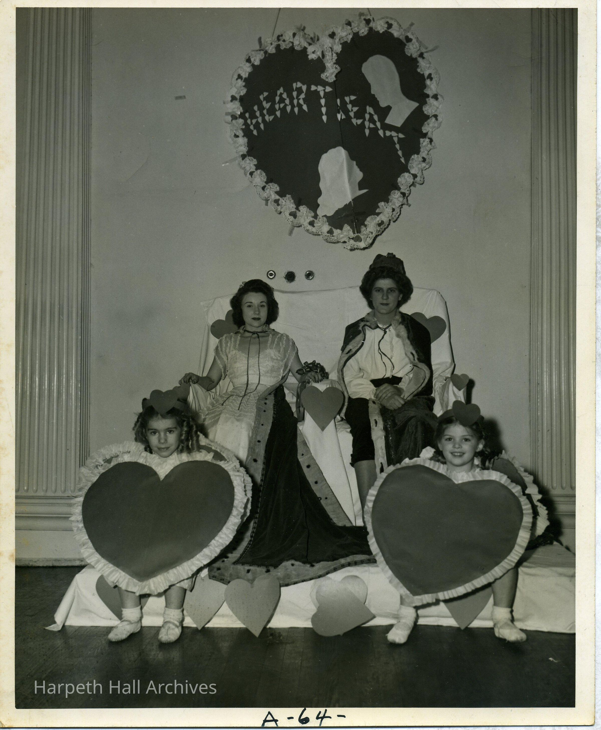 Presentation of the King and Queen of Hearts at the Annual Valentines' Day Banquet, sponsored by the Y.W.C.A. Club. 2 young ladies and 2 young girls holding heart shapes. This picture appeared in the 1946 Milestones. Identified as Florida Faulk (King) and Petite Joan Ryerson (Queen).