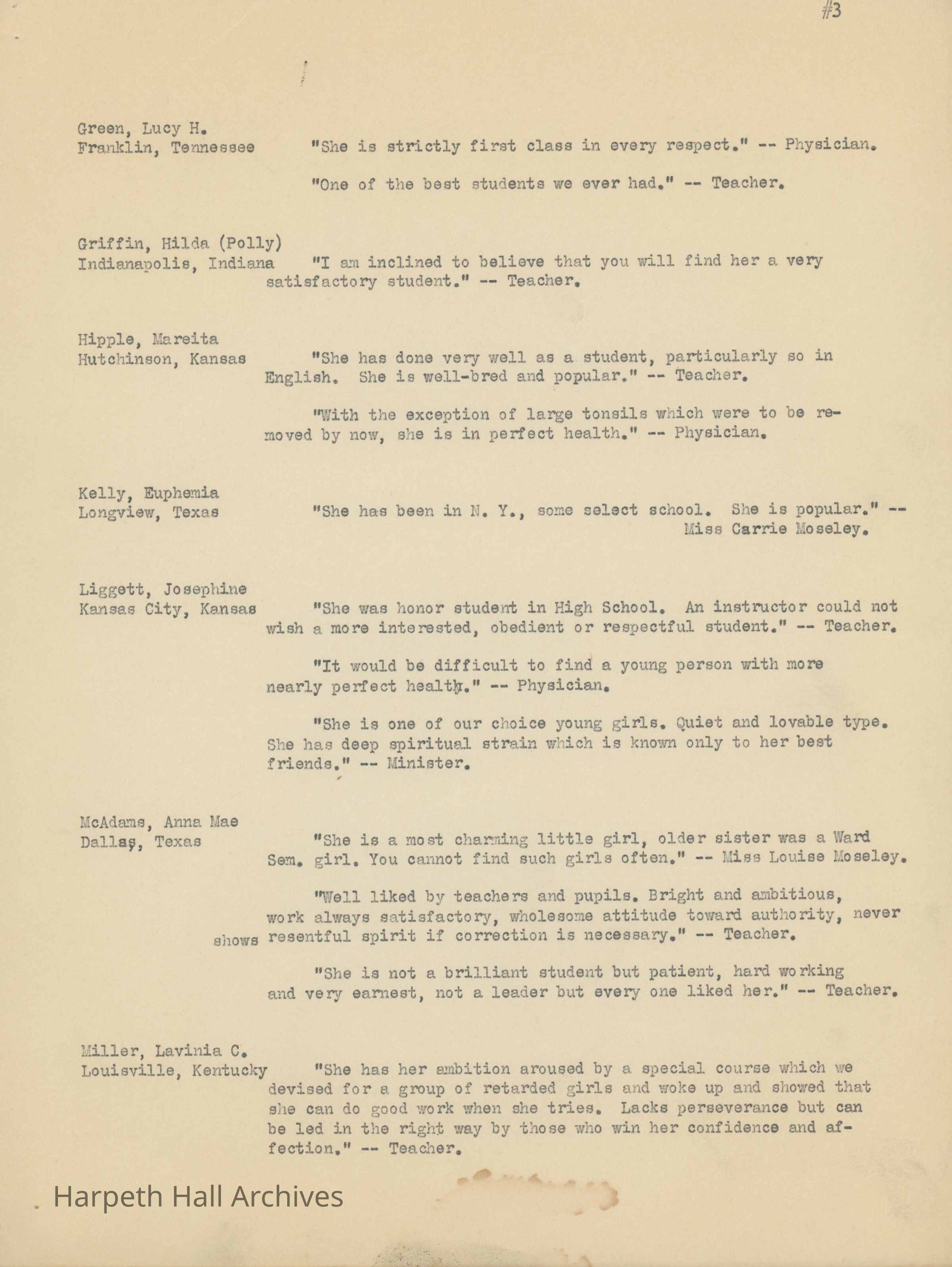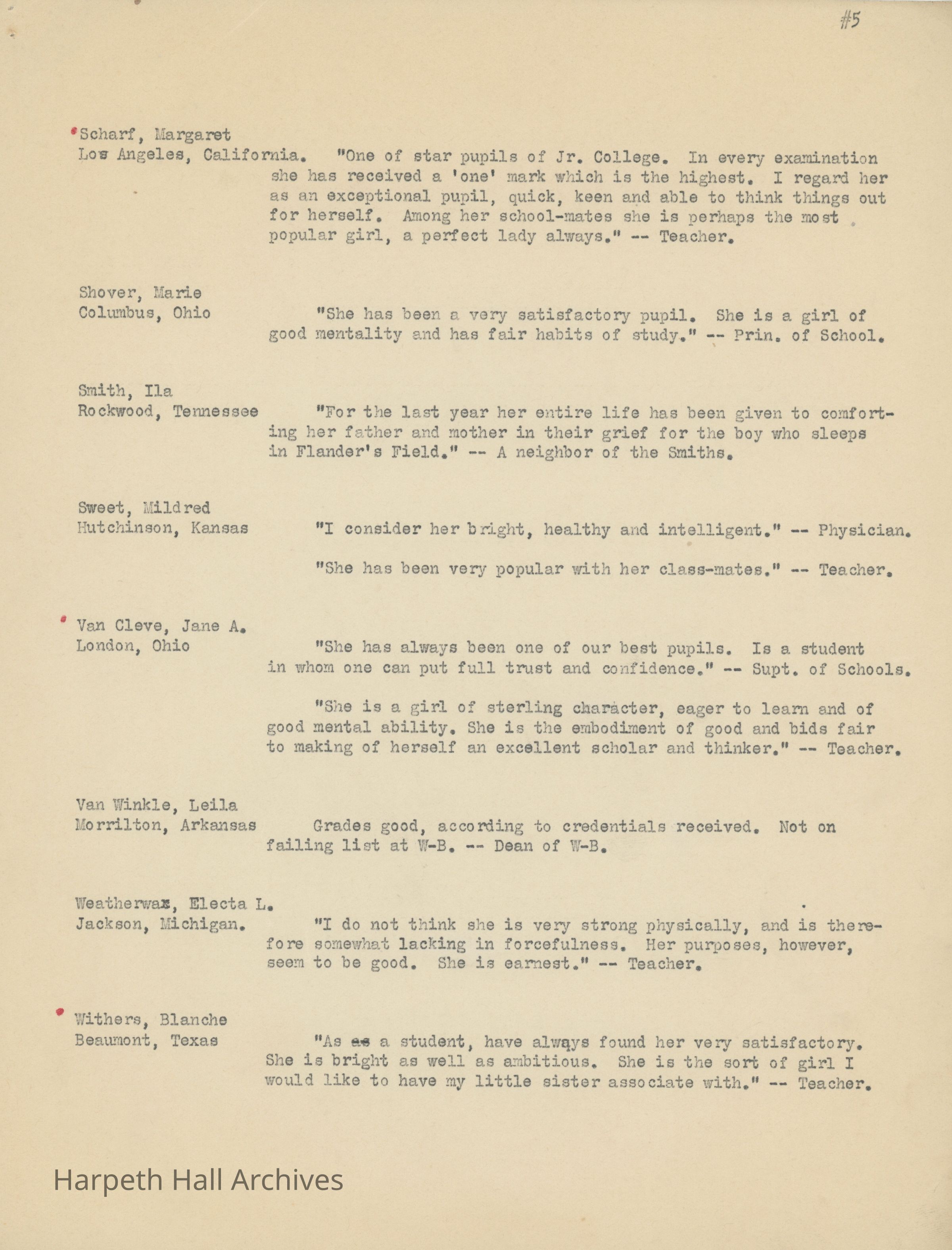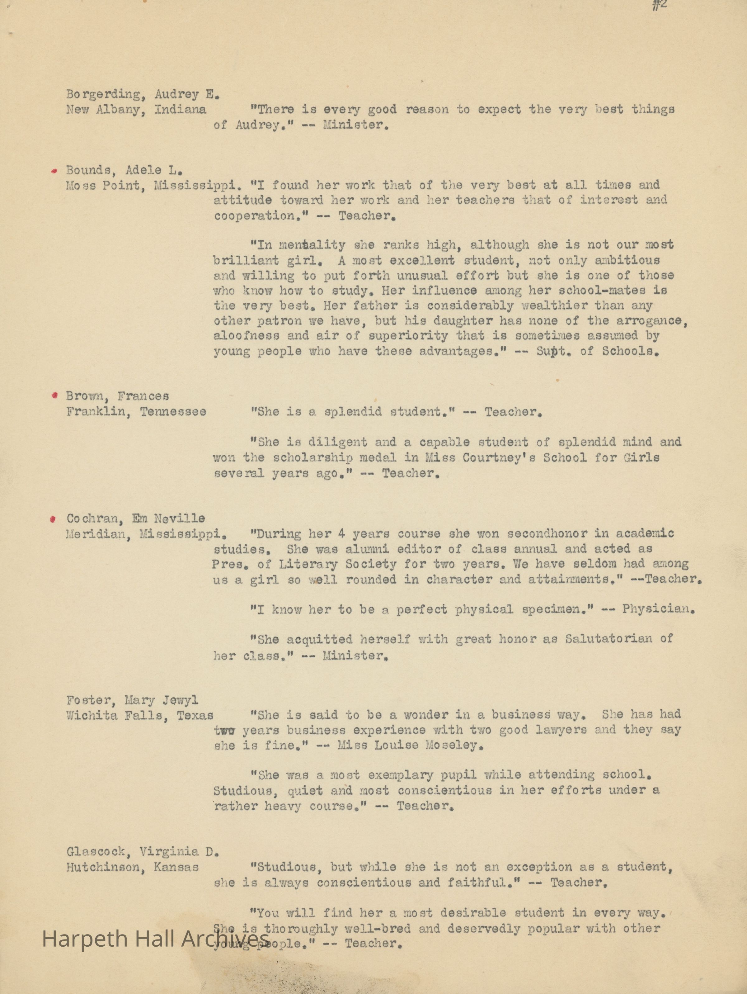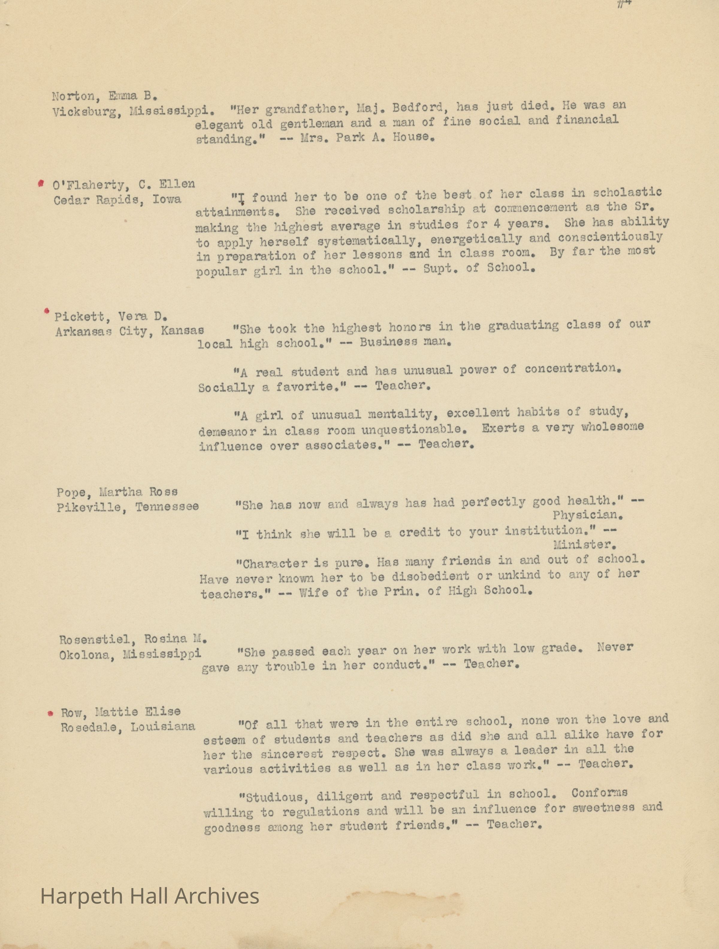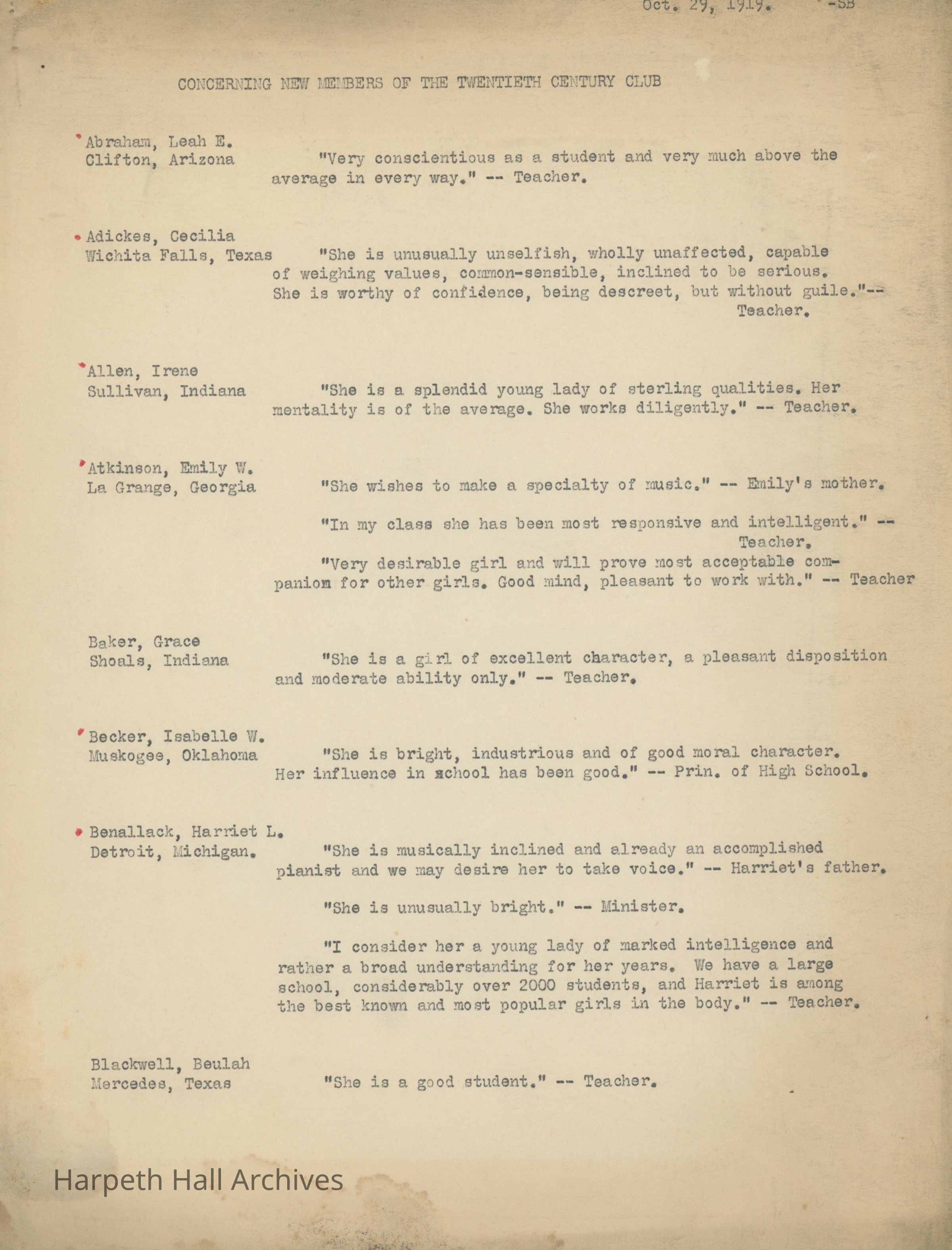 A document dated October 29, 1919, listing all new members of the Twentieth Century Club by name and home city/state. Various testimonials are listed concerning each student, with information gathered from teachers, ministers, principals, parents, physicians, school superintendents, neighbors, and others. Multiple names are marked with a red dot.Context