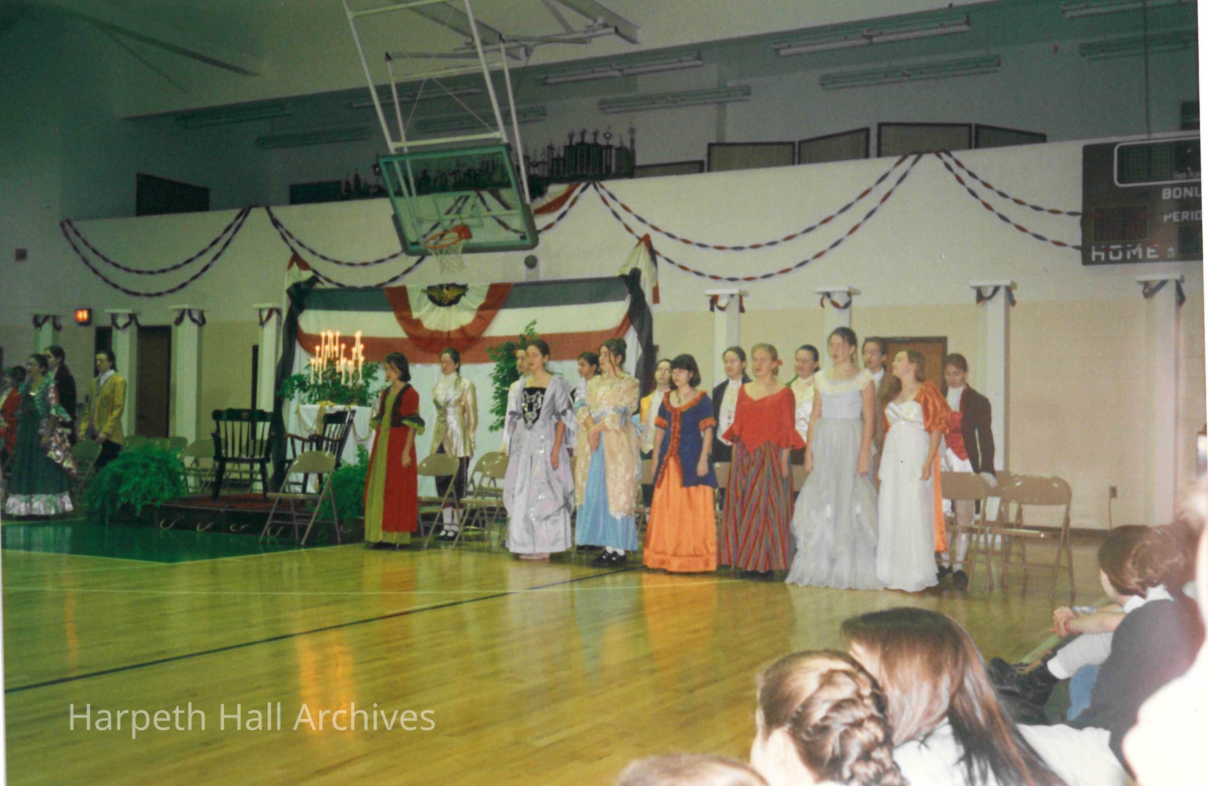 Students performing in the George Washington Day Celebration. The photo was taken in Morrison Gym in the McMurry Center.Context
