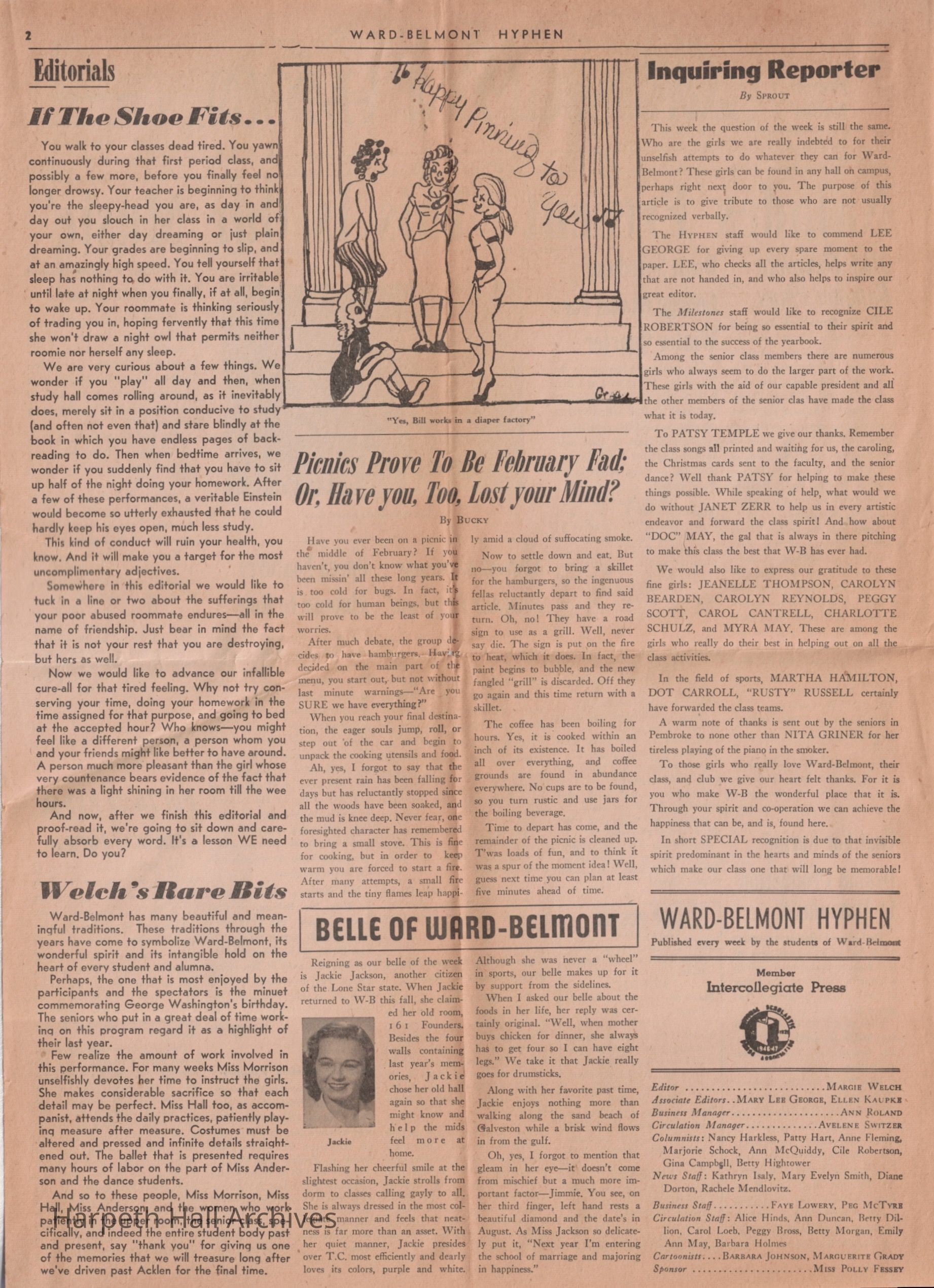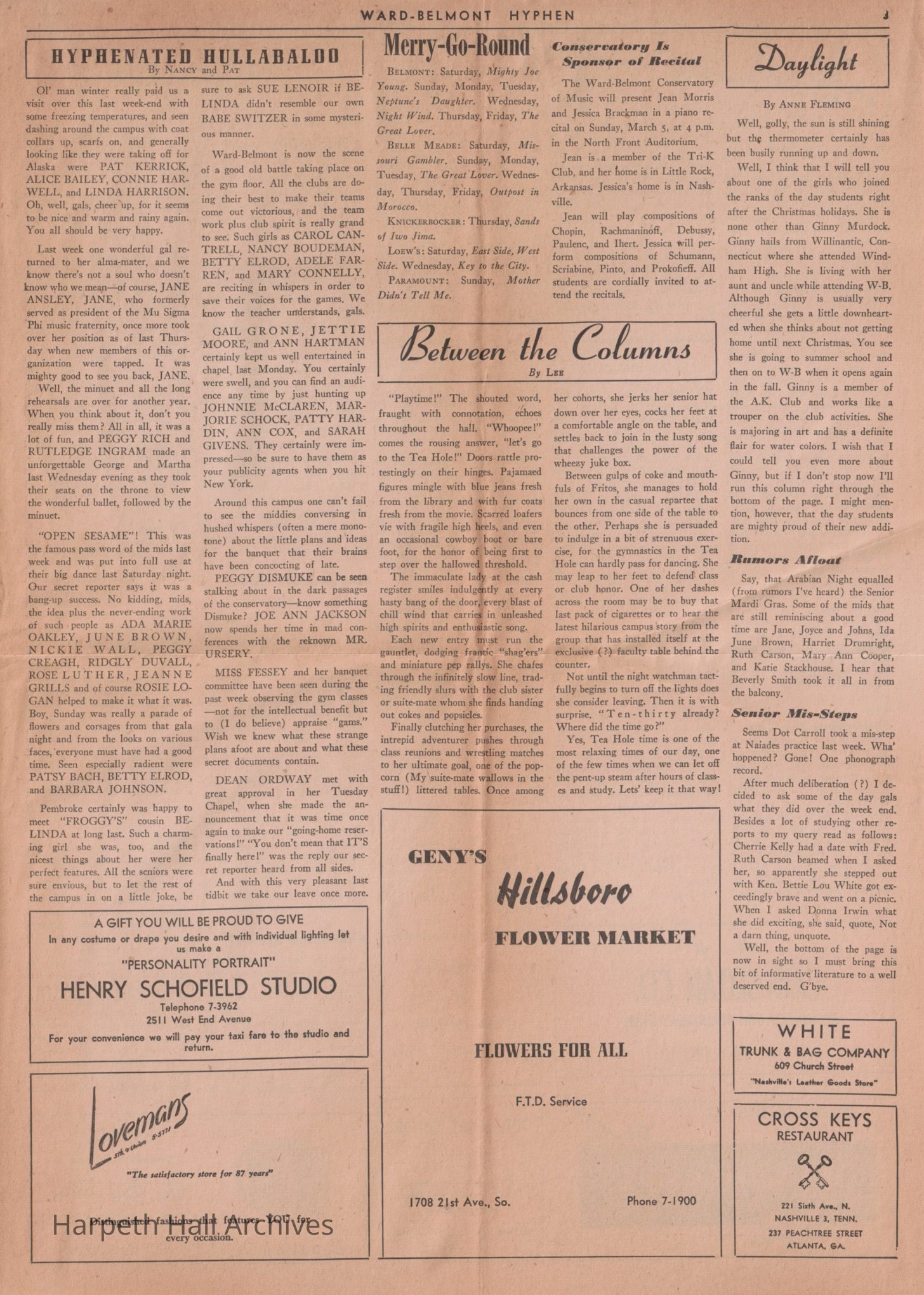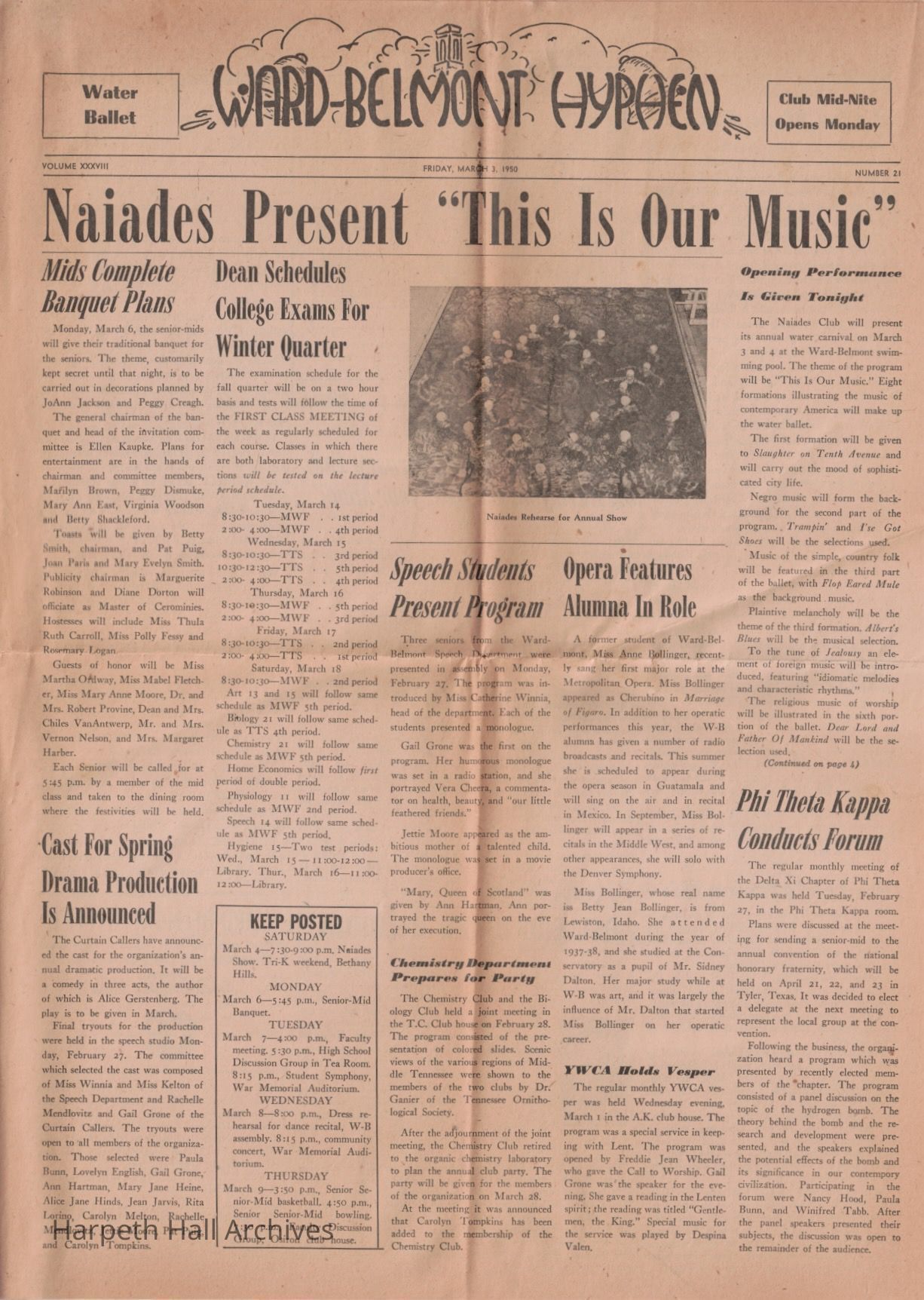 Volume 38 of Ward-Belmont's newspaper, "Hyphen". This volume includes articles on exams, the speech program various clubs, important dates, the spring drama production, editorials, and more.Collection