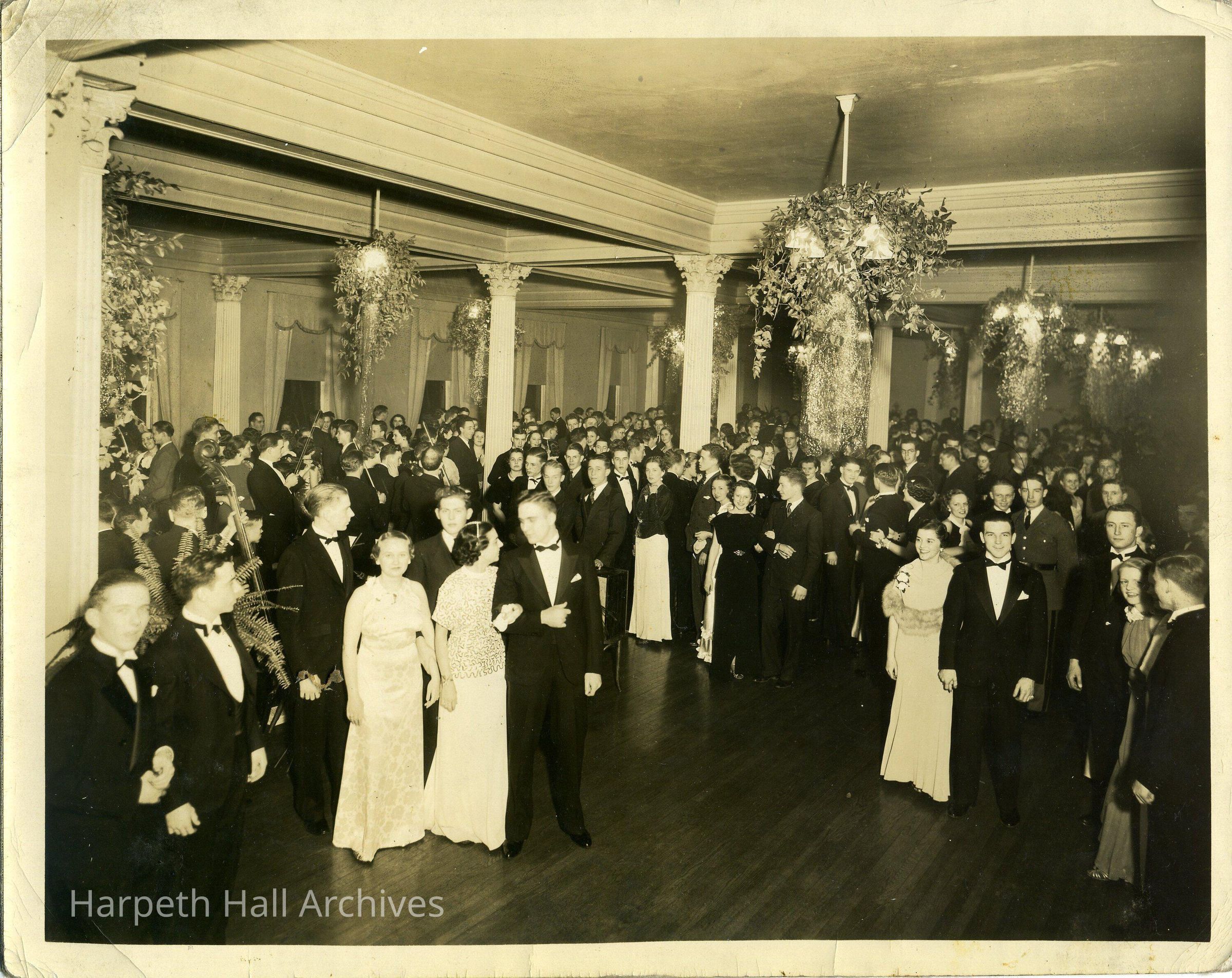 Crowd of men and women at a dance in formal attire. Stringed instruments (violen and cello?) visible to the left. Possibly in Corinthian room in Ward-Belmont.