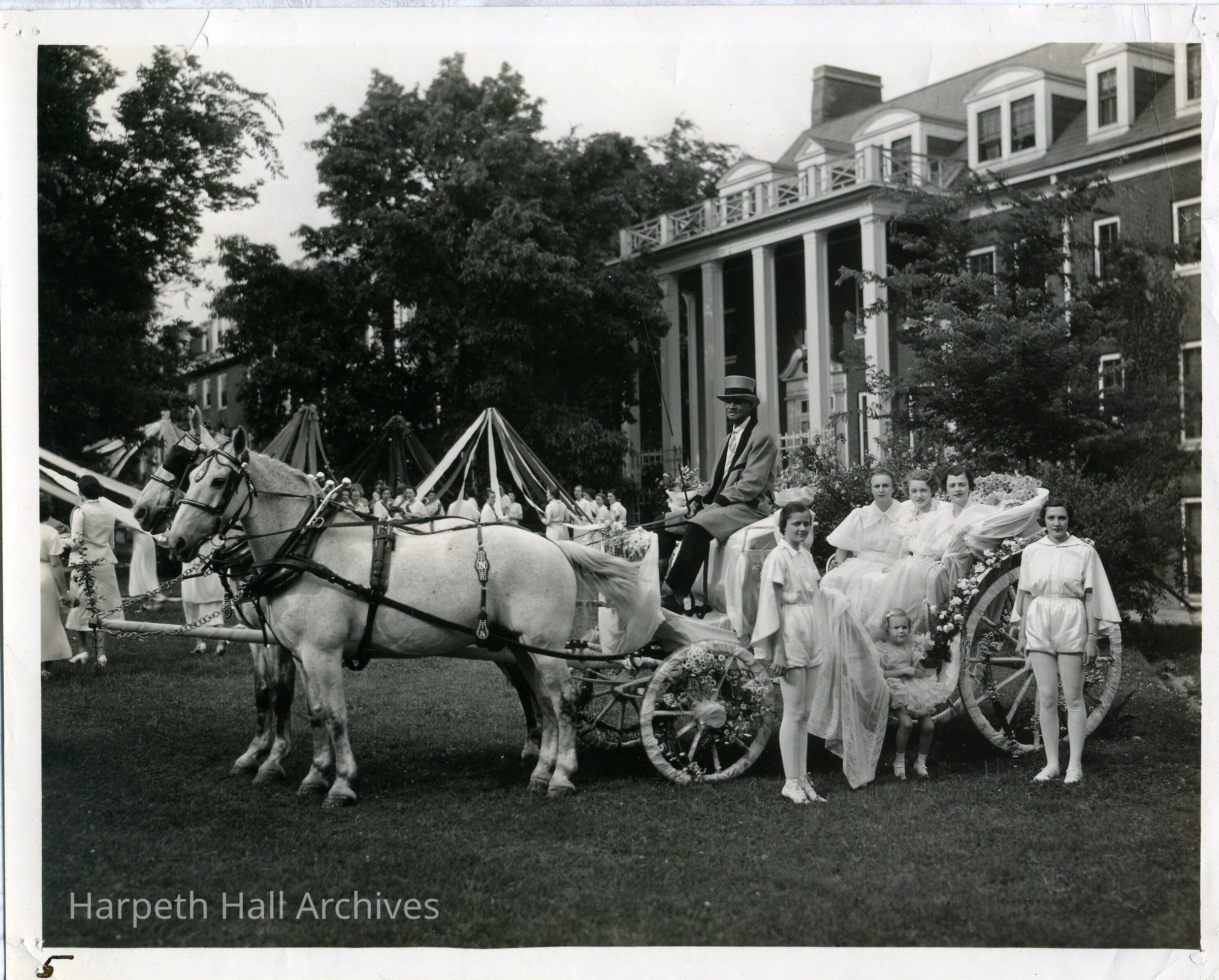 photo of carriage, driver, 2 white horses and carriage. 3 ladies sit in carriage, 2 stand on either side. More people are in the background with maypoles. Seated in the carriage, left to right, Antoinette Treadway (College Maid), Virginia Lynn Shaw (Queen), Virginia Lee Smith (Prep Maid). Lady standing on the left as Ellen Bowers Hofstead; lady standing on the right as Louise Douglas Morrison. 1935.