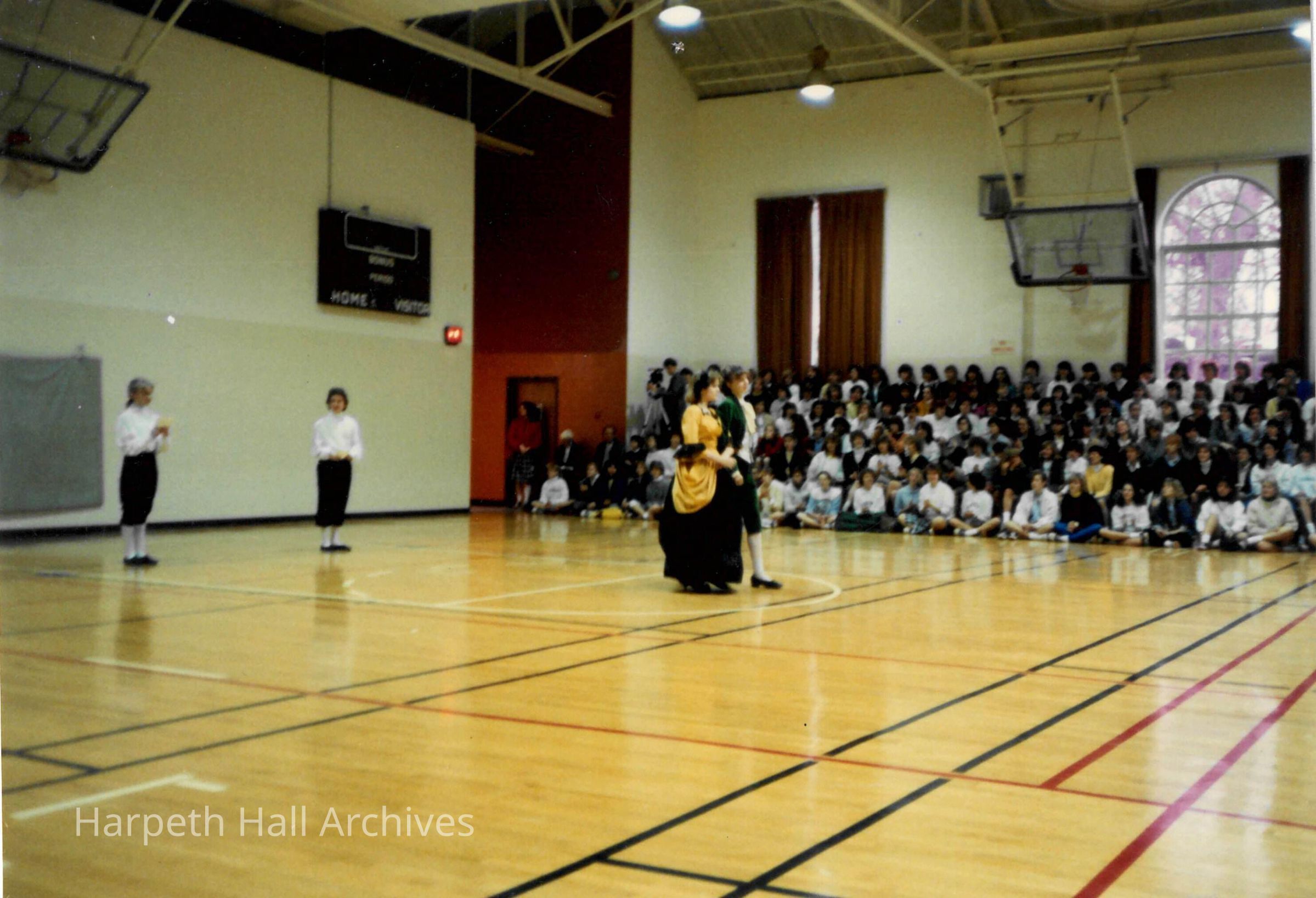A group of seventh grade students performing in the George Washington Day Celebration. The photo is taken in the Morrison Gym in the McMurry Center.Context