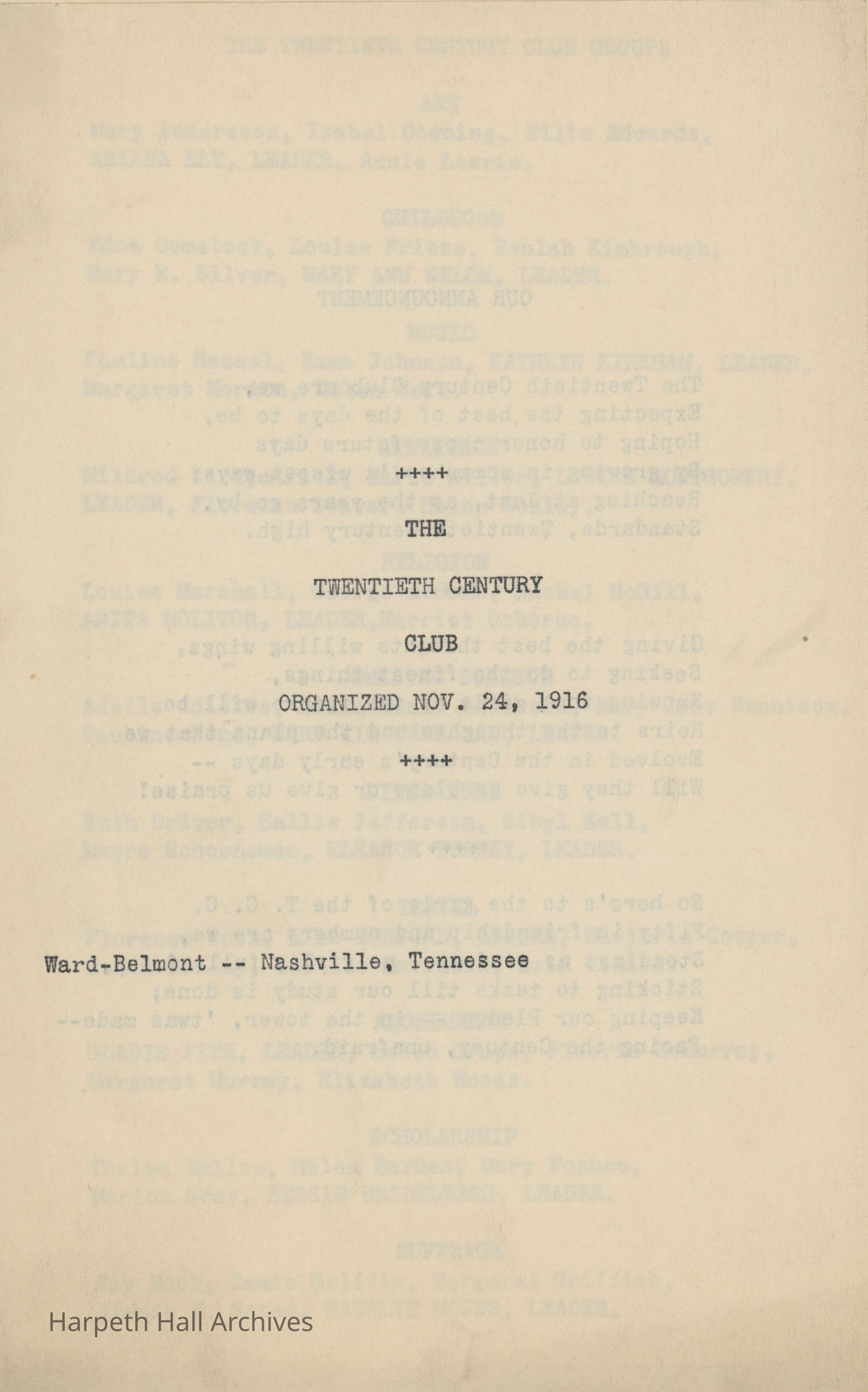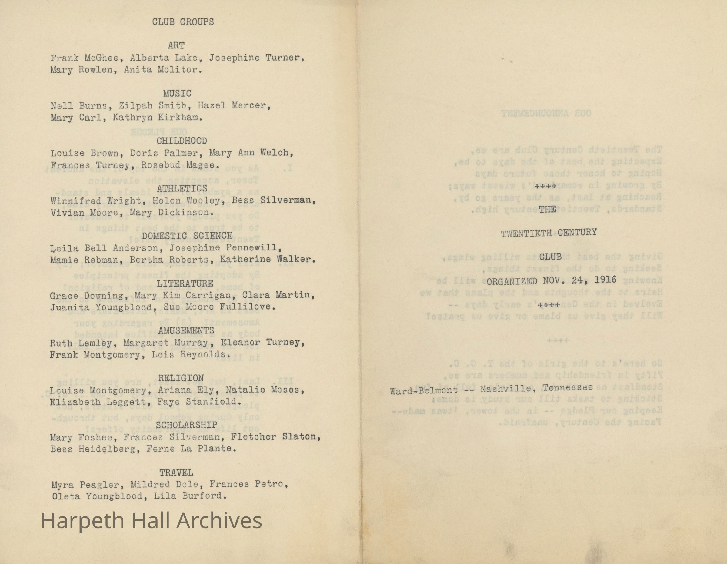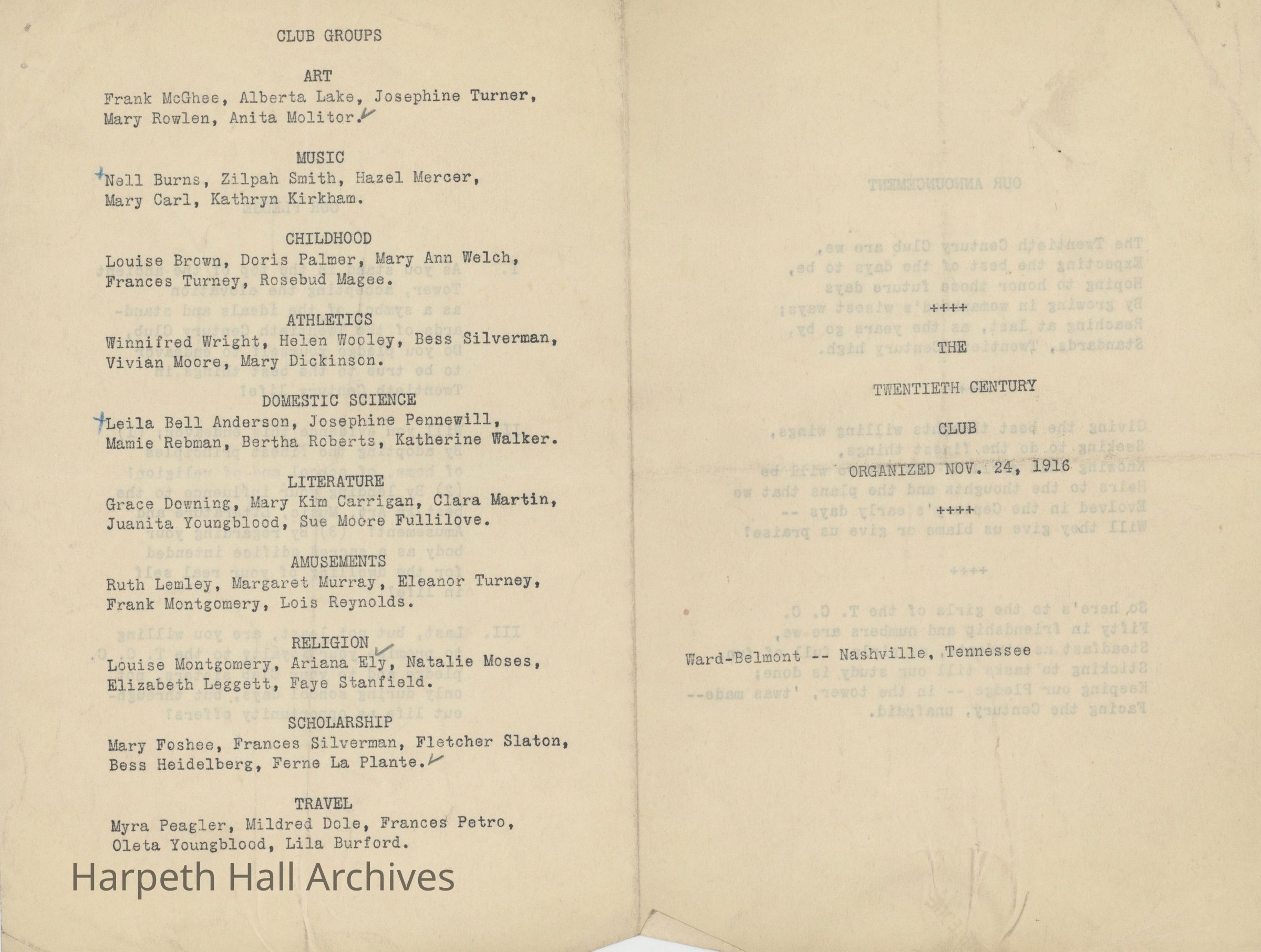 A collection of documents for the Ward-Belmont Twentieth Century Club session of 1916-17. Includes a pamphlet detailing the club announcement, pledge, and a list of club groups with associated members (art, music, childhood, athletics, domestic science, literature, amusements, religion, scholarship, and travel); a pamphlet detailing the programs by club groups throughout January, February, March, April, and May of 1917; and documents listing the aforementioned club groups and associated members as well as various club information.Context