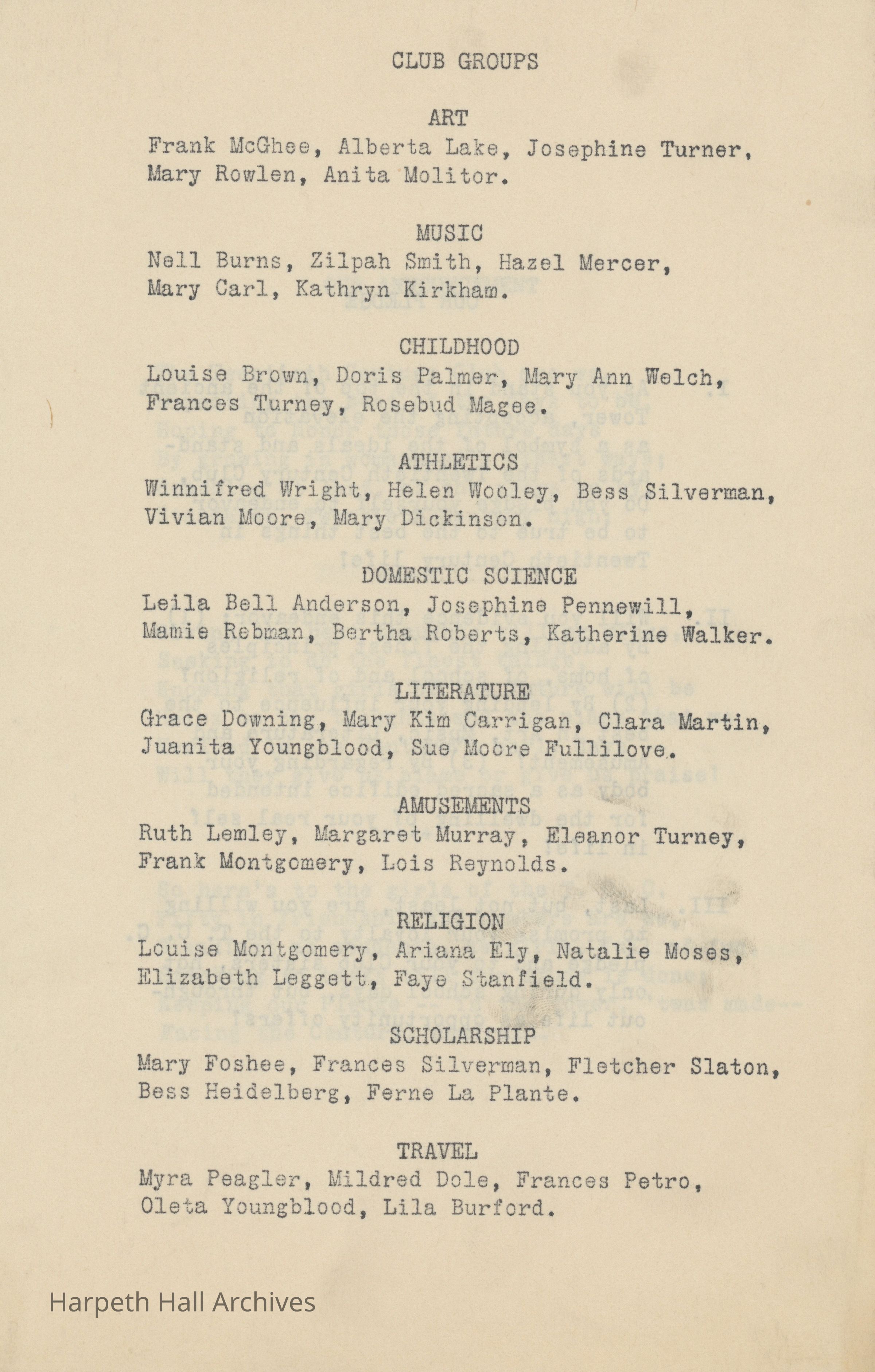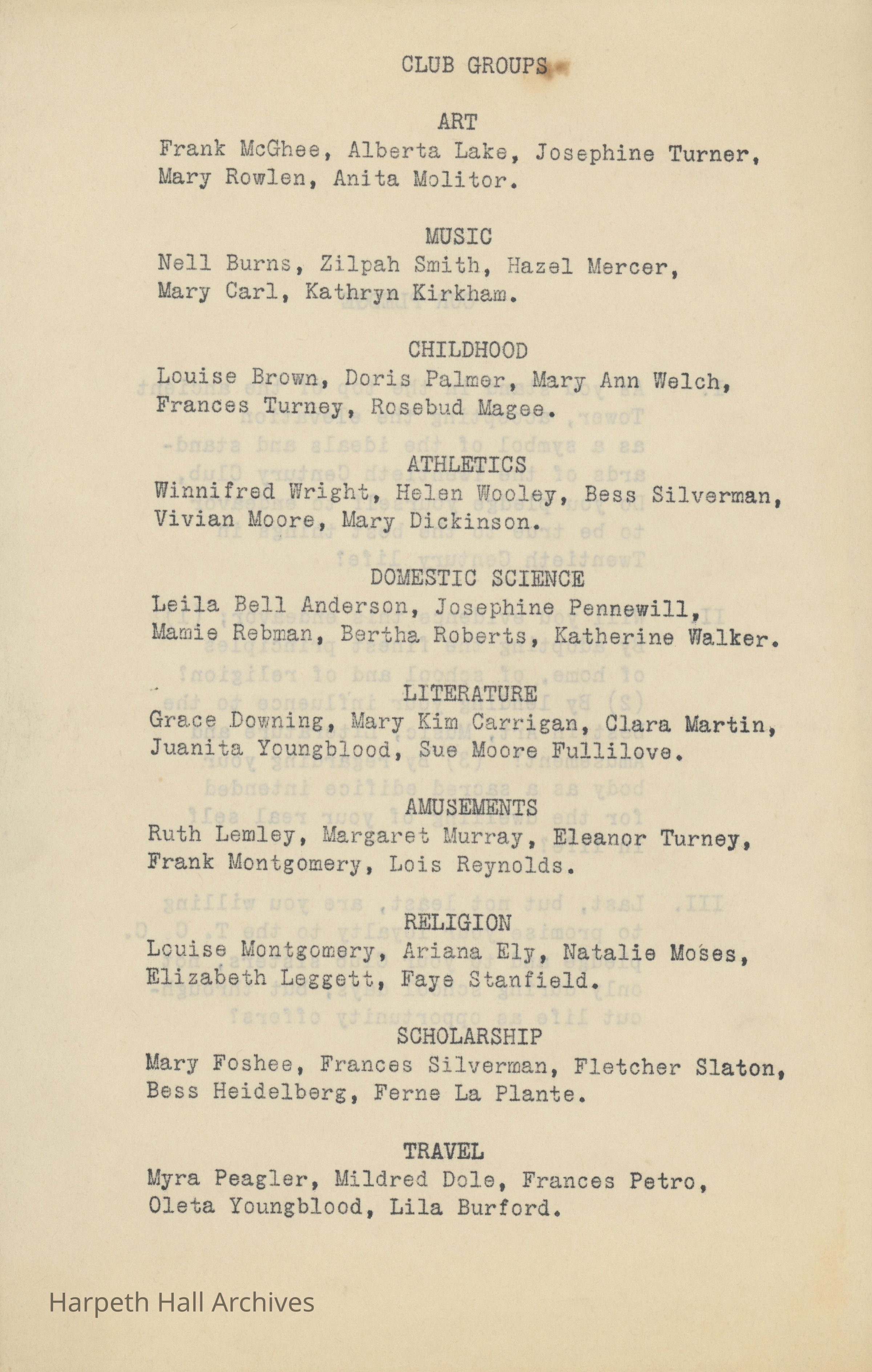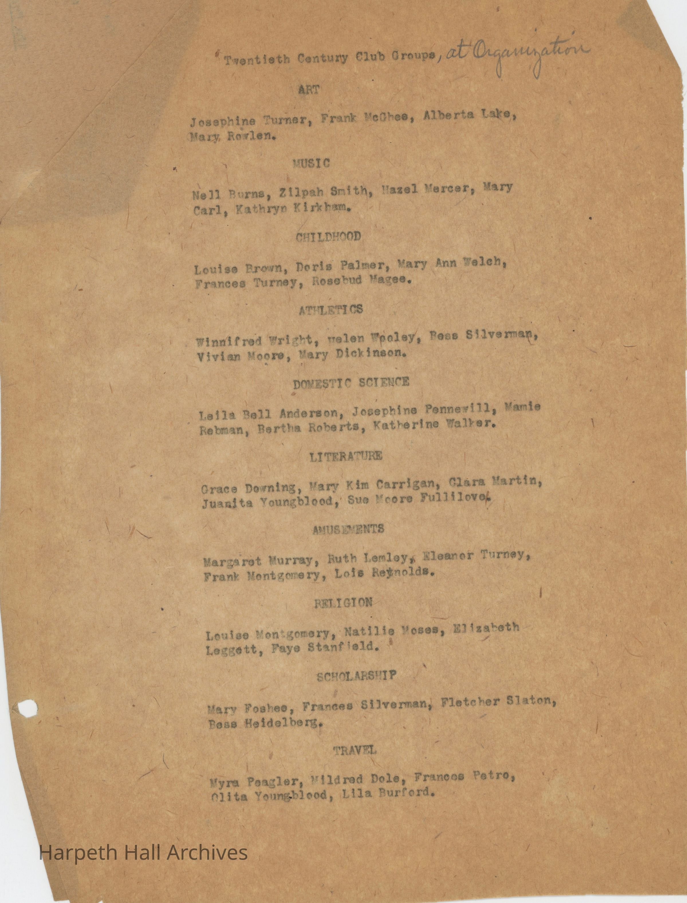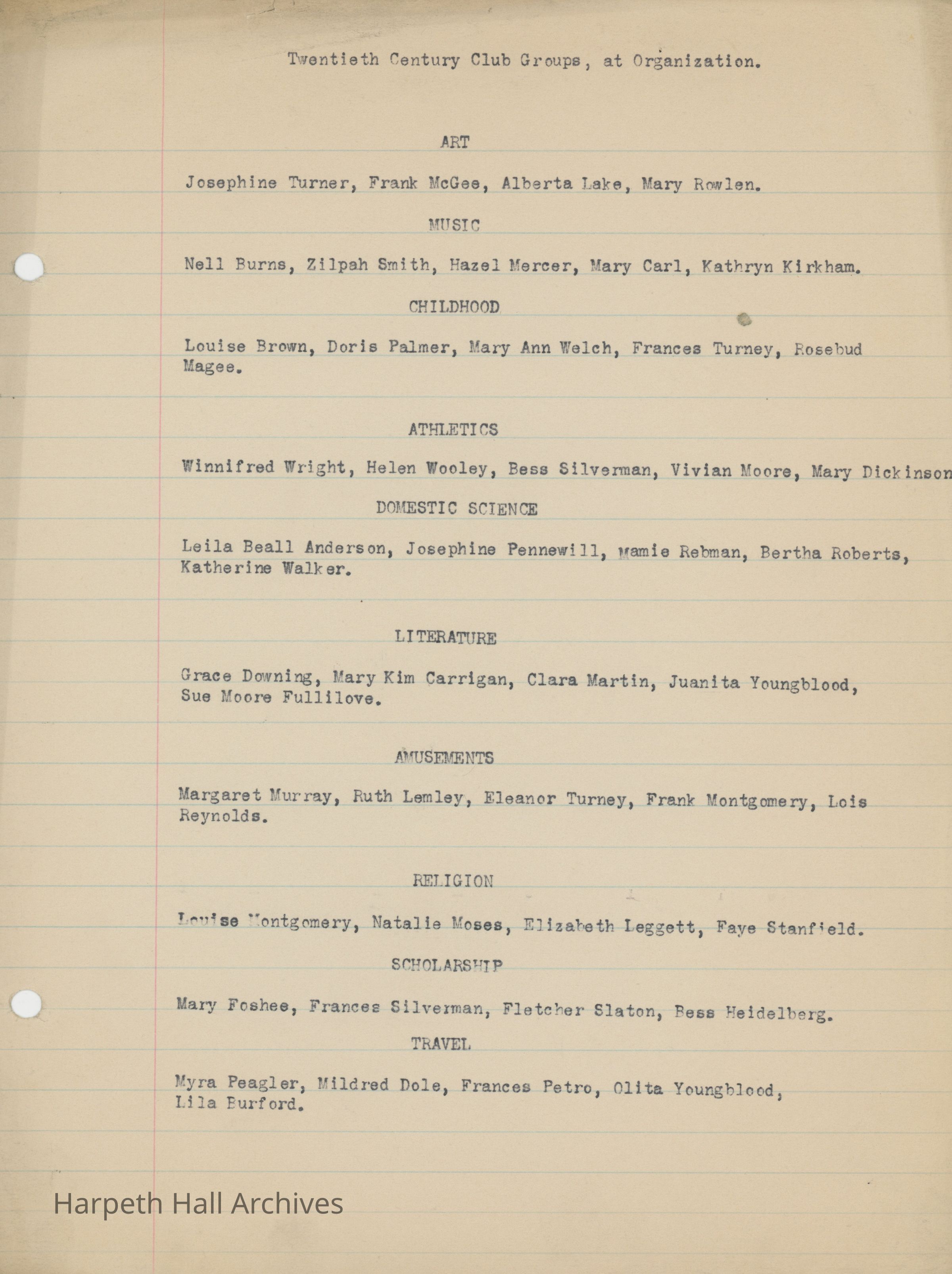 A collection of documents for the Ward-Belmont Twentieth Century Club session of 1916-17. Includes a pamphlet detailing the club announcement, pledge, and a list of club groups with associated members (art, music, childhood, athletics, domestic science, literature, amusements, religion, scholarship, and travel); a pamphlet detailing the programs by club groups throughout January, February, March, April, and May of 1917; and documents listing the aforementioned club groups and associated members as well as various club information.Context
