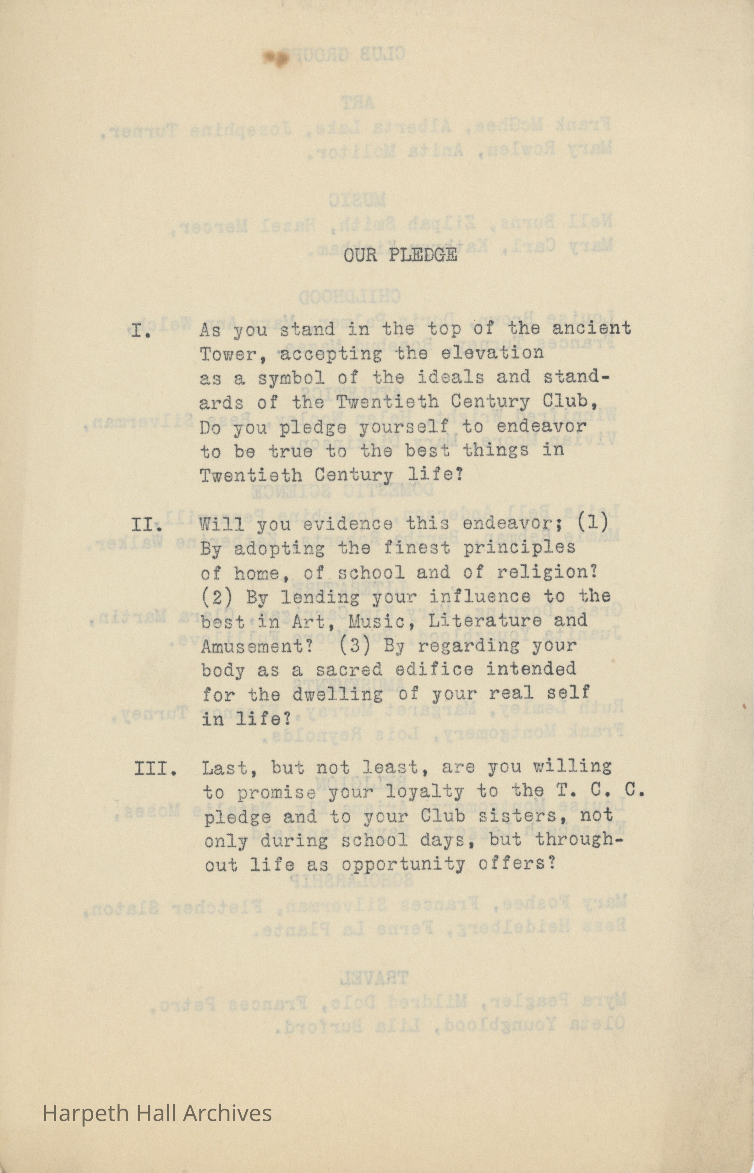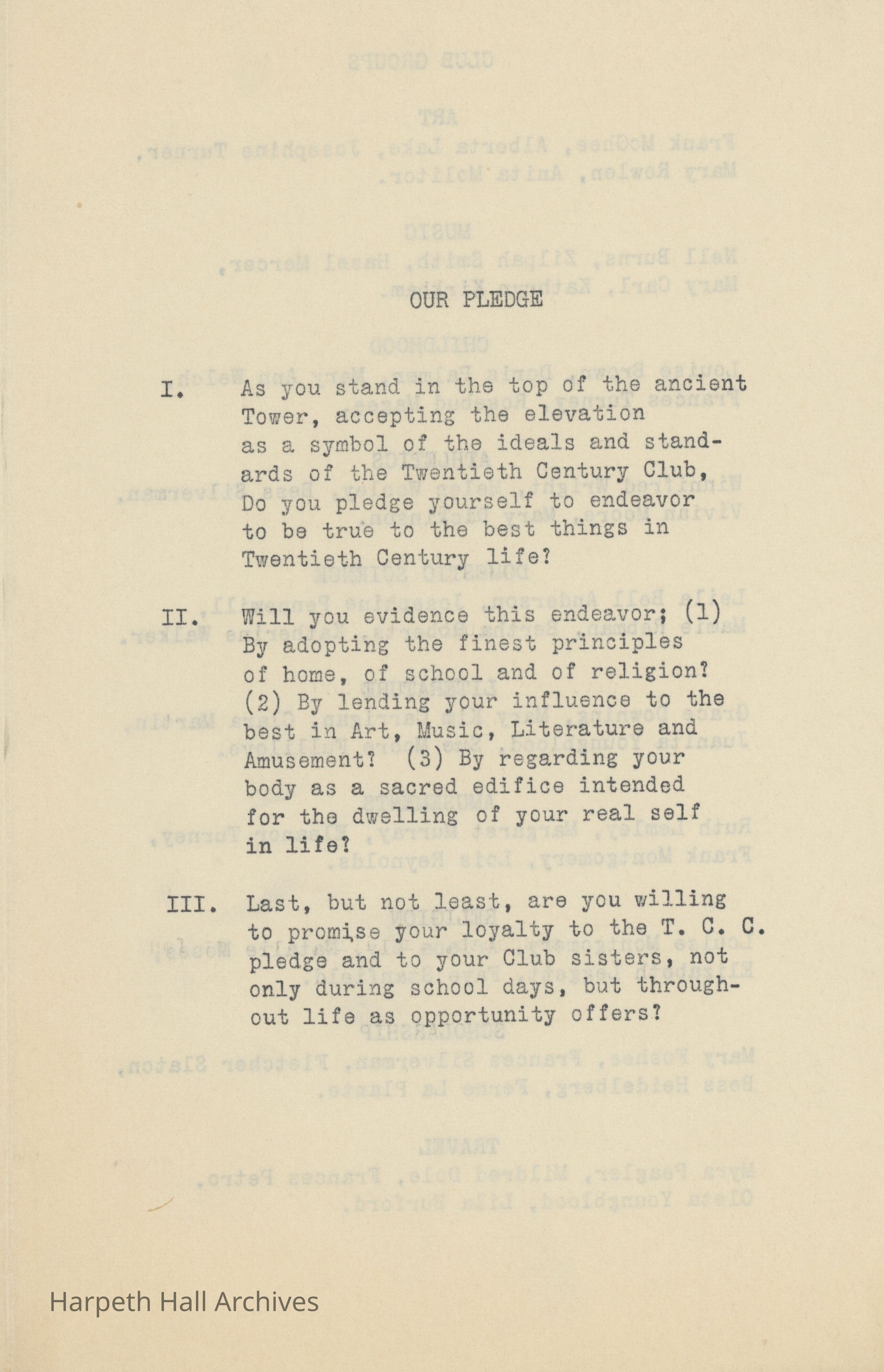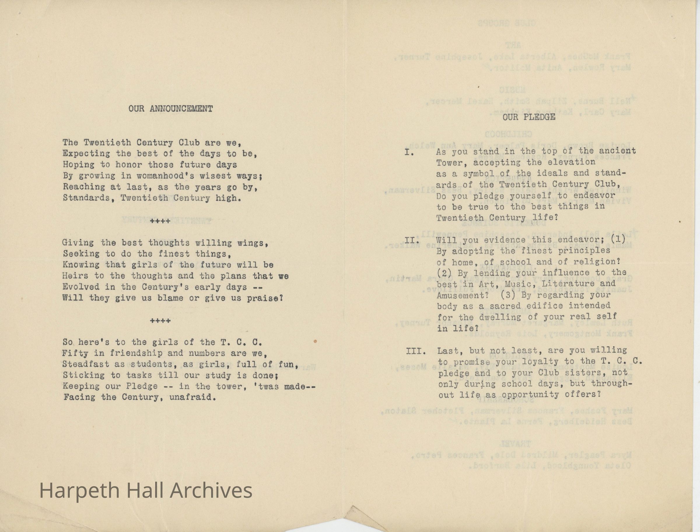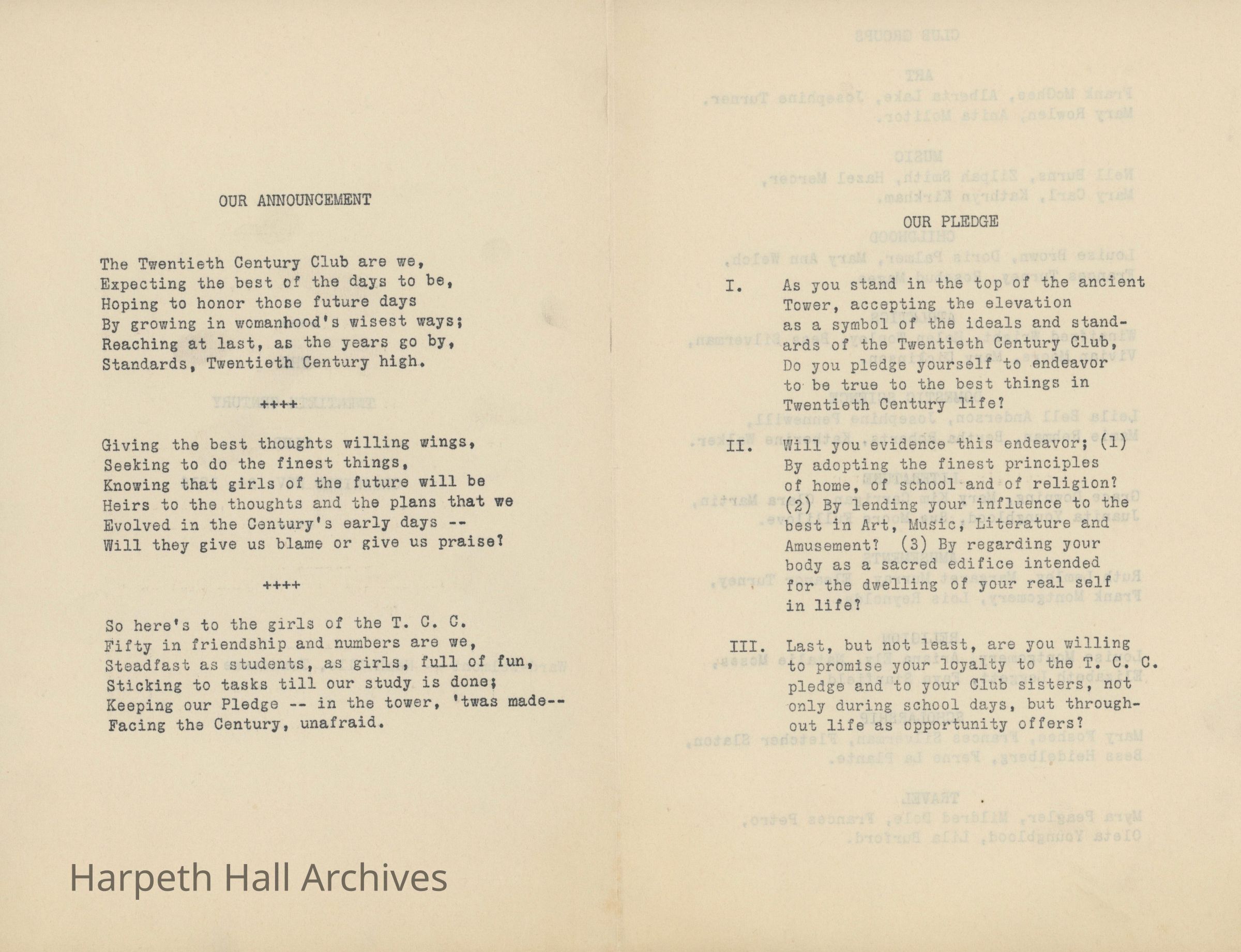 The Twentieth Century Club (T.C.C.) was a student organization and one of ten social clubs at Ward-Belmont, organized November 24, 1916. The club's purpose was an excerpt from English poet Alfred, Lord Tennyson's collection Idylls of the King, specifically “Gareth and Lynette" (1872): "Live pure, speak true, right wrong, follow the King, Else, wherefore born!" The club's motto was "Ideas and Ideals." Per the 1943 Milestones yearbook, club members "strive toward one goal - the maintenance of the high ideals of both their club and their school."Collection