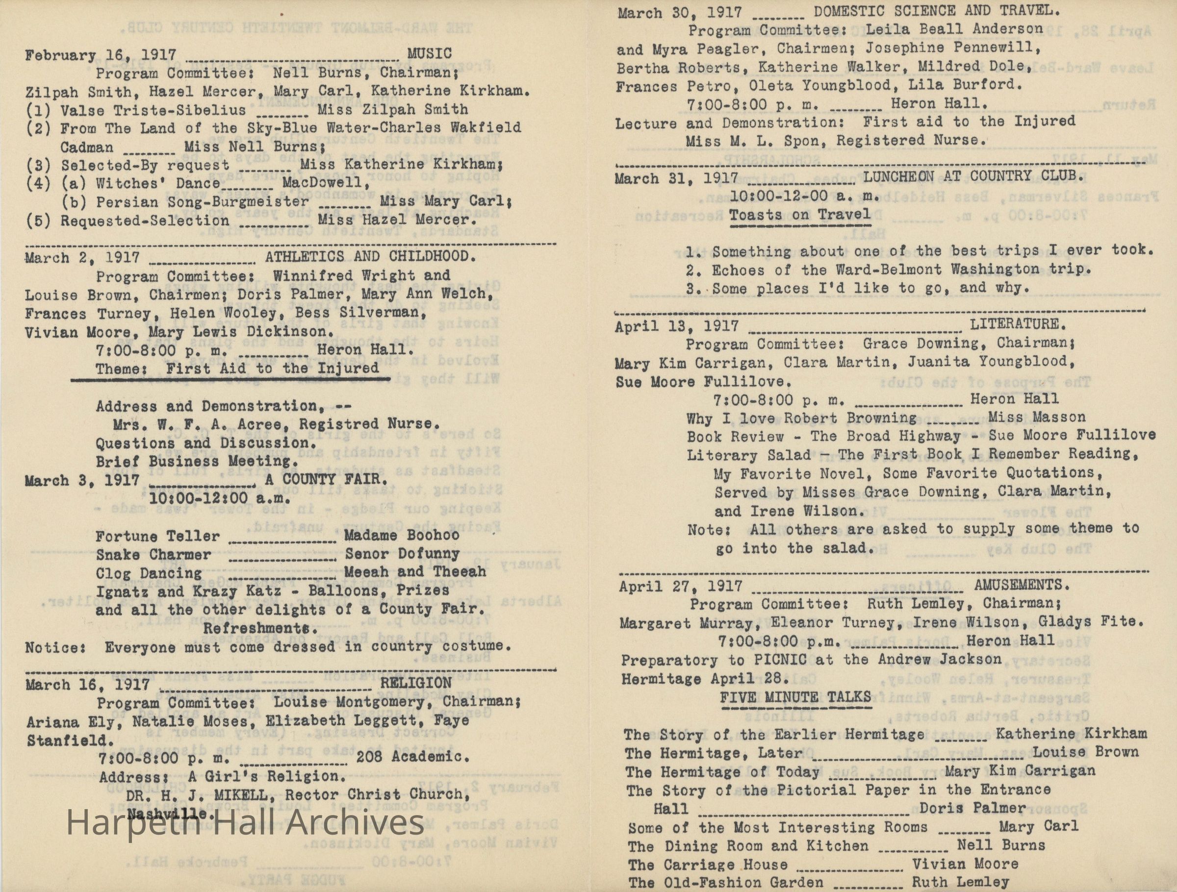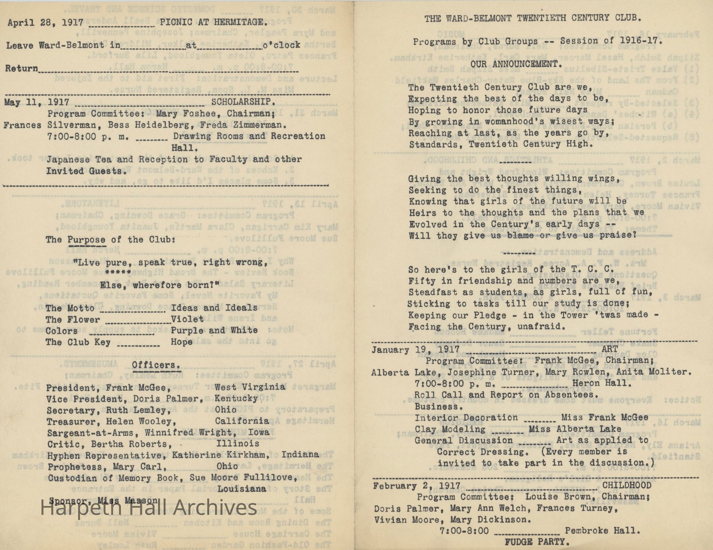 Ward-Belmont, Twentieth Century Club, 1916, 1917