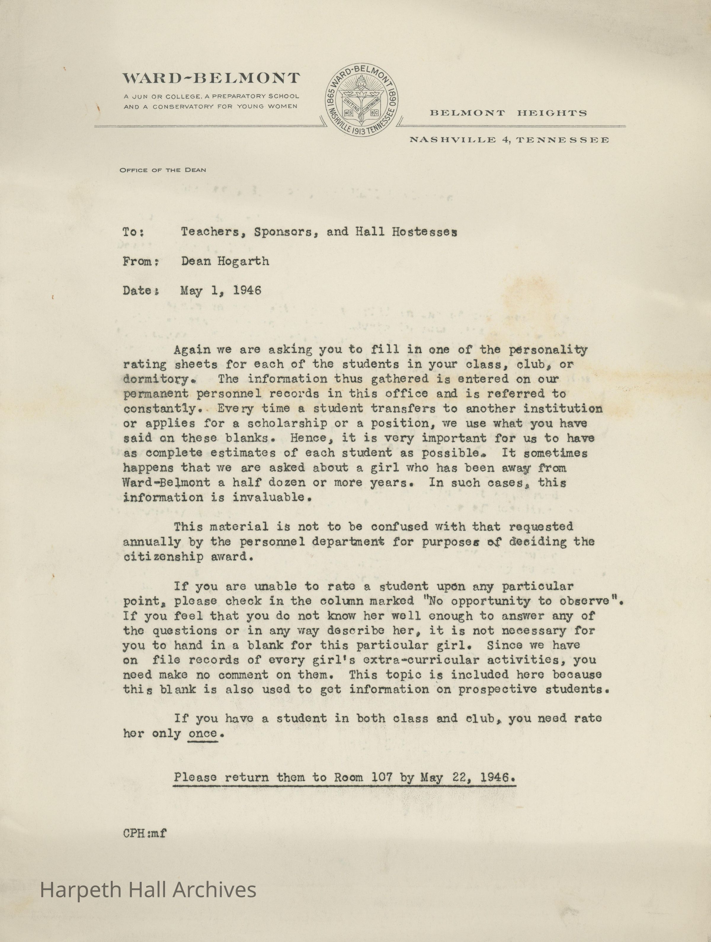A letter written by the Dean of the Junior College, Charles P. Hogarth, addressing the student personality tests. The letter was sent May 1st, 1946, to the faculty.Collection